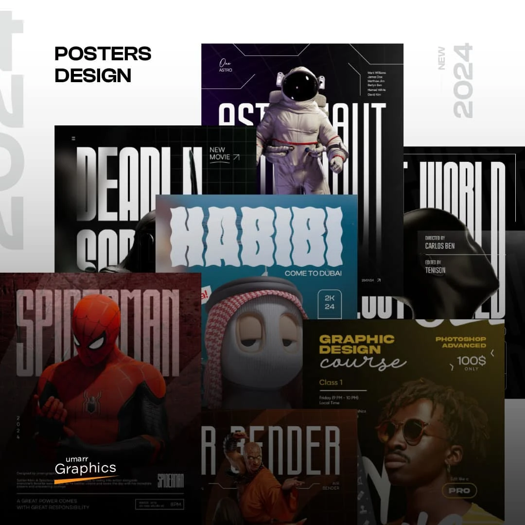 Collection of creative poster designs for businesses, movies, courses, and more.
