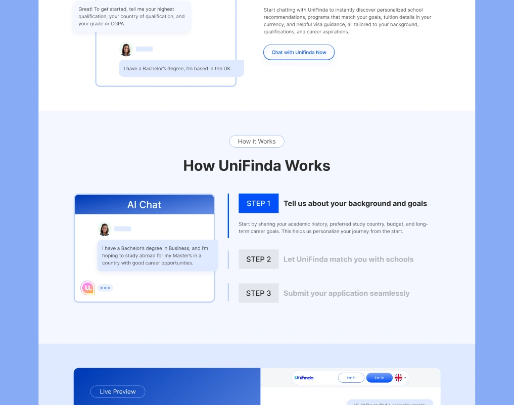 The goal of Unifinda AI was to create a smart and intuitive platform that helps users find the best universities based on their preferences and academic goals. The aim was to simplify the decision-making process by using AI-driven matching while keeping the experience clear, friendly, and easy to navigate.