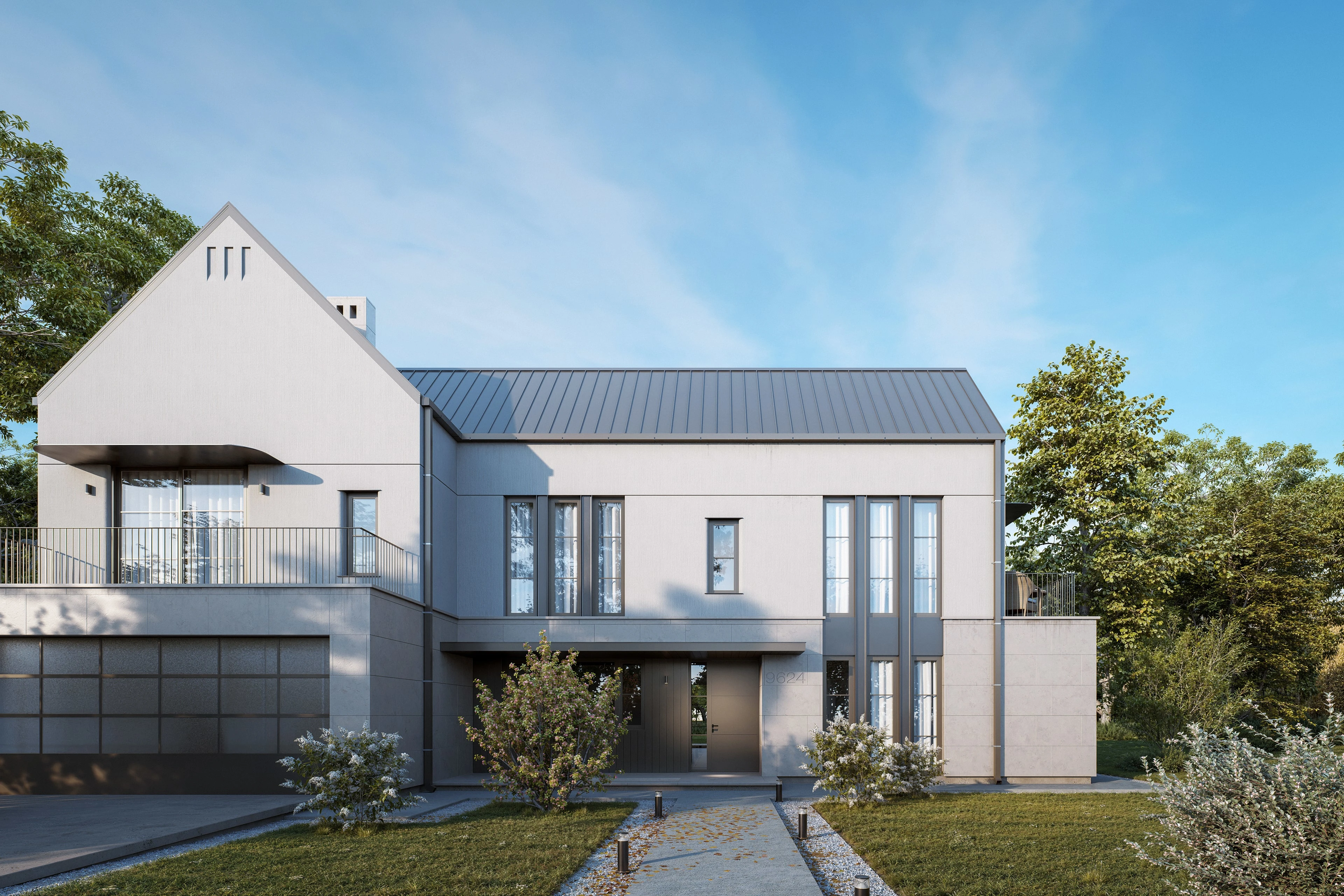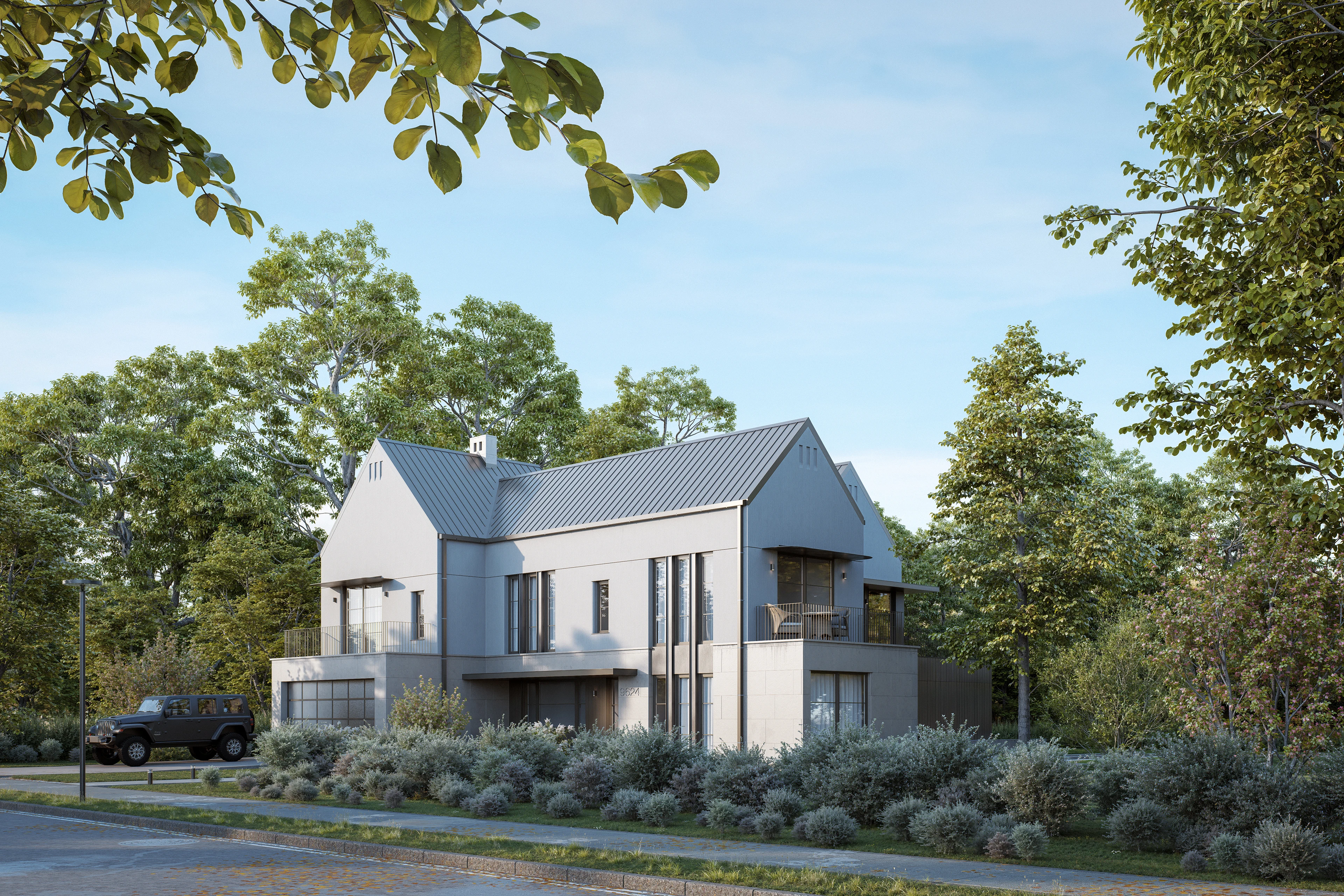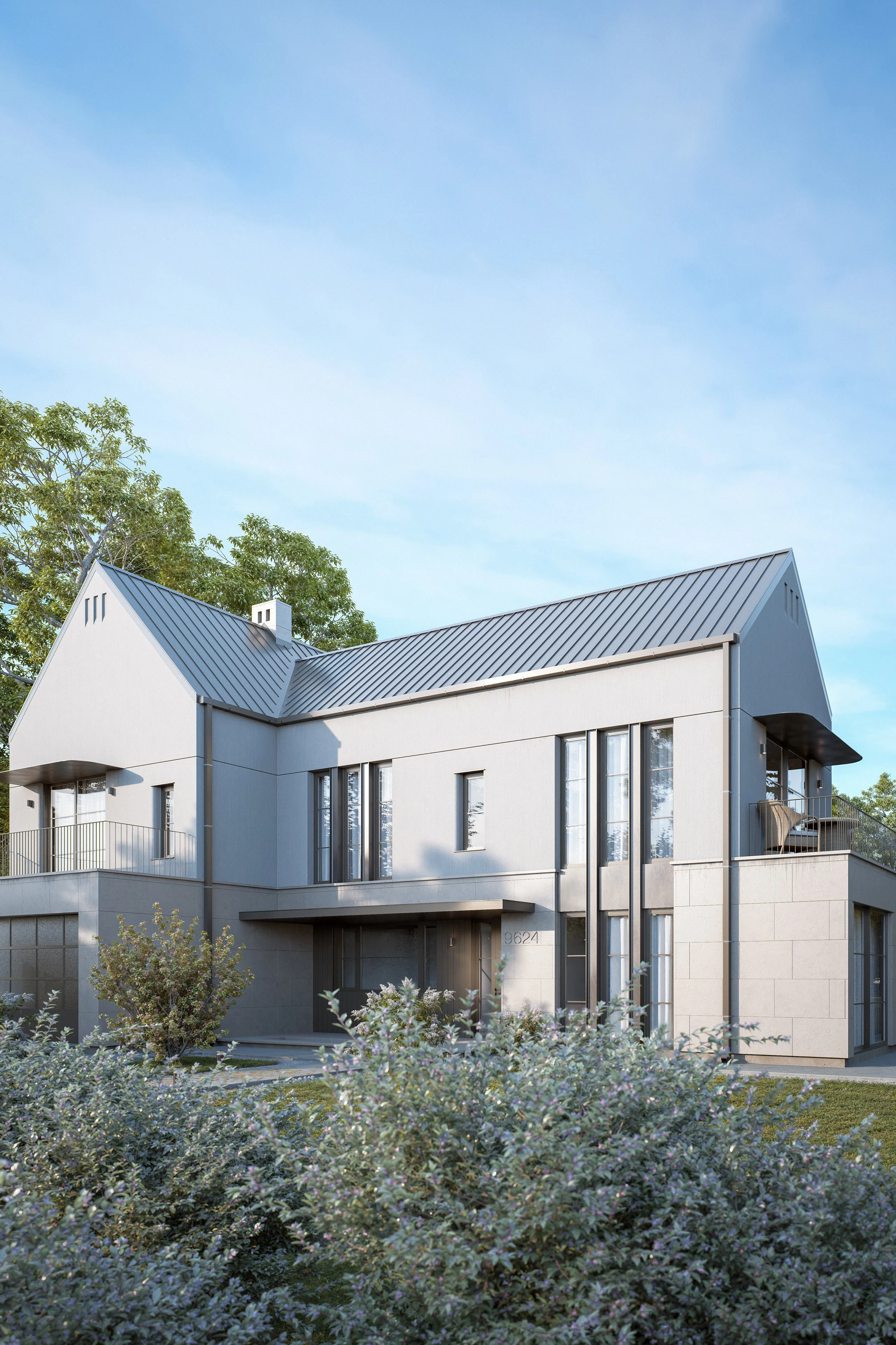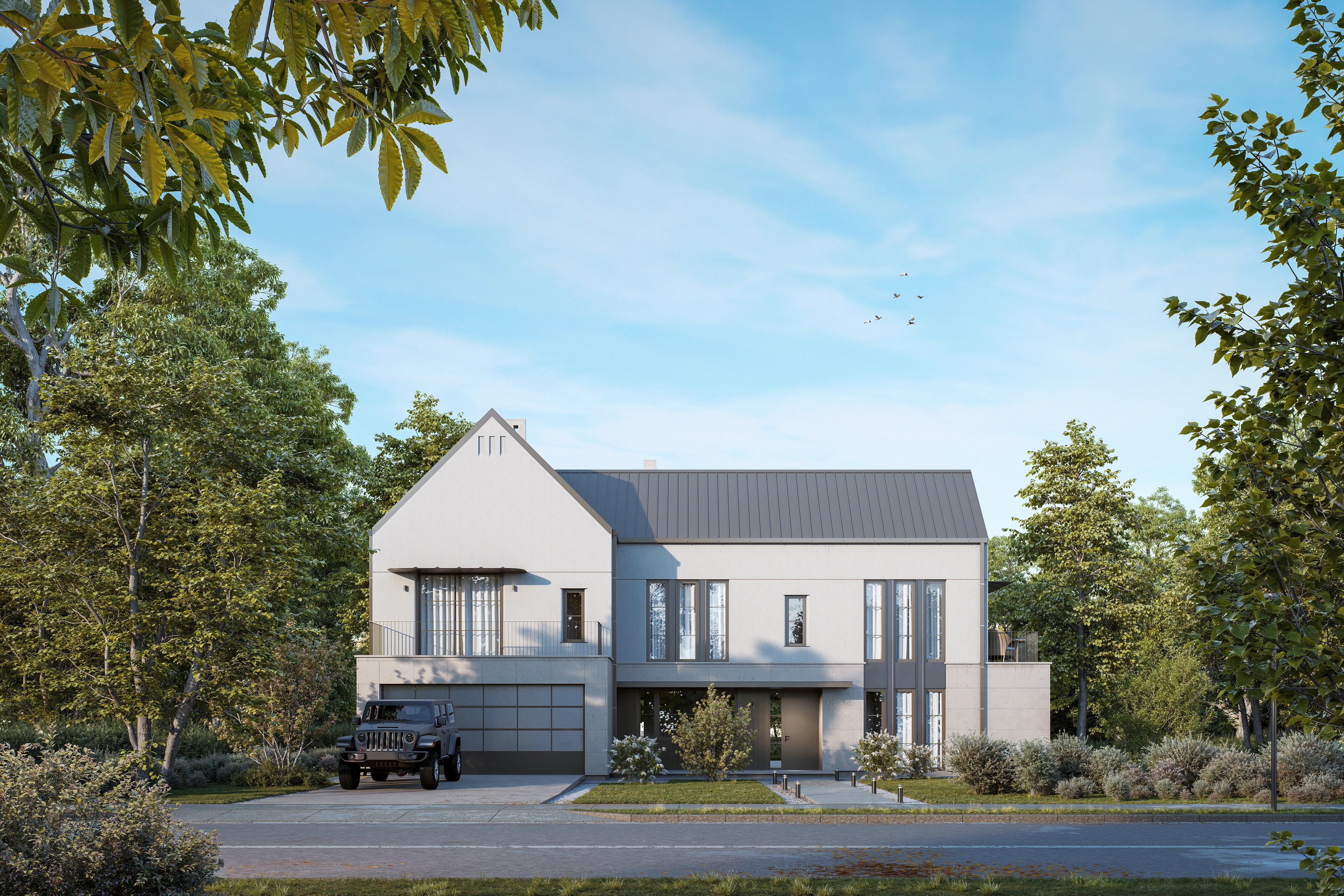 A modern farmhouse design concept that emphasize a connection with the outdoors, while balanced materials like light stucco and stone add warmth and refinement.
