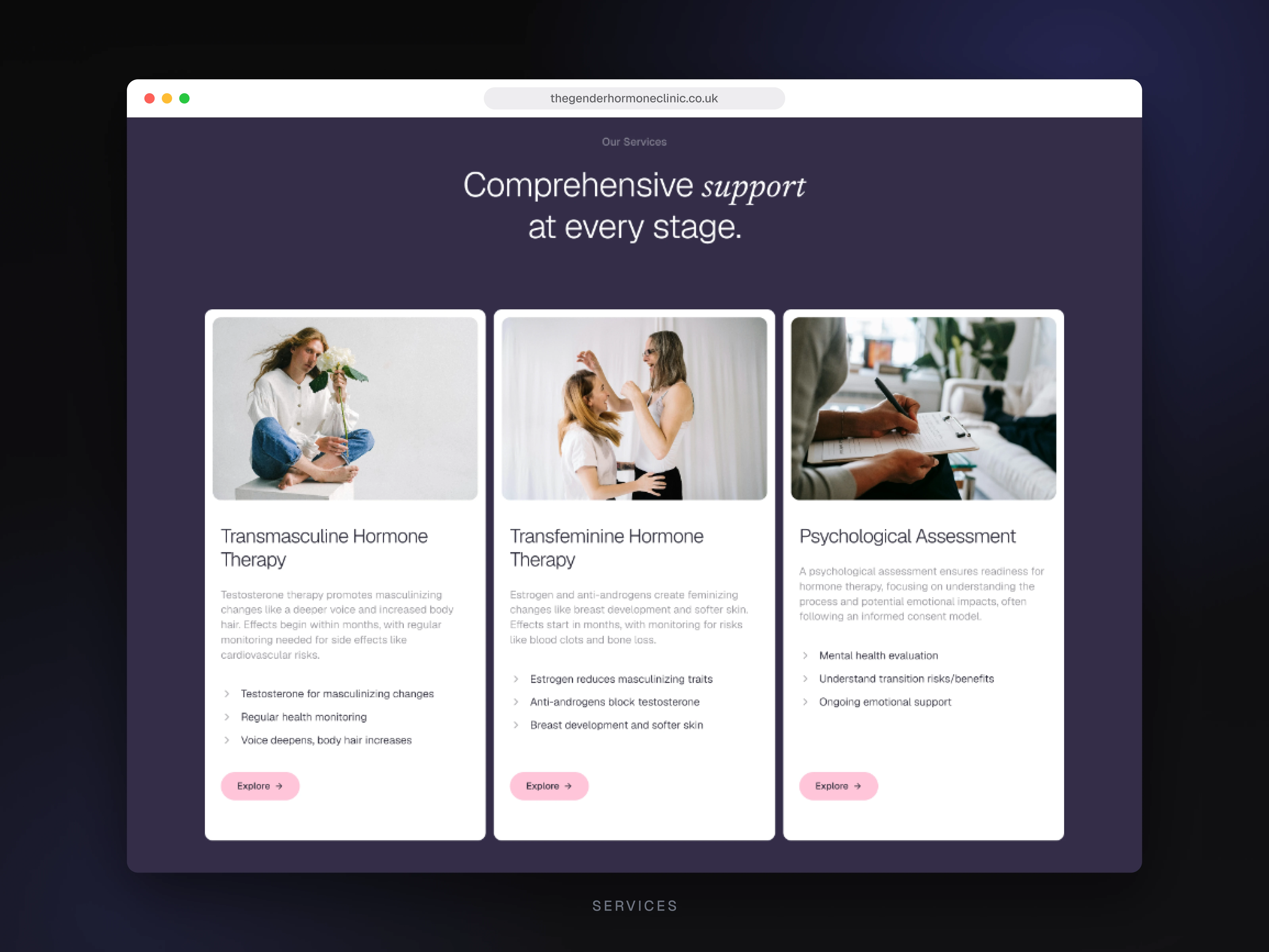 The "Comprehensive support at every stage" section presents the three service tracks (transmasculine hormone therapy, transfeminine hormone therapy and psychological assessment) in a dark editorial layout. Each card pulls from Sanity, so the team can add new specialisms or adjust messaging the moment the offering changes.