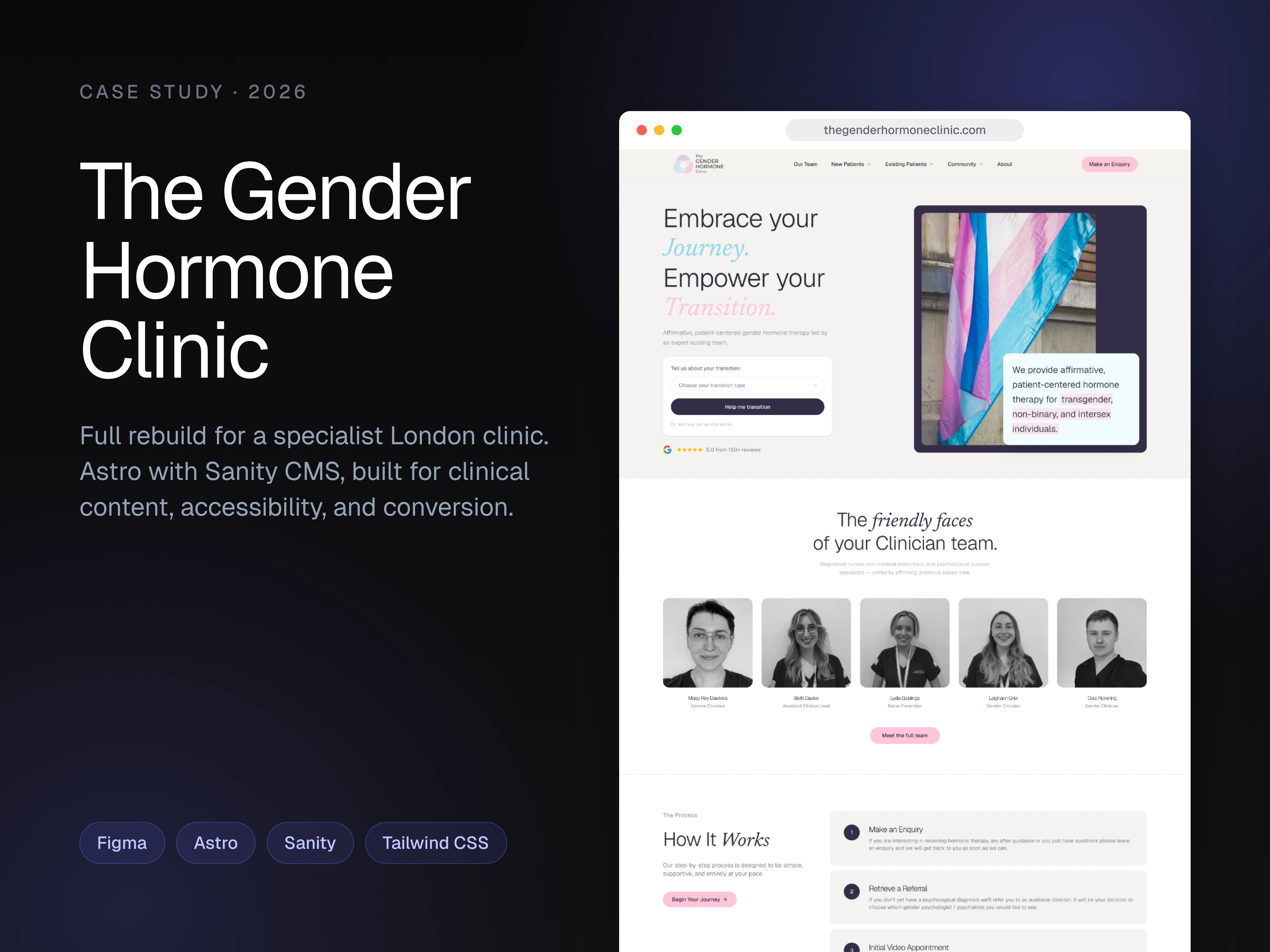 A marketing and referral site for a UK private clinic specialising in gender-affirming hormone therapy, with a Sanity-driven CMS the clinical team can run solo.