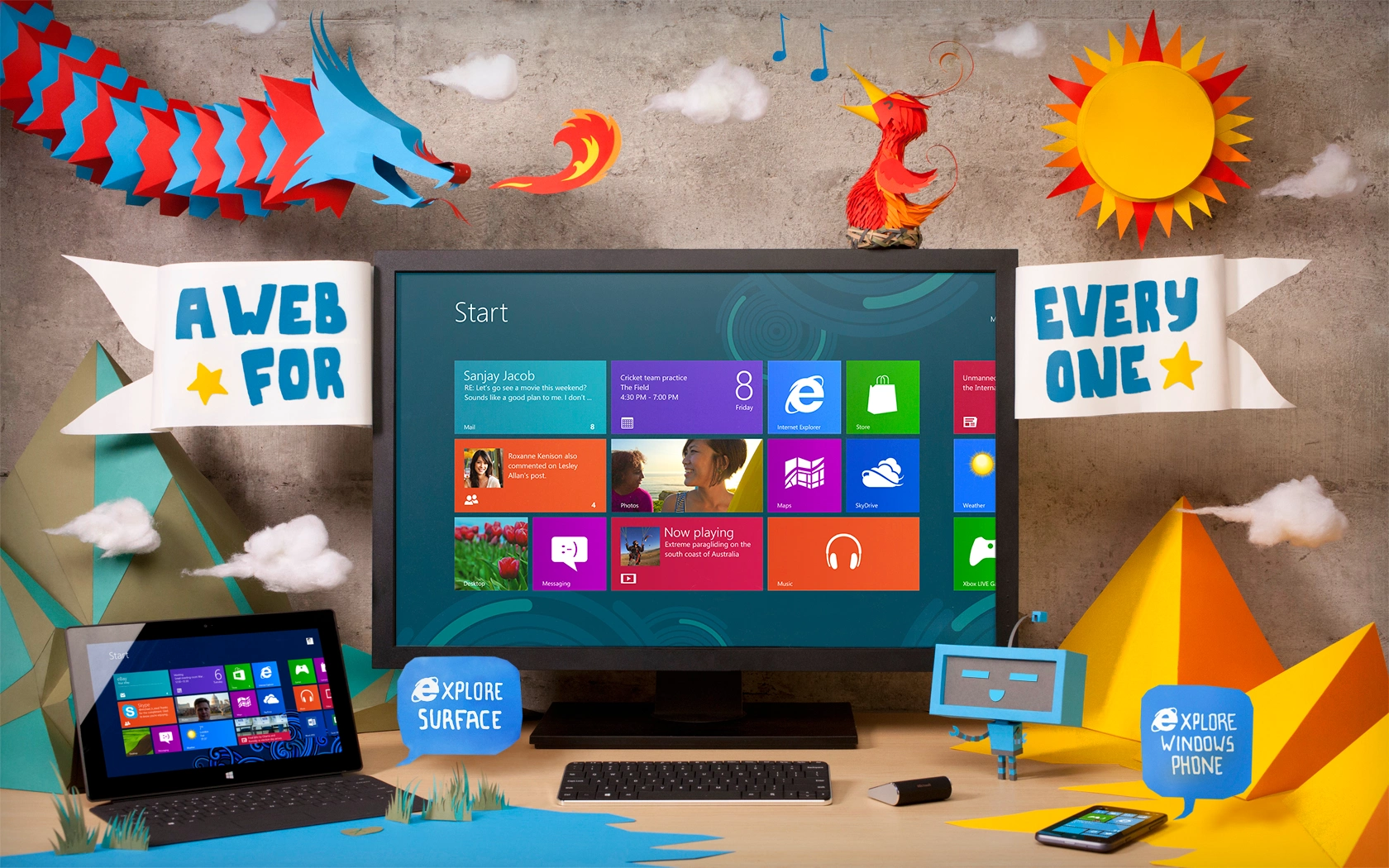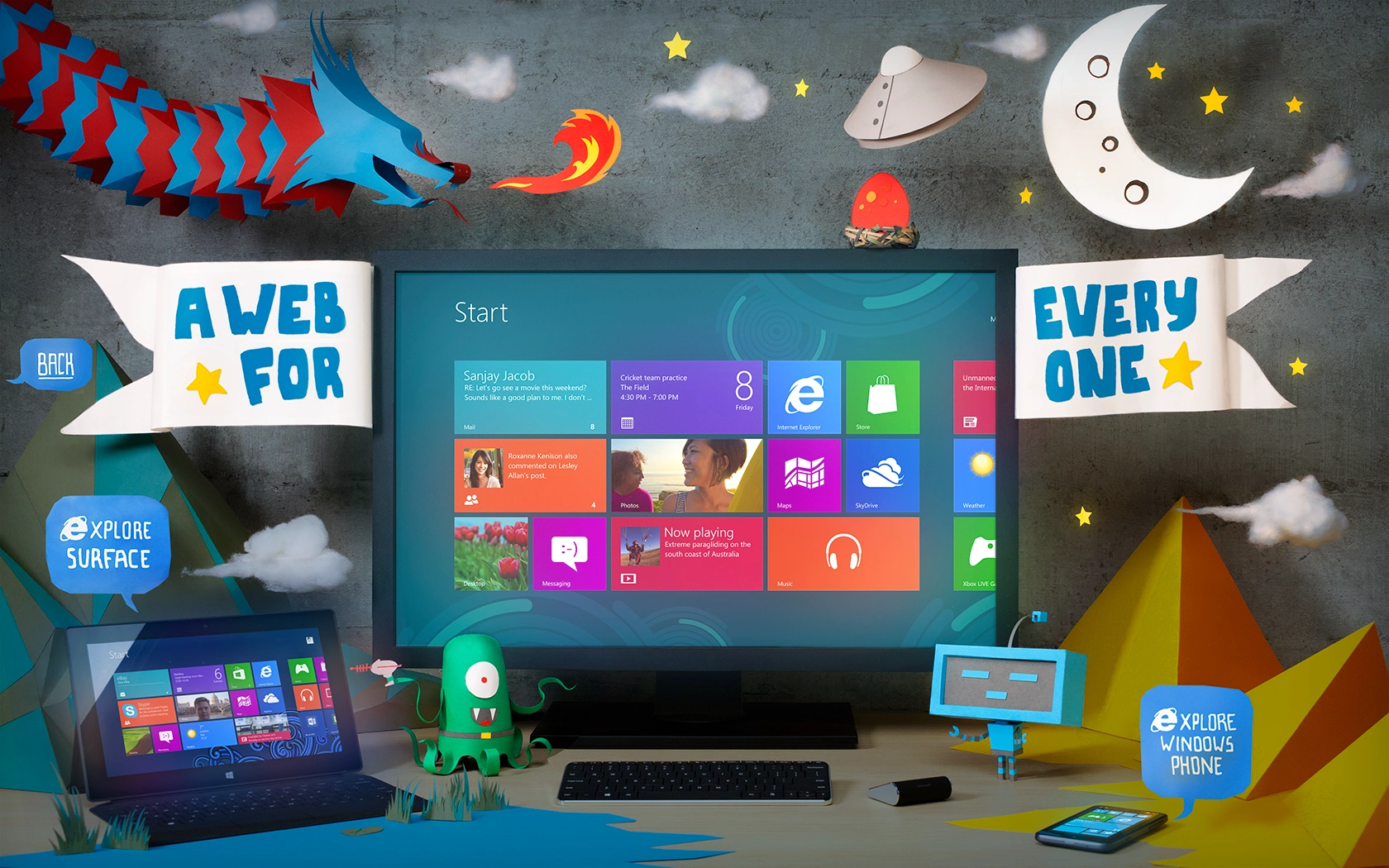 Microsoft asked for a diverse, illustrated web experience highlighting many of Internet Explorer’s new features and capabilities. As one of several illustrators selected, I explored the mantra, "A Web For Everyone." Using paper, glue, a camera and a bit of imagination, I crafted world full of diverse and colorful characters.
