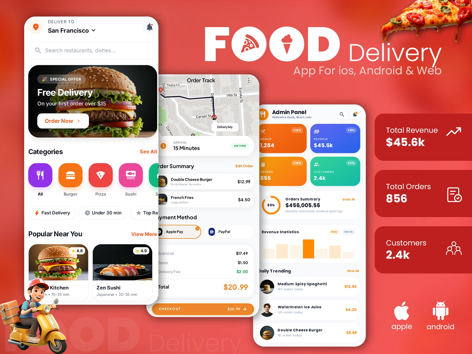 On-demand food delivery app connecting users with restaurants for fast, contactless ordering with Admin Panel, Menu, Cart, Orders, Tracking, Payment, and Rating