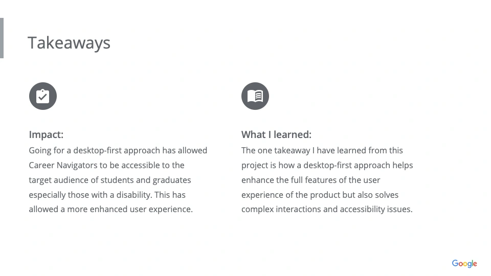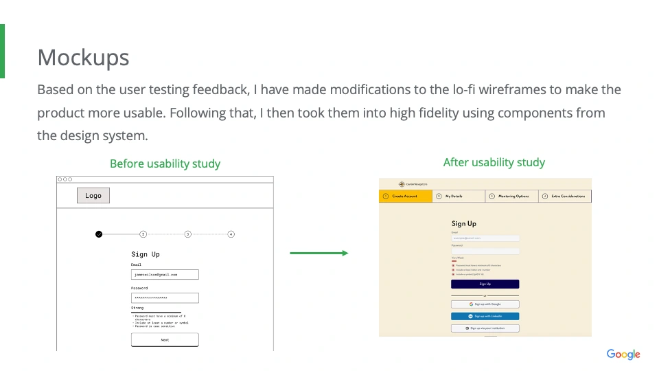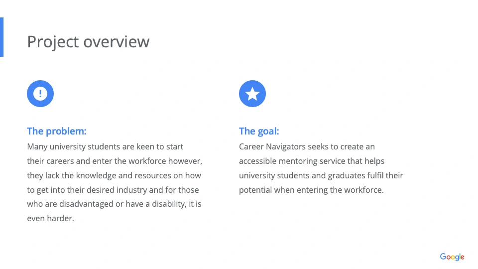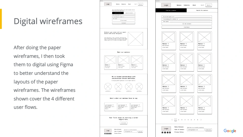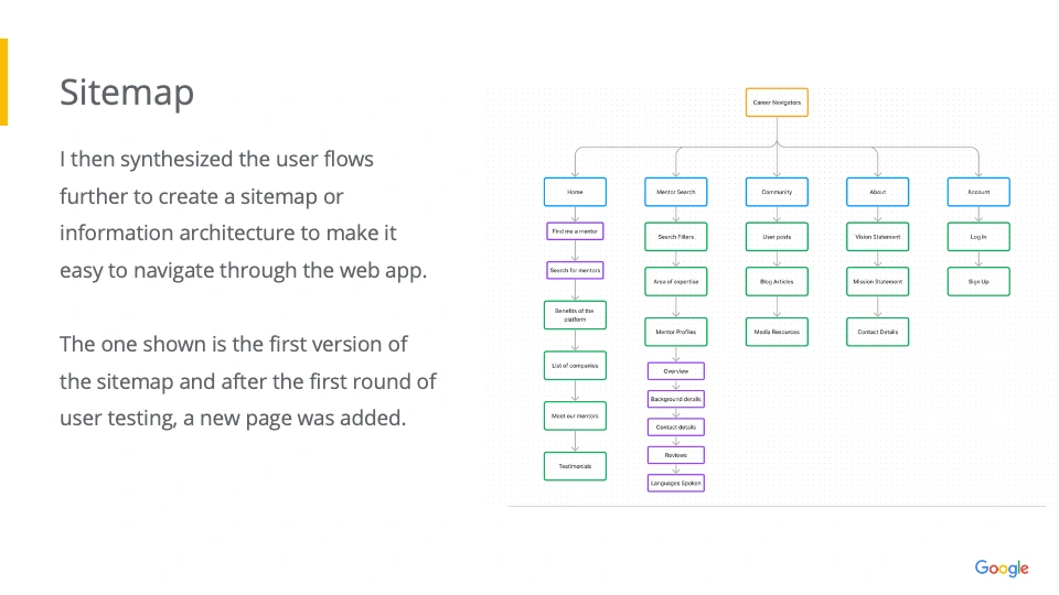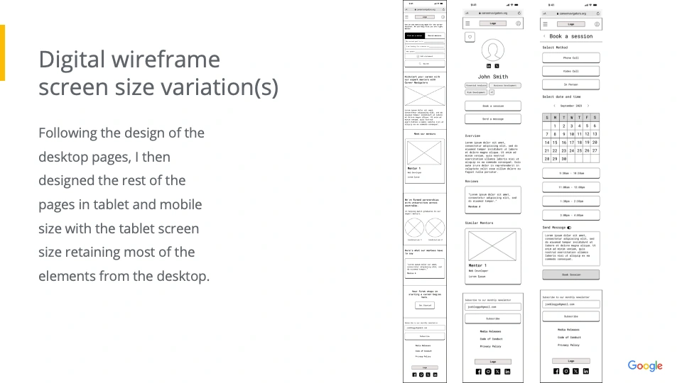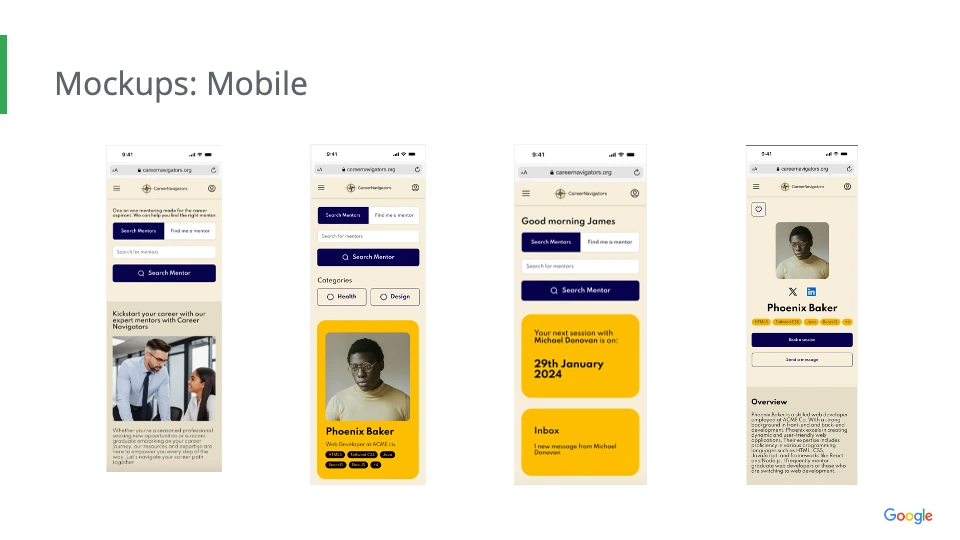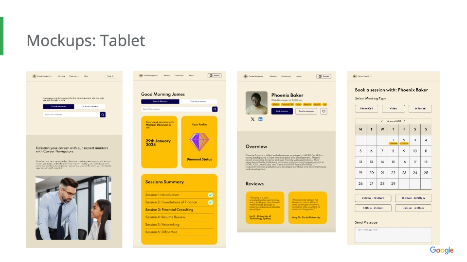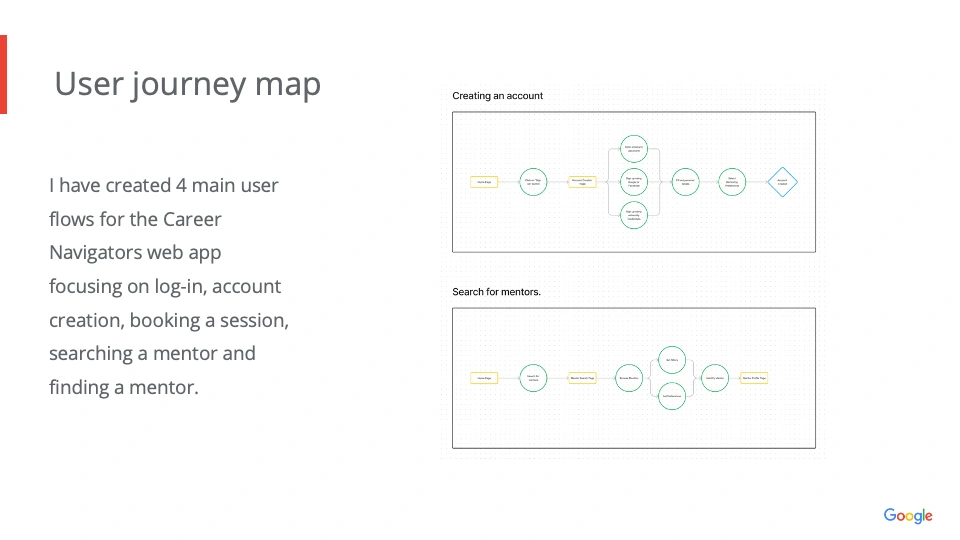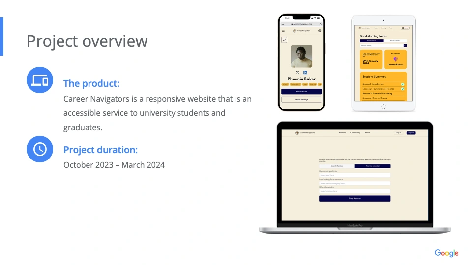 Career Navigators is an accessible online mentoring service that caters to university students who are in their final year of study and recent graduates who are looking to start their careers after studying. This project is part of the Google UX design certificate course in which I have undertaken.