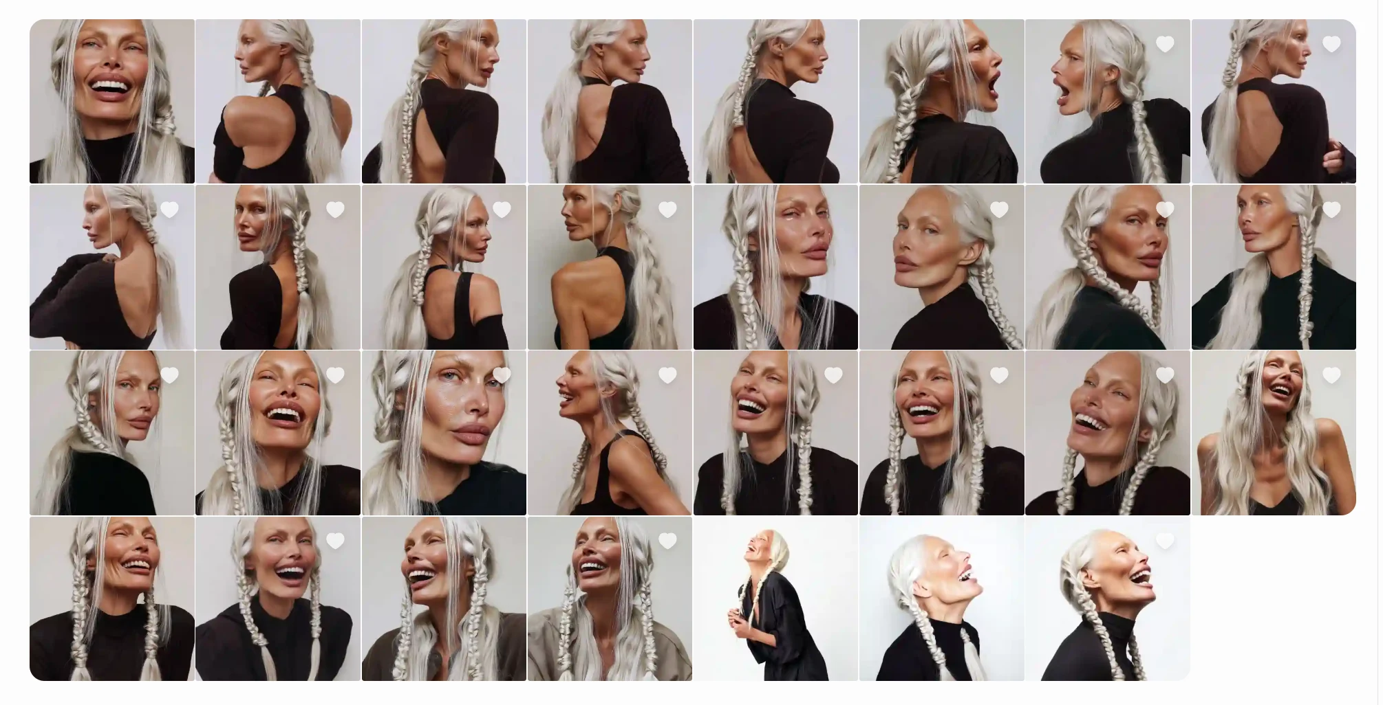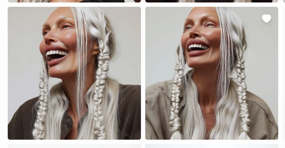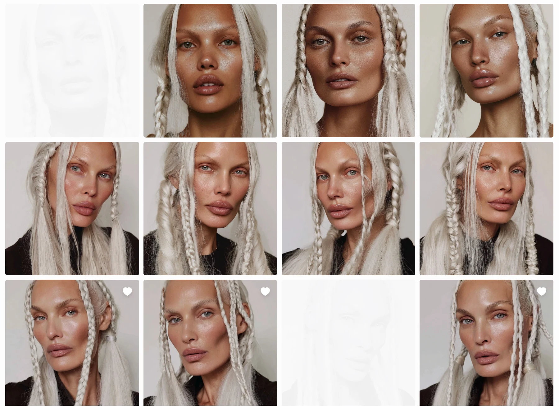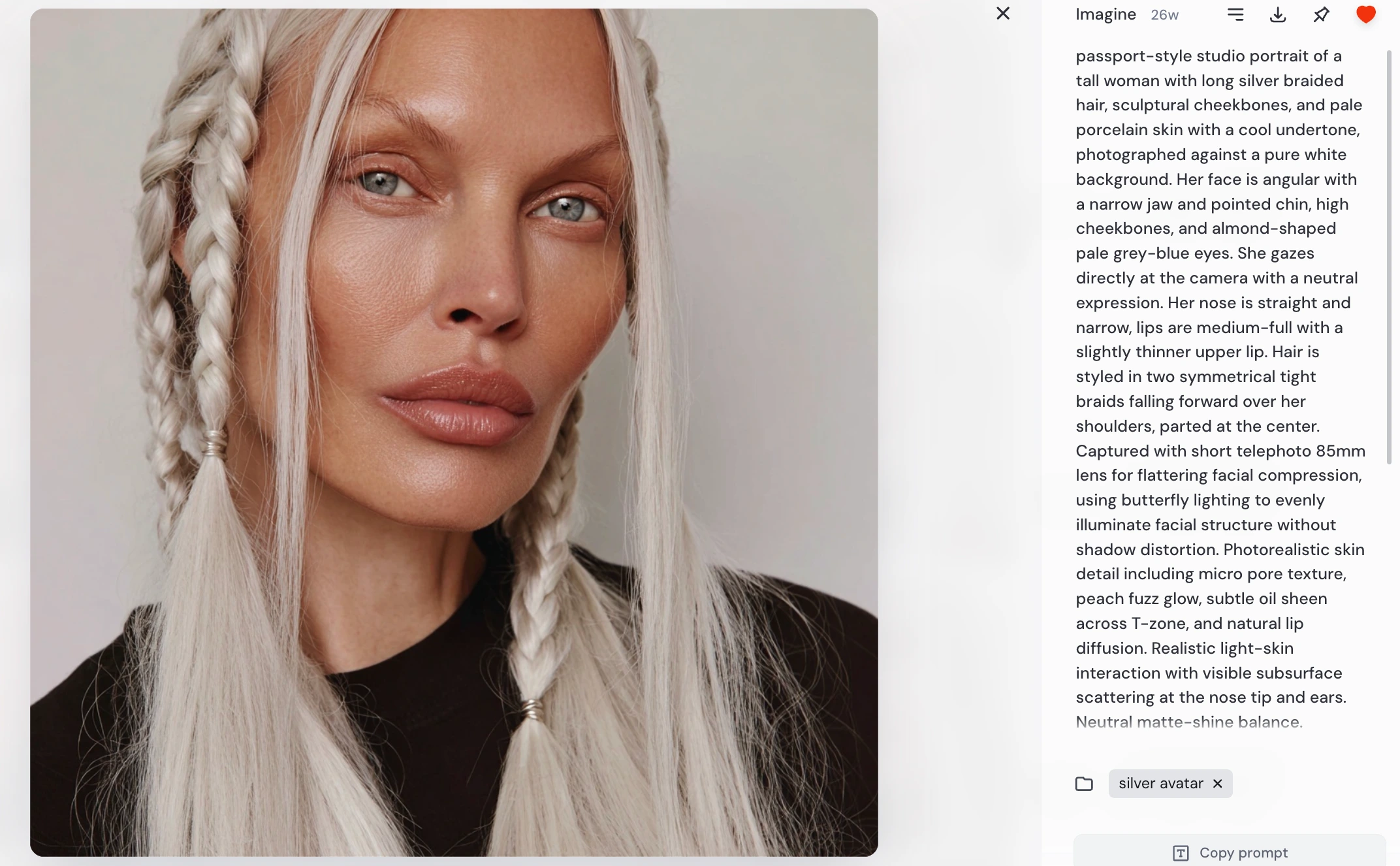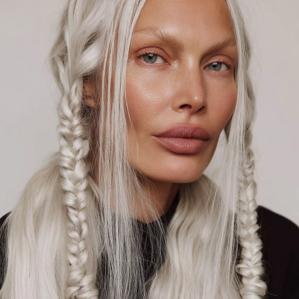 passport-style studio portrait of a tall woman with long silver braided hair, sculptural cheekbones, and pale porcelain skin with a cool undertone, photographed against a pure white background. Her face is angular with a narrow jaw and pointed chin, high cheekbones, and almond-shaped pale grey-blue eyes. She gazes directly at the camera with a neutral expression. Her nose is straight and narrow, lips are medium-full with a slightly thinner upper lip. Hair is styled in two symmetrical tight braids falling forward over her shoulders, parted at the center. Captured with short telephoto 85mm lens for flattering facial compression, using butterfly lighting to evenly illuminate facial structure without shadow distortion. Photorealistic skin detail including micro pore texture, peach fuzz glow, subtle oil sheen across T-zone, and natural lip diffusion. Realistic light-skin interaction with visible subsurface scattering at the nose tip and ears. Neutral matte-shine balance. Framing is symmetrical with clean white backdrop and full-resolution studio clarity.