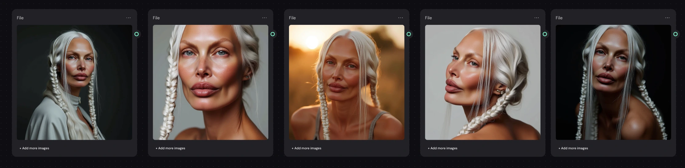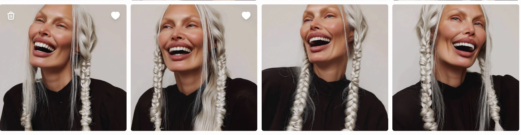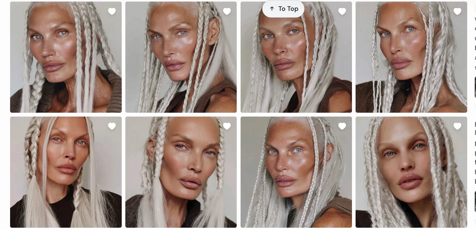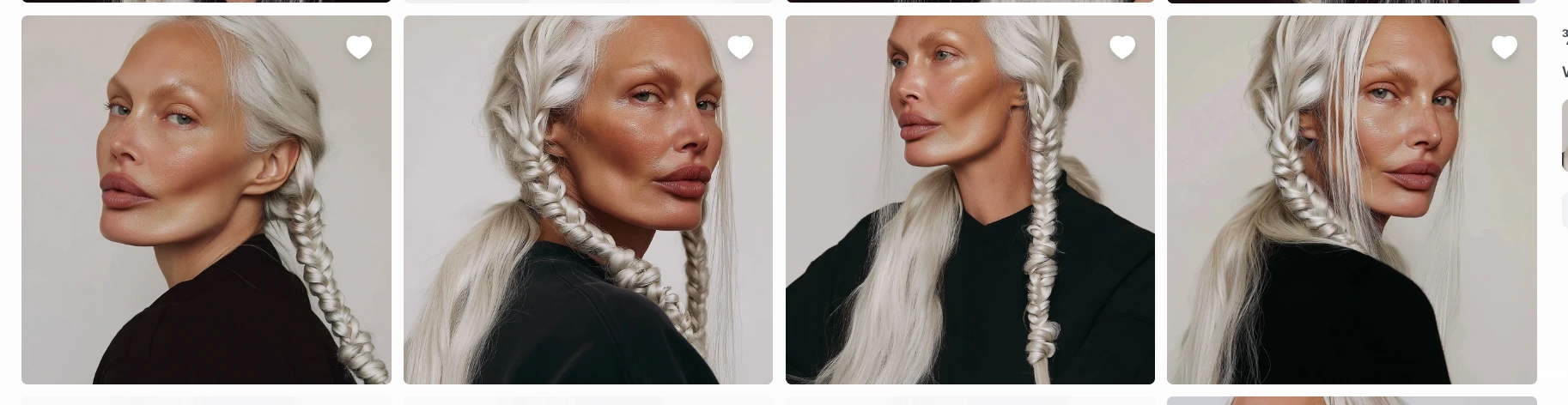 passport-style studio portrait of a tall woman with long silver braided hair, sculptural cheekbones, and pale porcelain skin with a cool undertone, photographed against a pure white background. Her face is angular with a narrow jaw and pointed chin, high cheekbones, and almond-shaped pale grey-blue eyes. She gazes directly at the camera with a neutral expression. Her nose is straight and narrow, lips are medium-full with a slightly thinner upper lip. Hair is styled in two symmetrical tight braids falling forward over her shoulders, parted at the center. Captured with short telephoto 85mm lens for flattering facial compression, using butterfly lighting to evenly illuminate facial structure without shadow distortion. Photorealistic skin detail including micro pore texture, peach fuzz glow, subtle oil sheen across T-zone, and natural lip diffusion. Realistic light-skin interaction with visible subsurface scattering at the nose tip and ears. Neutral matte-shine balance. Framing is symmetrical with clean white backdrop and full-resolution studio clarity.