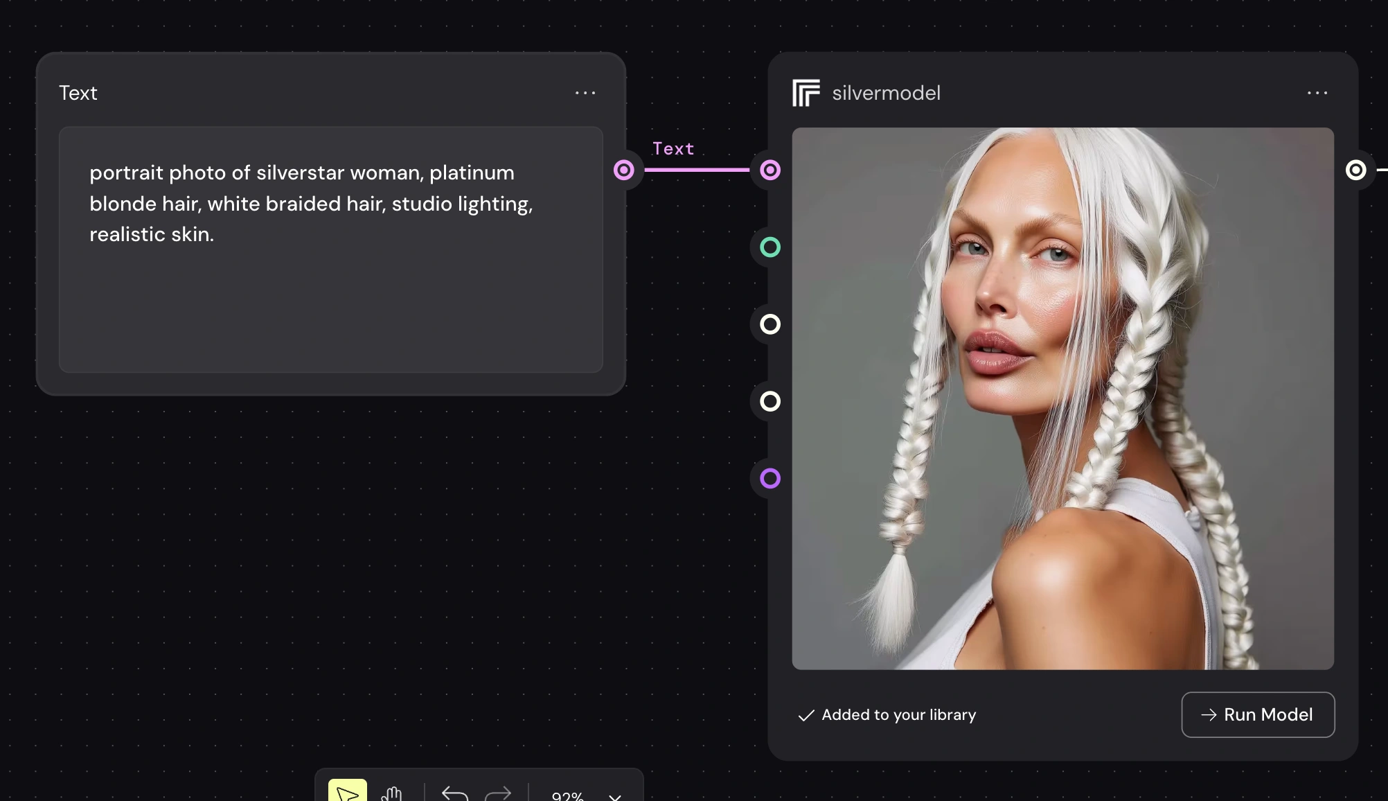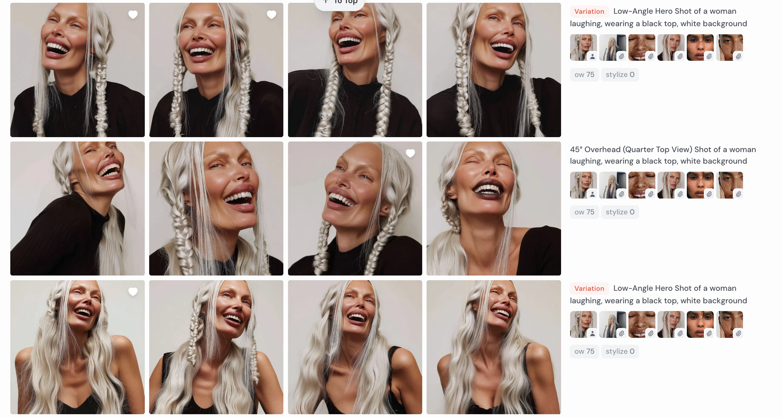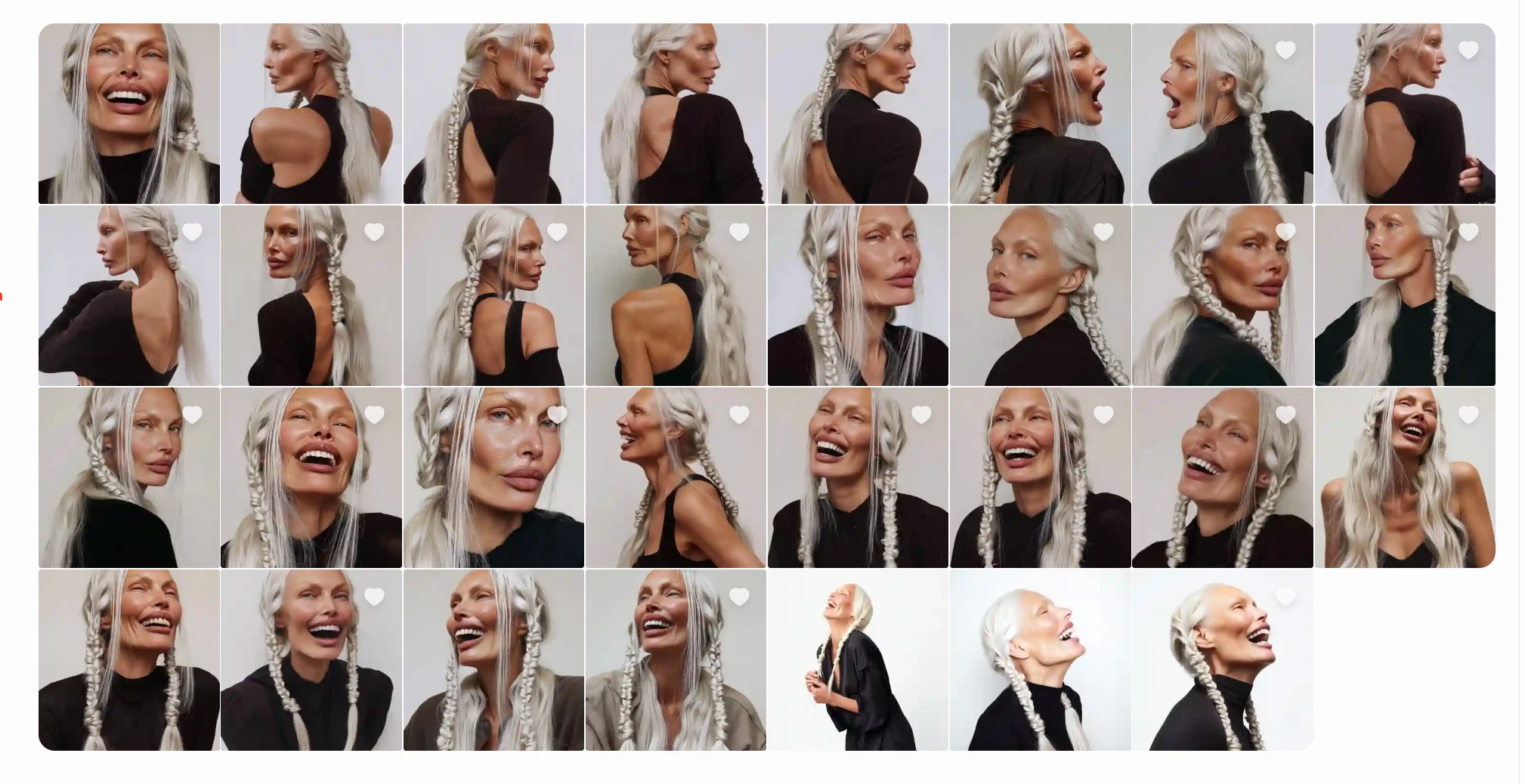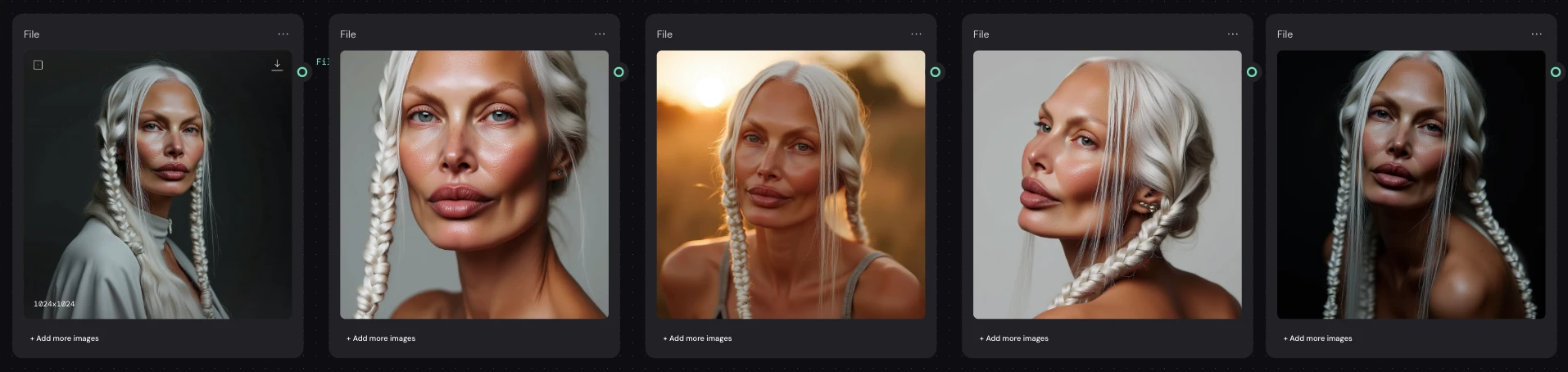 passport-style studio portrait of a tall woman with long silver braided hair, sculptural cheekbones, and pale porcelain skin with a cool undertone, photographed against a pure white background. Her face is angular with a narrow jaw and pointed chin, high cheekbones, and almond-shaped pale grey-blue eyes. She gazes directly at the camera with a neutral expression. Her nose is straight and narrow, lips are medium-full with a slightly thinner upper lip. Hair is styled in two symmetrical tight braids falling forward over her shoulders, parted at the center. Captured with short telephoto 85mm lens for flattering facial compression, using butterfly lighting to evenly illuminate facial structure without shadow distortion. Photorealistic skin detail including micro pore texture, peach fuzz glow, subtle oil sheen across T-zone, and natural lip diffusion. Realistic light-skin interaction with visible subsurface scattering at the nose tip and ears. Neutral matte-shine balance. Framing is symmetrical with clean white backdrop and full-resolution studio clarity.