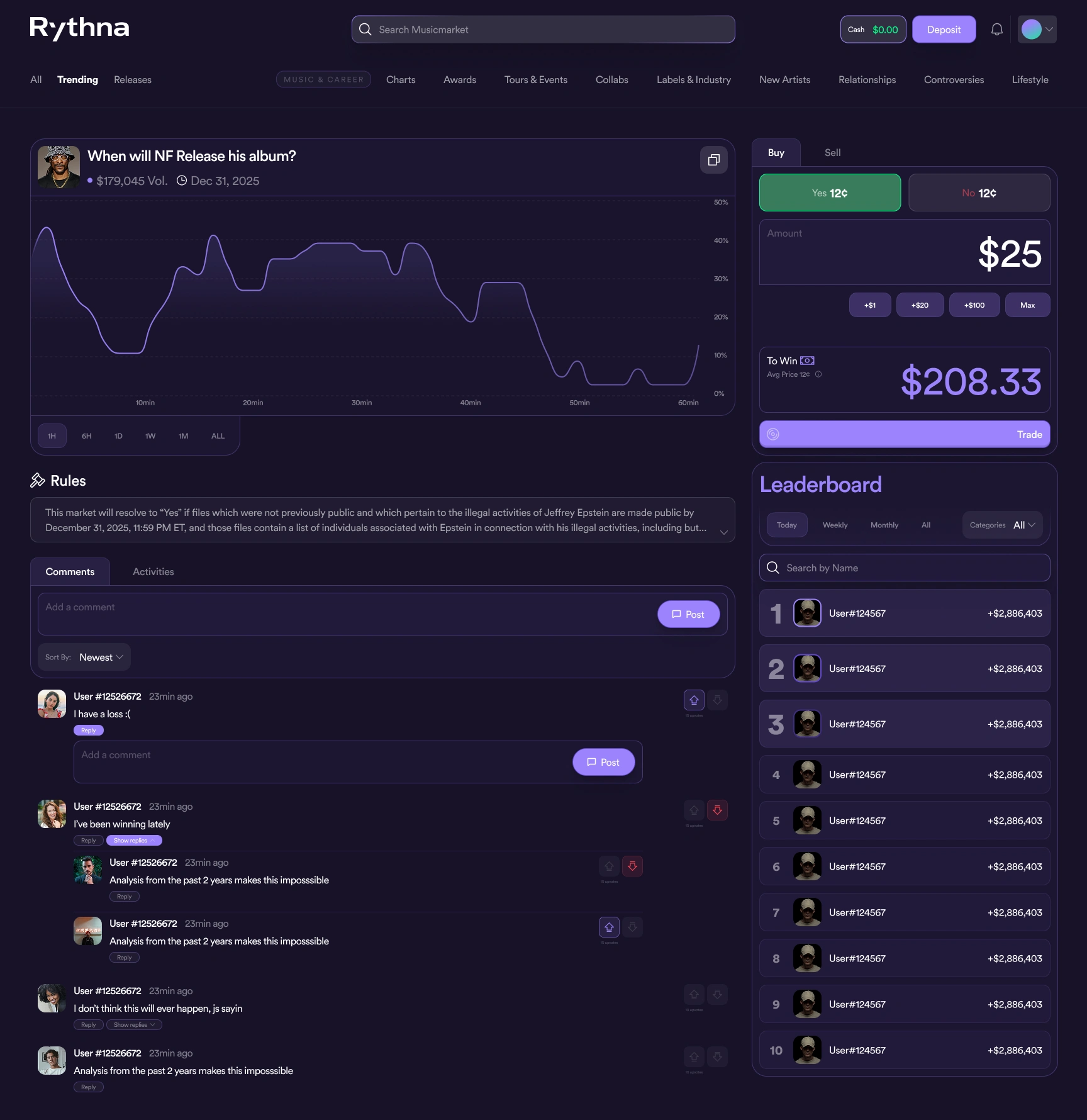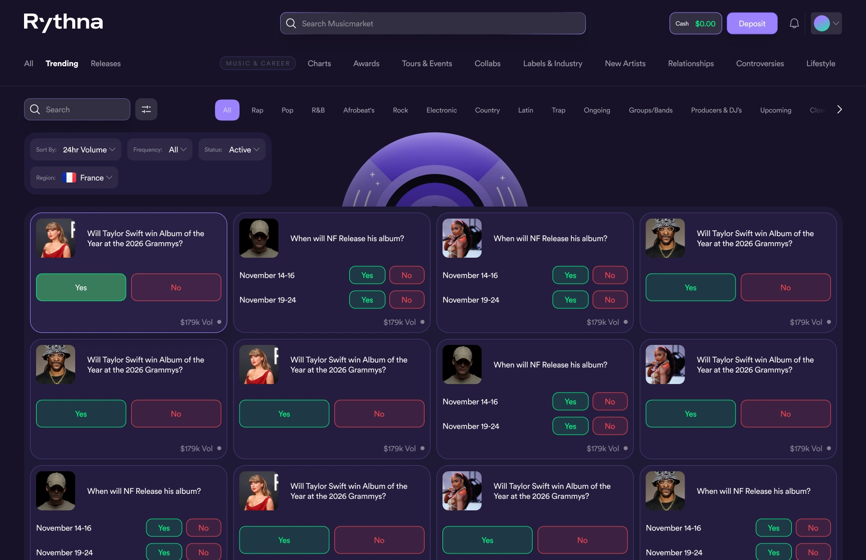 A dynamic platform where users can stake on music events and artists, combining event prediction, engagement, and rewards in a sleek, intuitive interface.