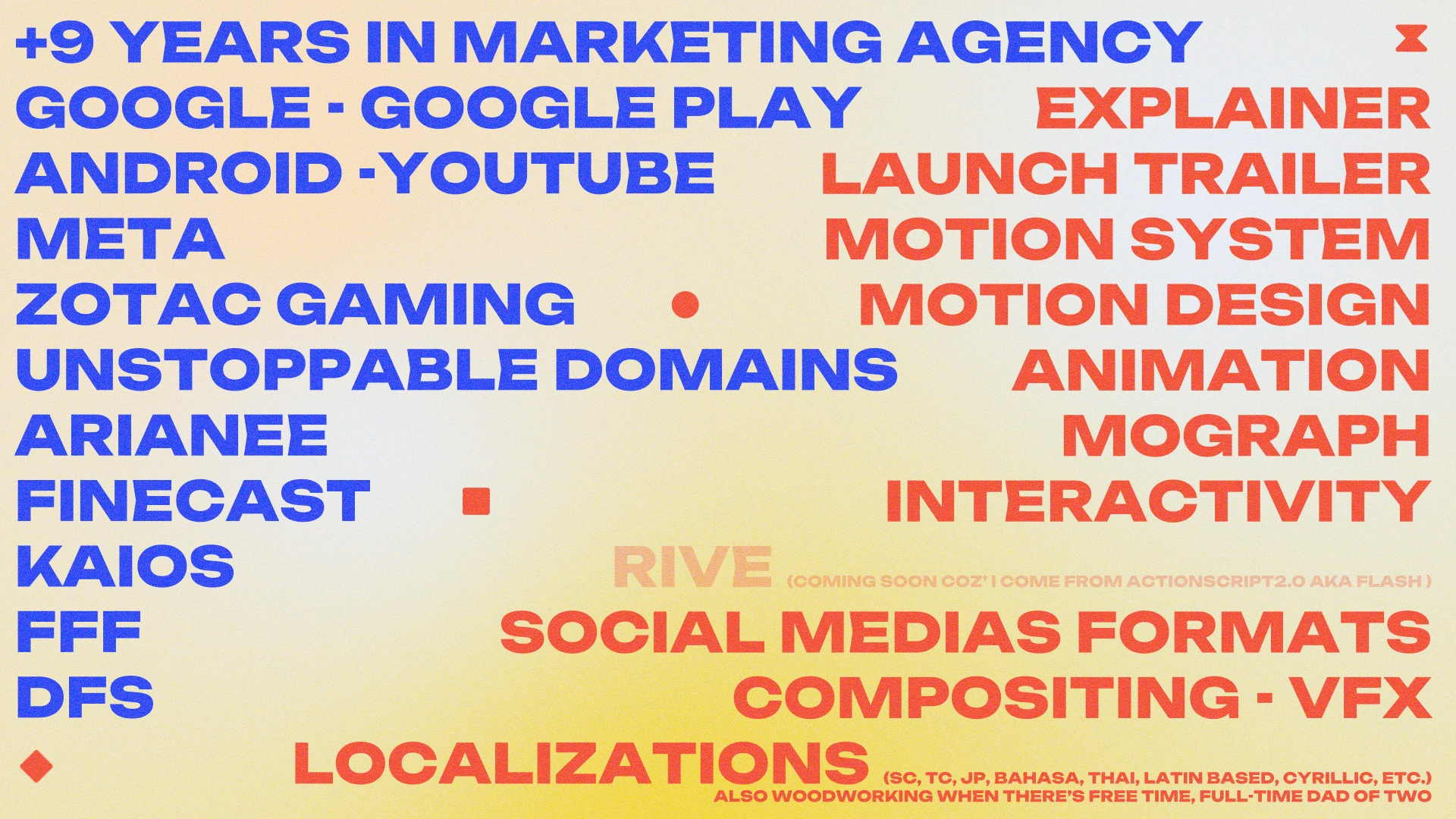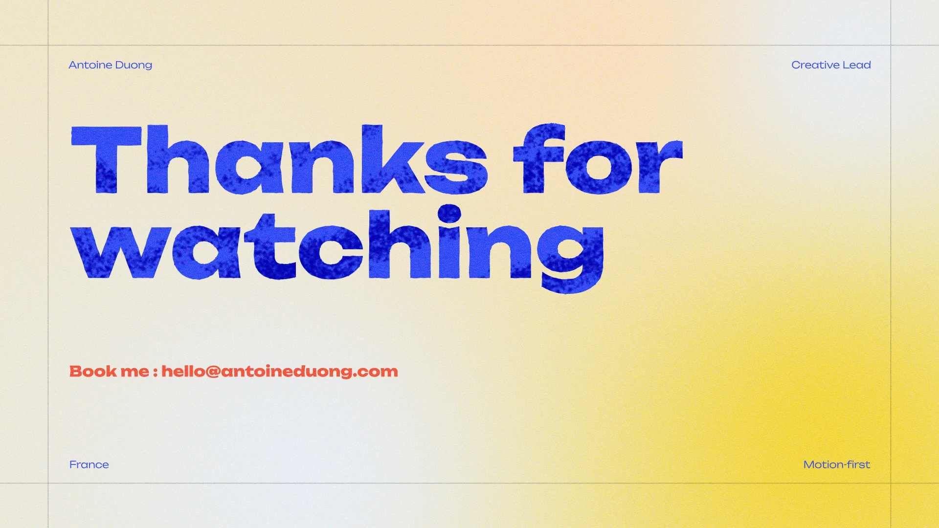 To start my freelancing career after 10 years in agency, I did a selection of motion design and art direction work crafted for global tech and entertainment brands. All of the works presented here were done at Orchid Creation where I was a presentation designer, a motion designer, a talent recruiter, a tech reference, a lead across the world.
