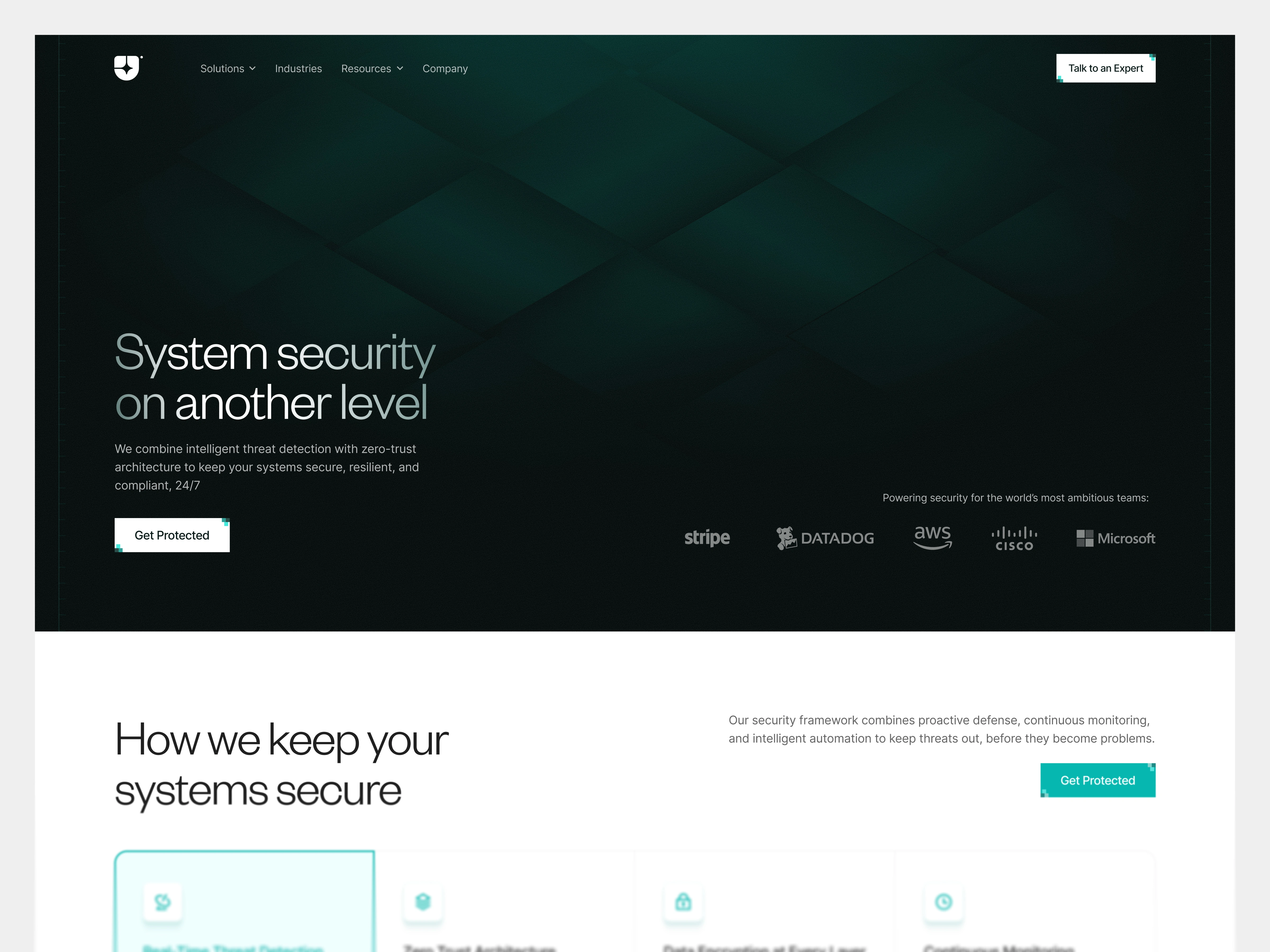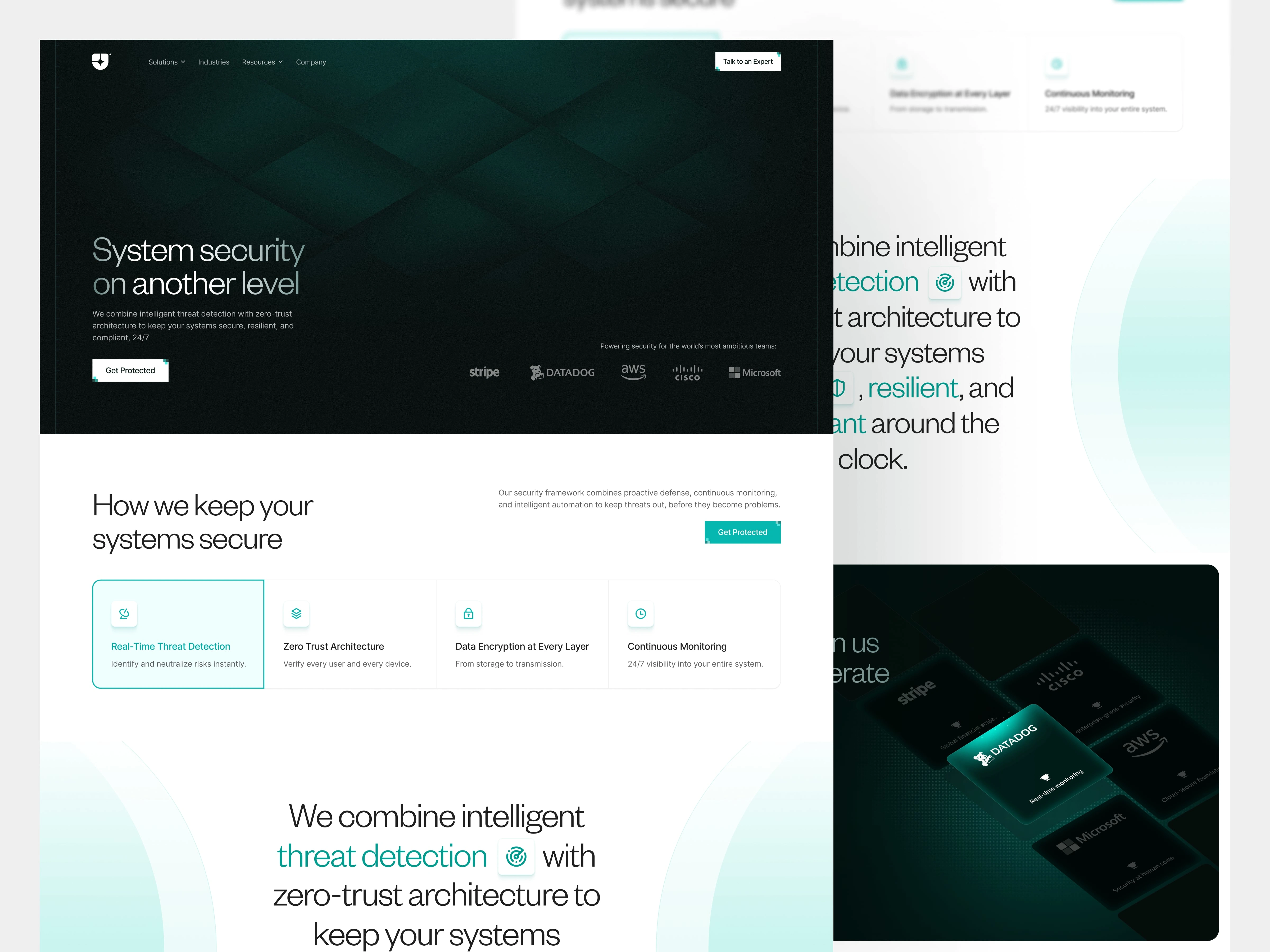 A design exploration for a cybersecurity SaaS website focused on system security and zero-trust architecture, exploring how visual design can communicate trust and credibility.