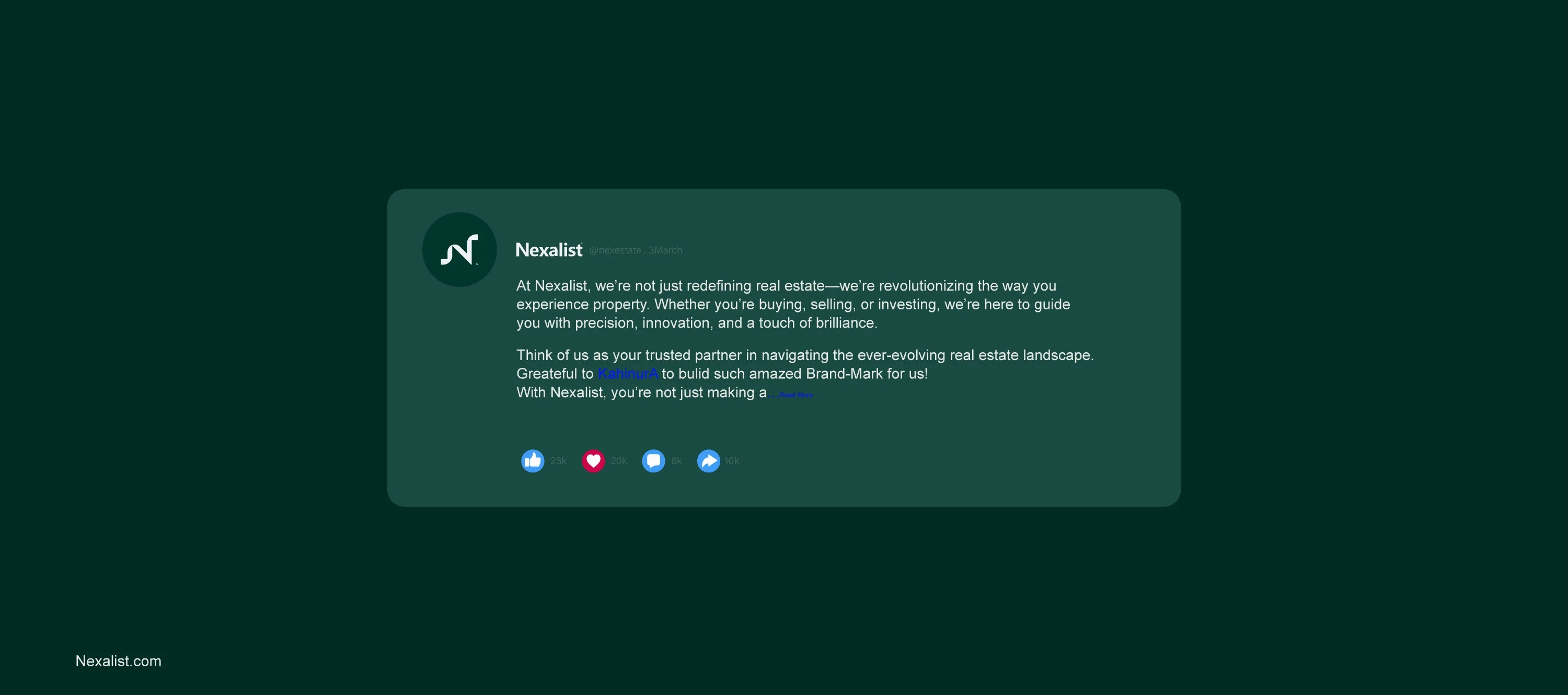 Nexalist™ redefines real estate as a nexus of innovation, trust, and possibility. These guidelines distill our essence: a forward-thinking brand that bridges cutting-edge technology with human expertise. Use this framework to ensure every touchpoint reflects our commitment to seamless experiences, bold design, and meaningful connections.