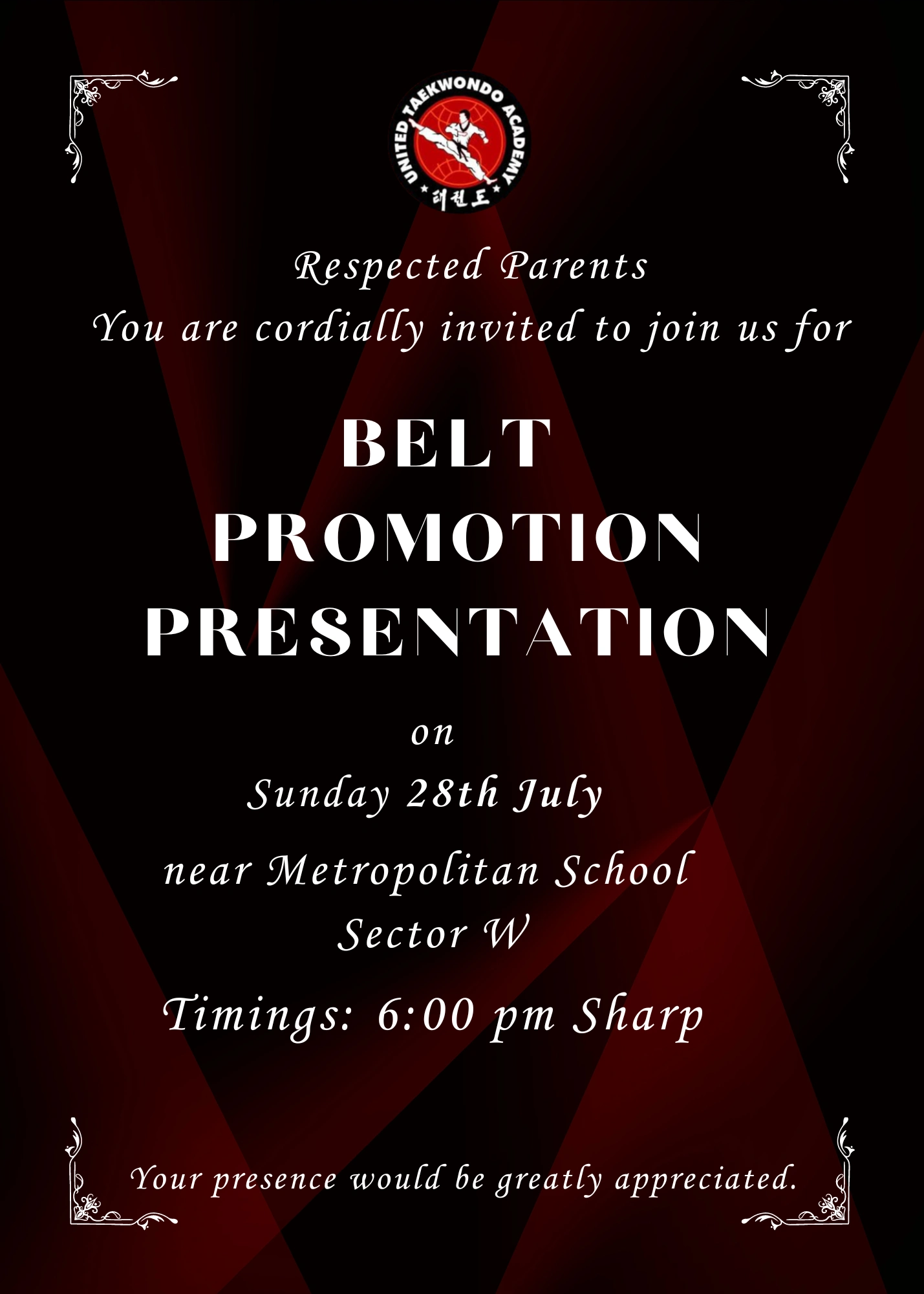 And, at the head, a respectful salutation to "Parents;" an invitation to "Come." "BELT PROMOTION PRESENTATION" is large and white, in all caps, front and center for all to see throughout the weekend.