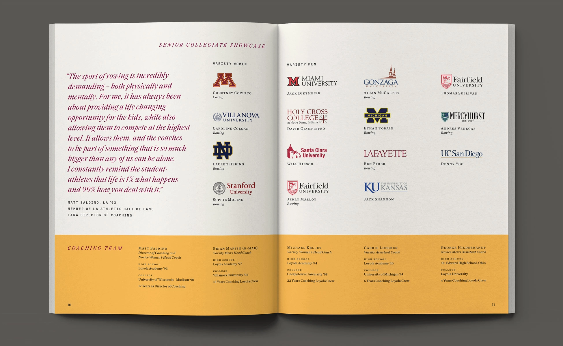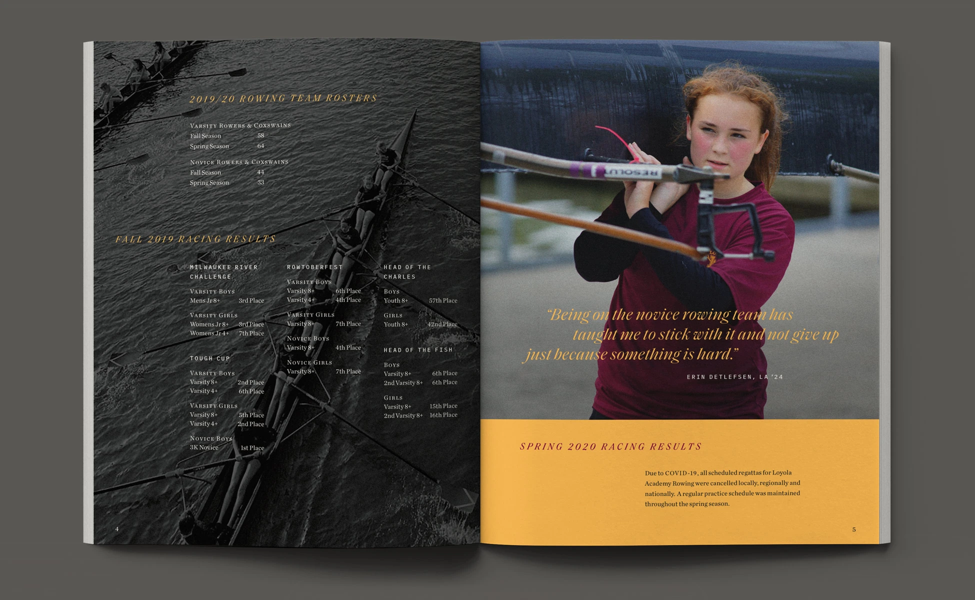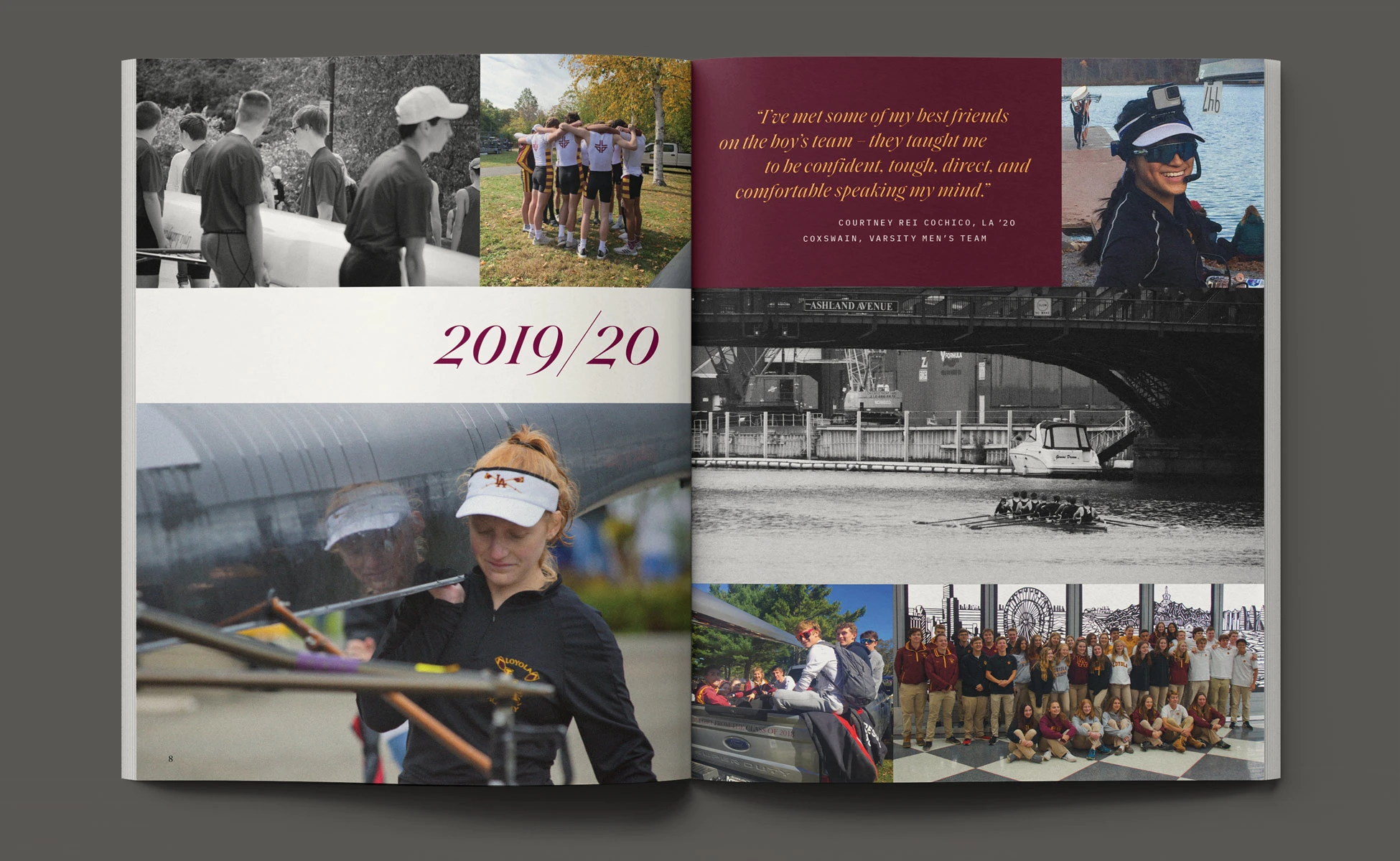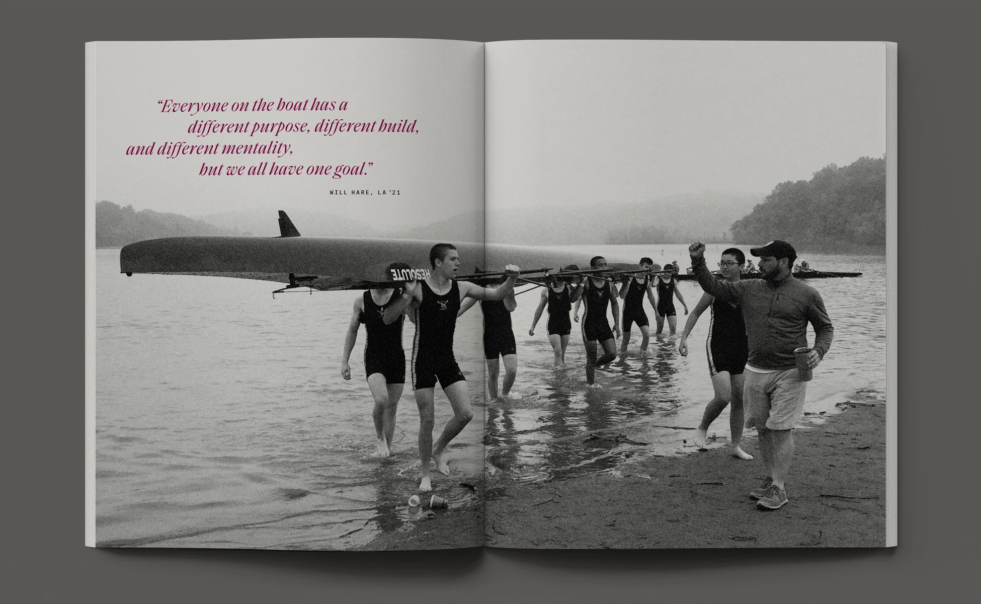 With a foundation of traditional styles, the book’s layout brought a more aspirational appeal to this year’s story. Taking visual cues from rowing and water, typographic details such as pull-quotes were composed with fluid, horizontal movement. Photographs contrasting size and scale, color and black & white, highlighted the devotion of the student-athletes. Through visual storytelling we aimed to communicate the year’s theme without having to read any copy.