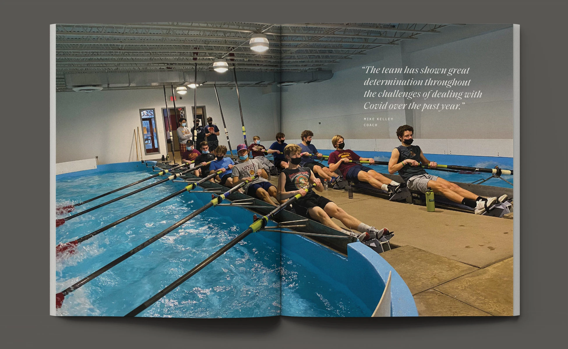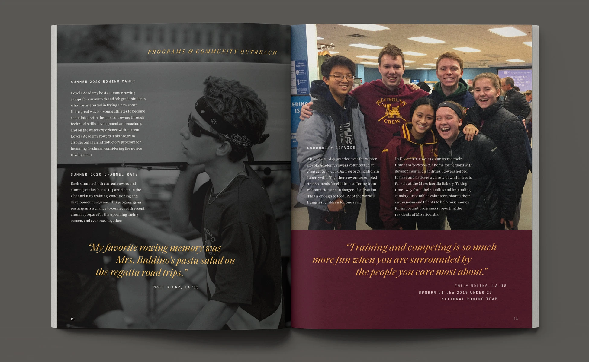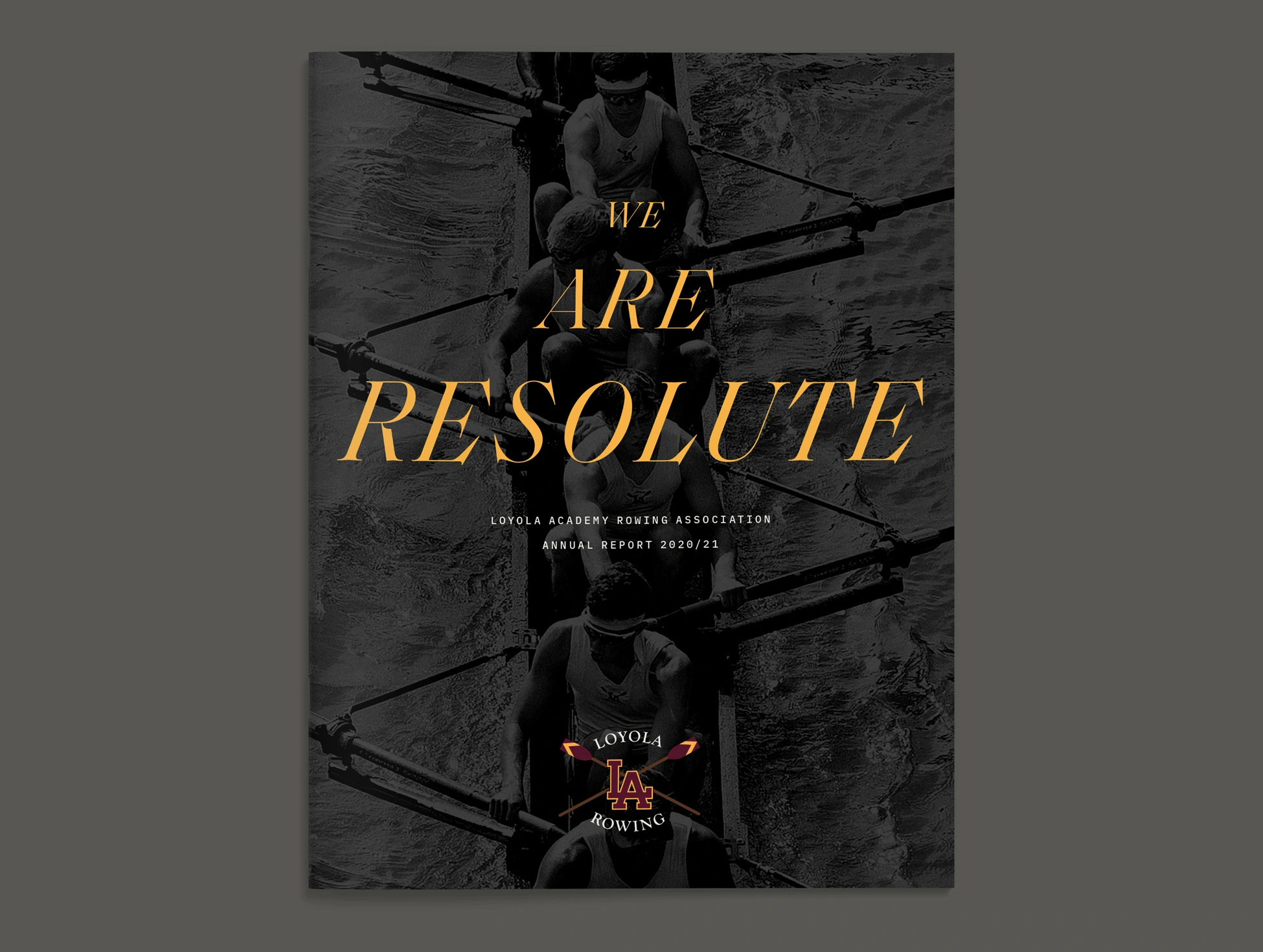 With a foundation of traditional styles, the book’s layout brought a more aspirational appeal to this year’s story. Taking visual cues from rowing and water, typographic details such as pull-quotes were composed with fluid, horizontal movement. Photographs contrasting size and scale, color and black & white, highlighted the devotion of the student-athletes. Through visual storytelling we aimed to communicate the year’s theme without having to read any copy.