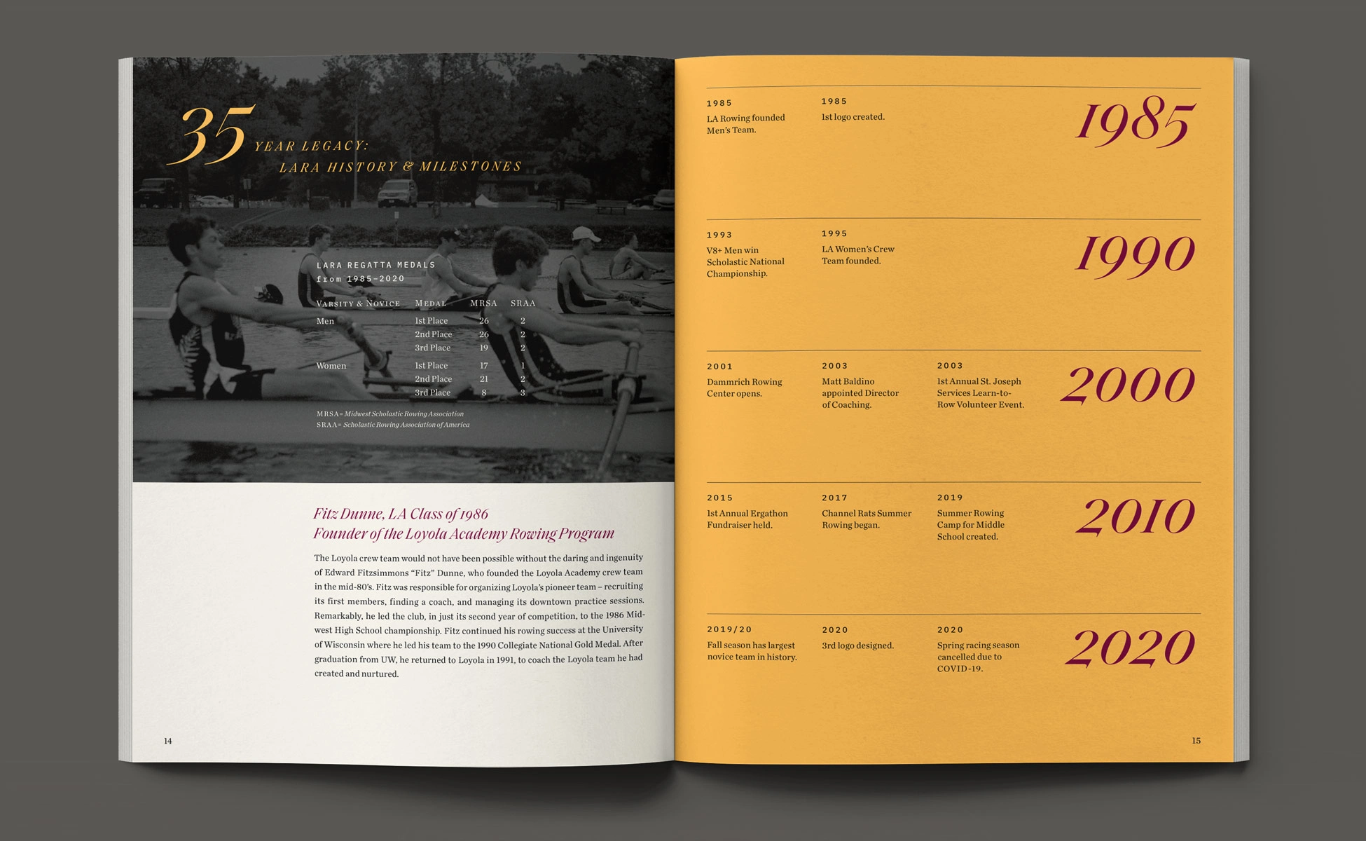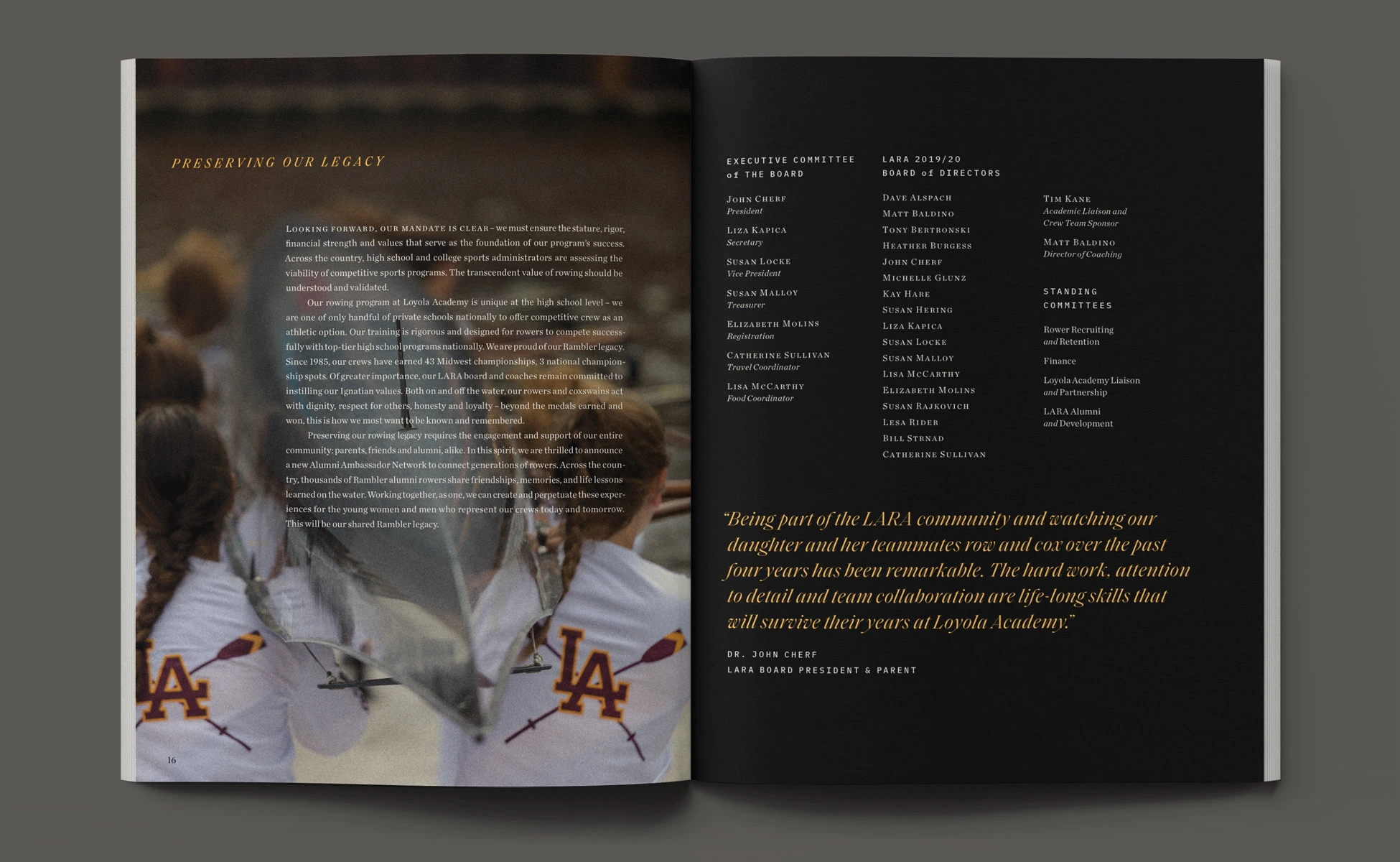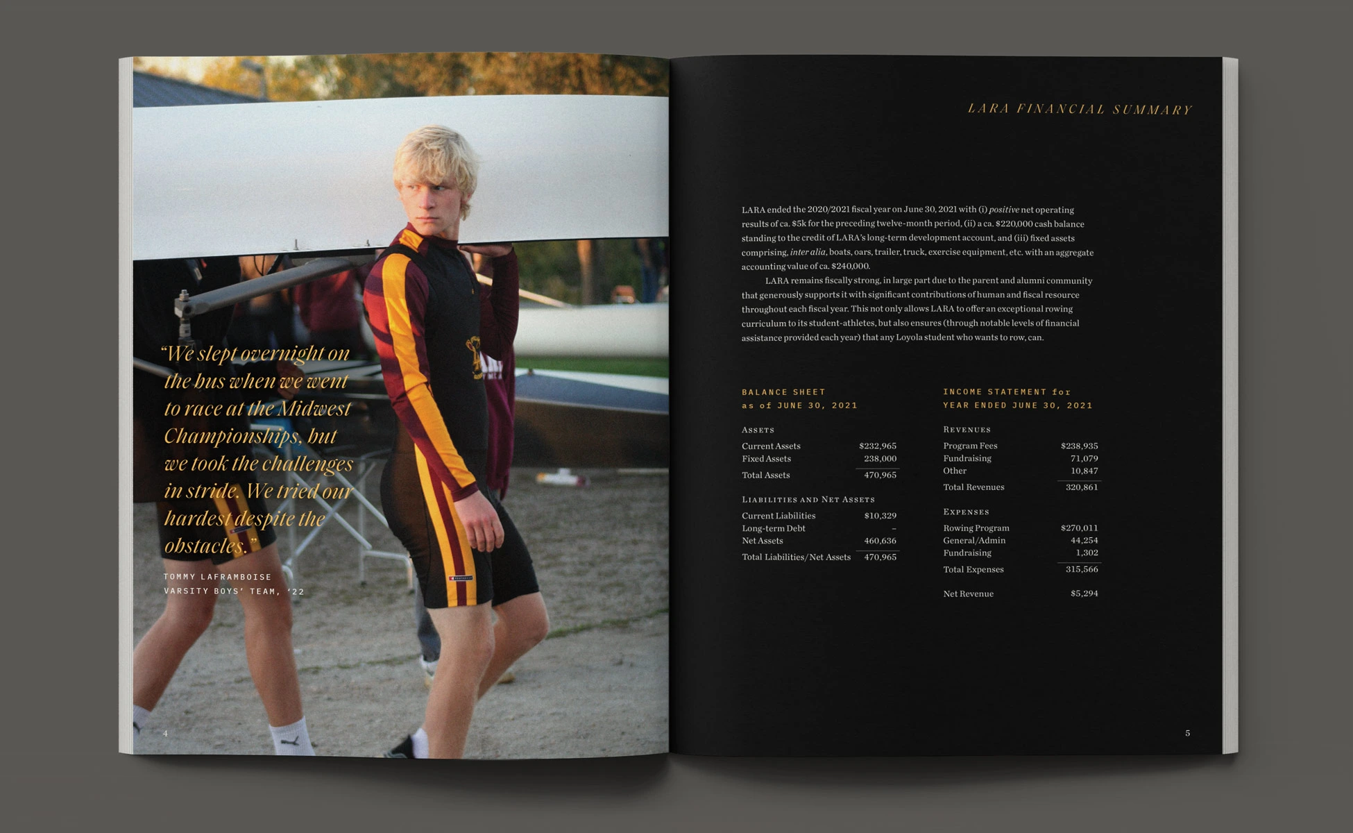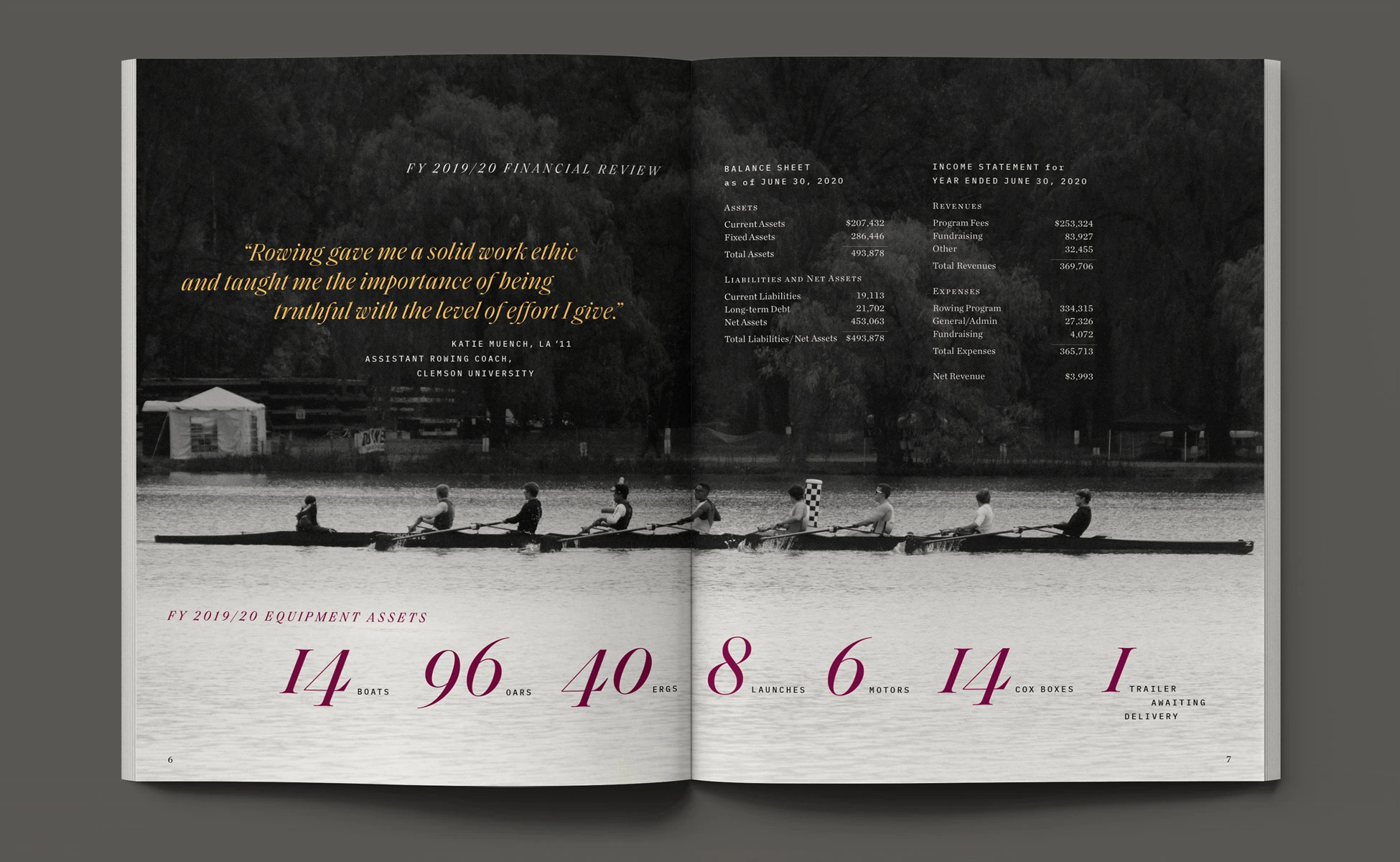 With a foundation of traditional styles, the book’s layout brought a more aspirational appeal to this year’s story. Taking visual cues from rowing and water, typographic details such as pull-quotes were composed with fluid, horizontal movement. Photographs contrasting size and scale, color and black & white, highlighted the devotion of the student-athletes. Through visual storytelling we aimed to communicate the year’s theme without having to read any copy.