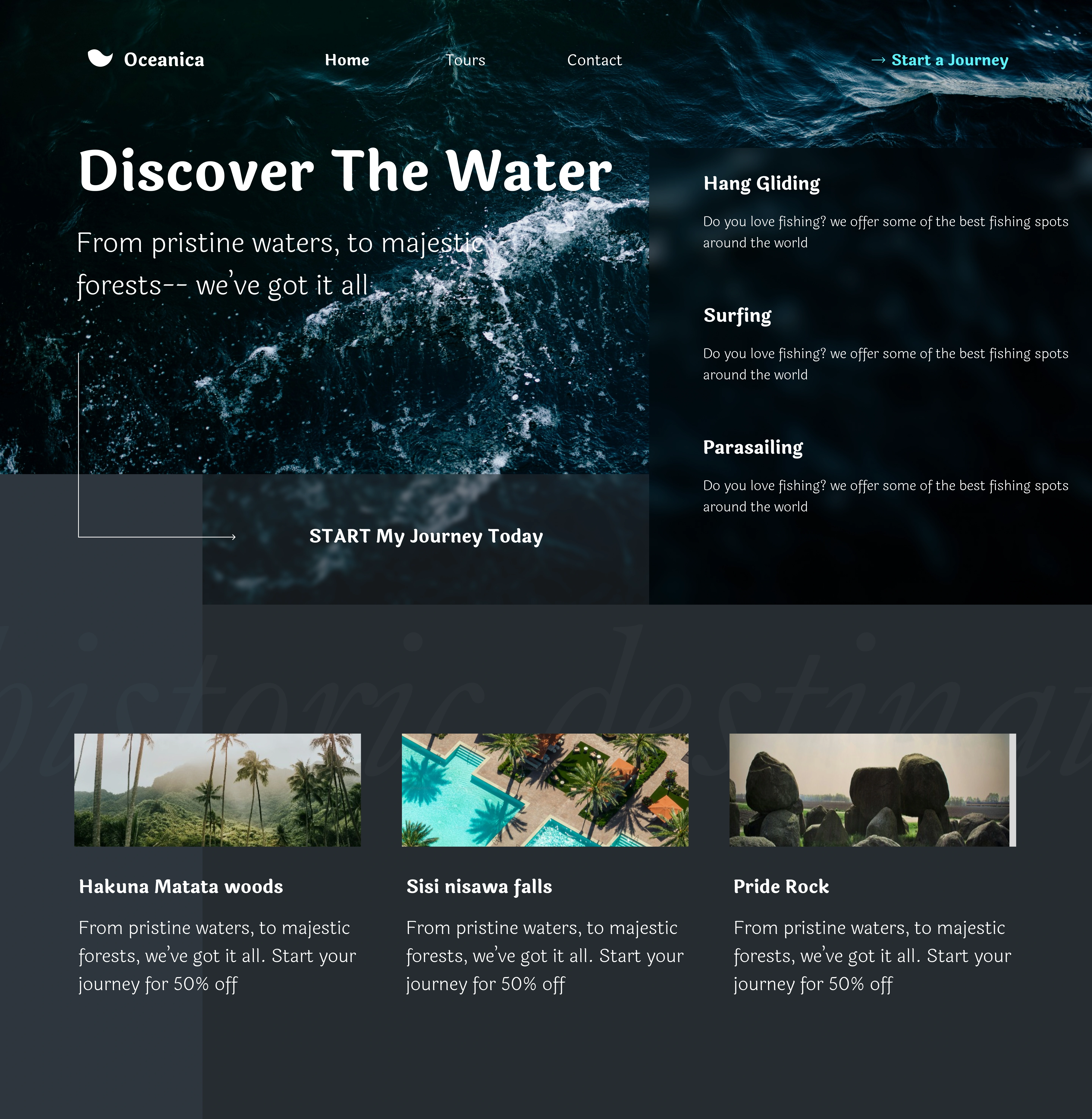 The hero section featured a bold destination image with a clear call-to-action for booking or exploring tours. Below this, curated destination cards showcased popular travel spots with engaging visuals, quick highlights, and easy navigation into deeper details. The layout was designed to balance storytelling with functionality—users could dream, browse, and book without losing direction.