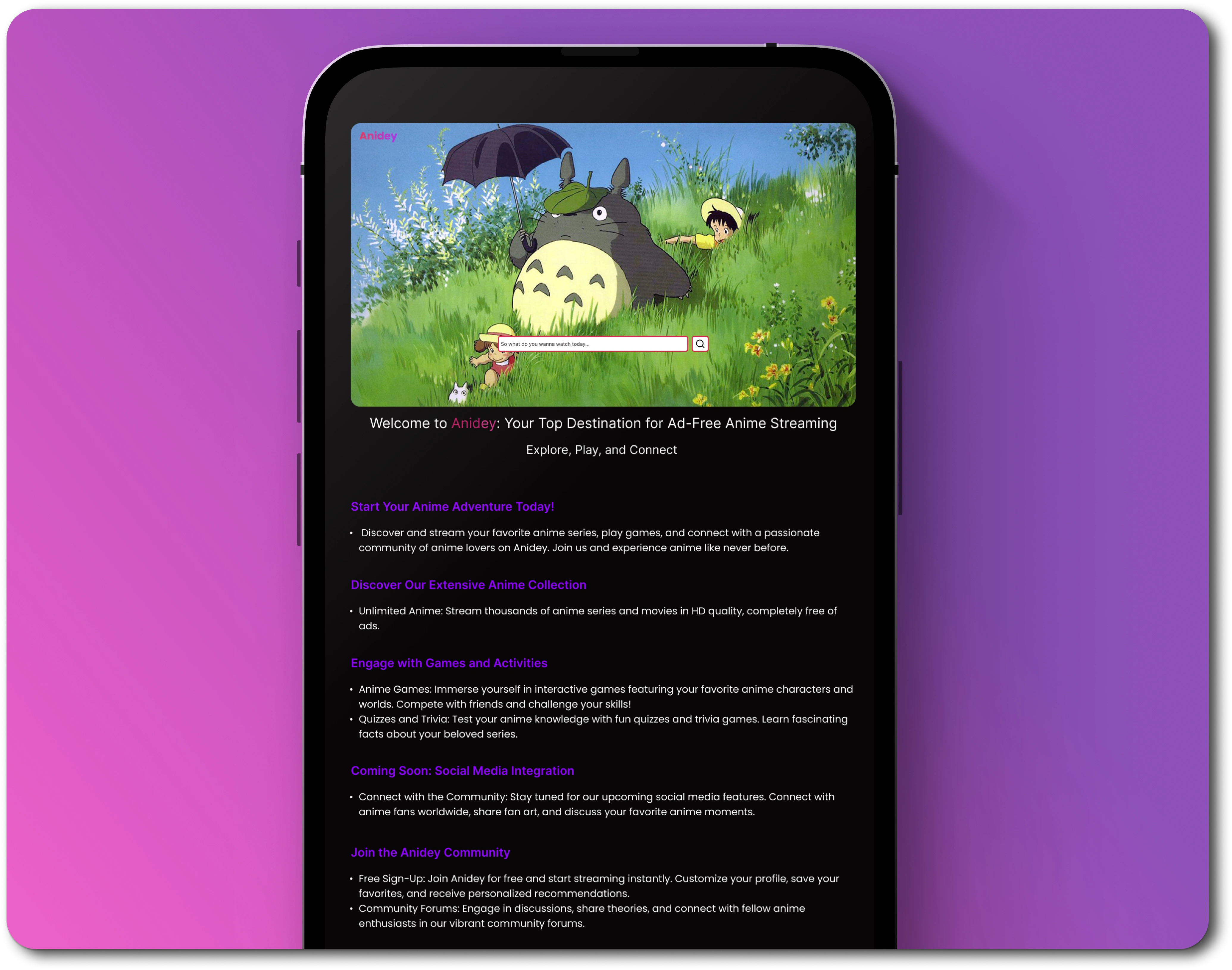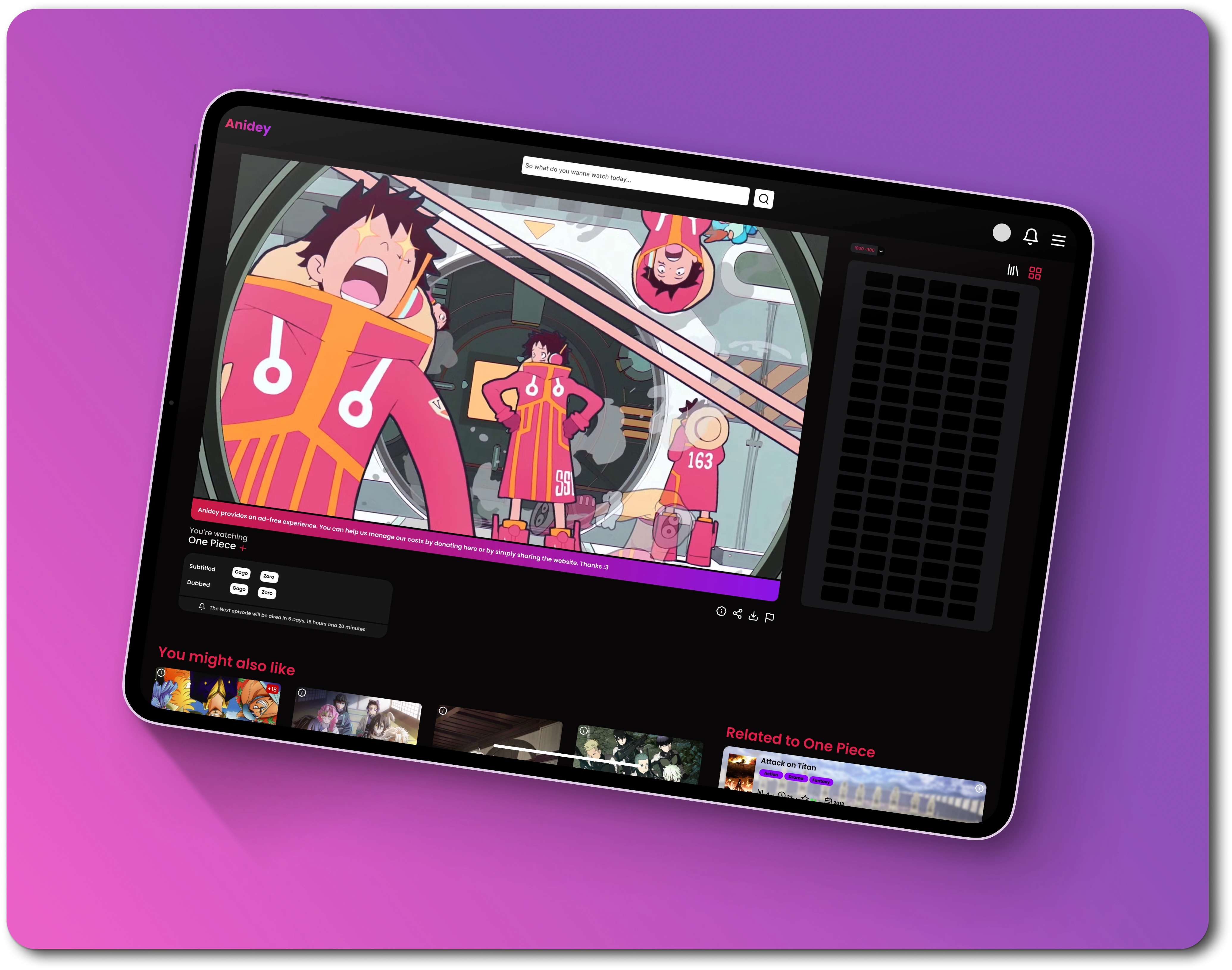 Anidey is an anime streaming website with user-friendly UI and vibrant designs.