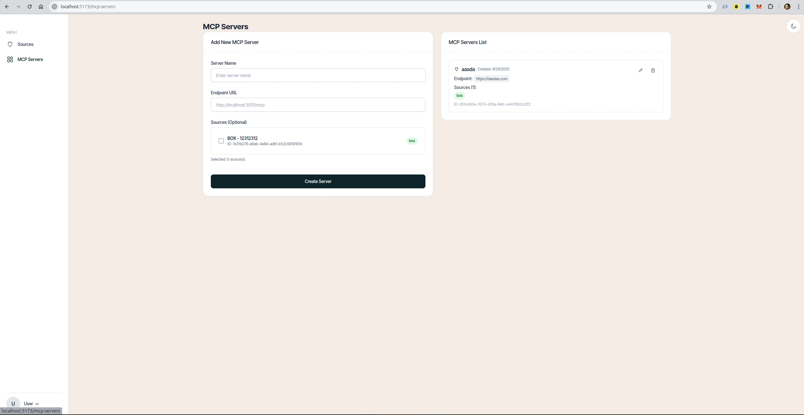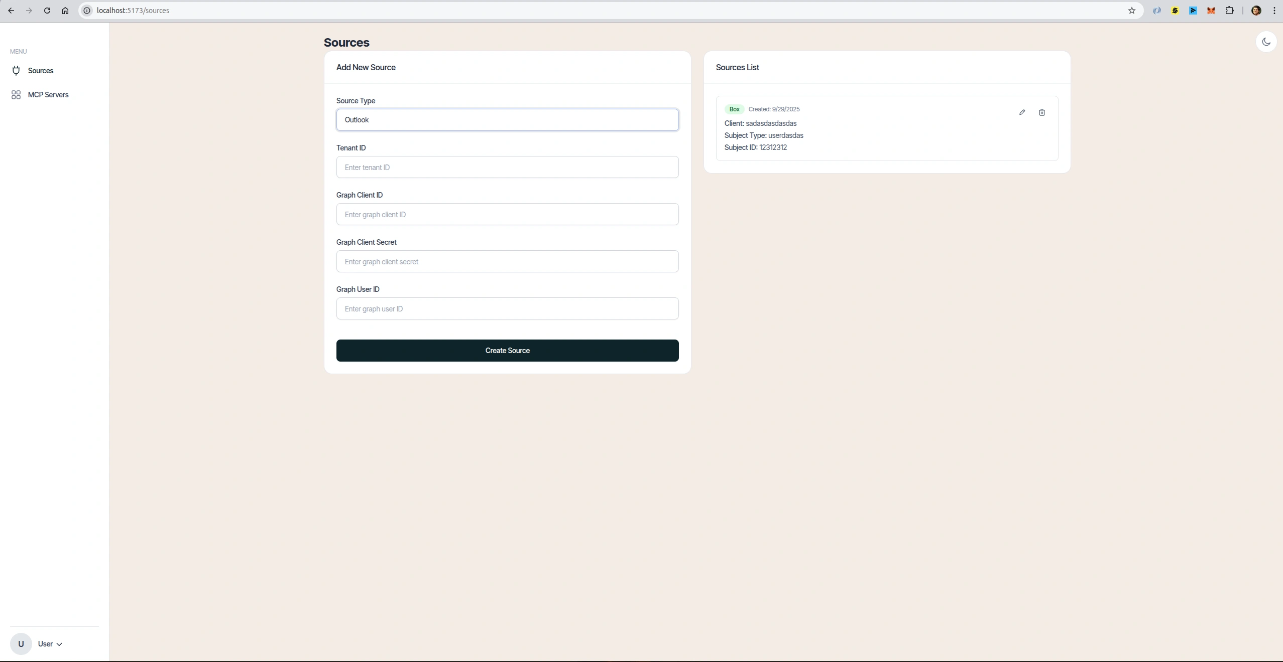 The screenshots show an MCP admin UI which can be used by an admin to register new data sources like Outlook, Box, Snowflake and create MCP servers on a subset of these data sources. One can create multiple MCP servers which are connected with any combination of data sources in the backend. The MCP admin UI powers an MCP Gateway that allows a user to add sources (like outlook, box, snowflake) & create an MCP server on top of them.