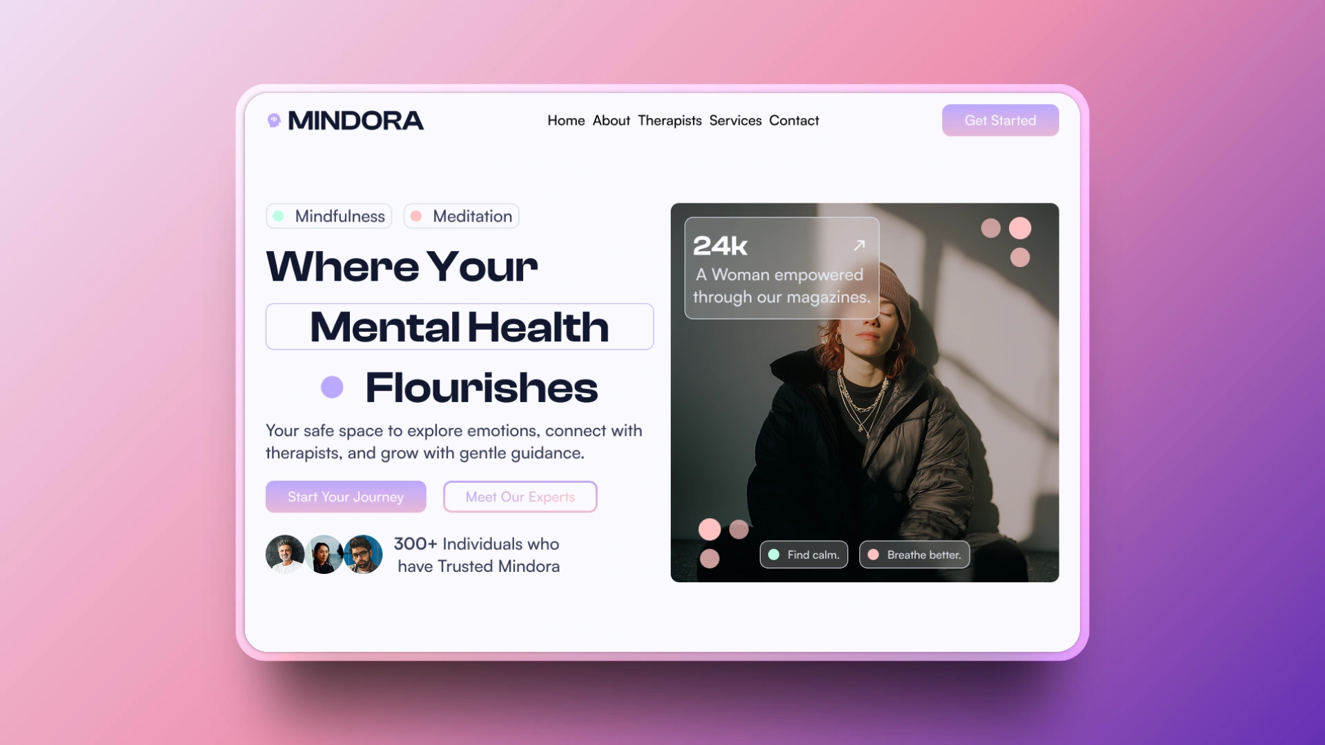 Using a calming visual identity, structured layout, and minimalist aesthetics, Mindora delivers an intuitive user experience. The design focuses on clear hierarchy, soothing tones, and approachable navigation—perfect for users seeking emotional support.