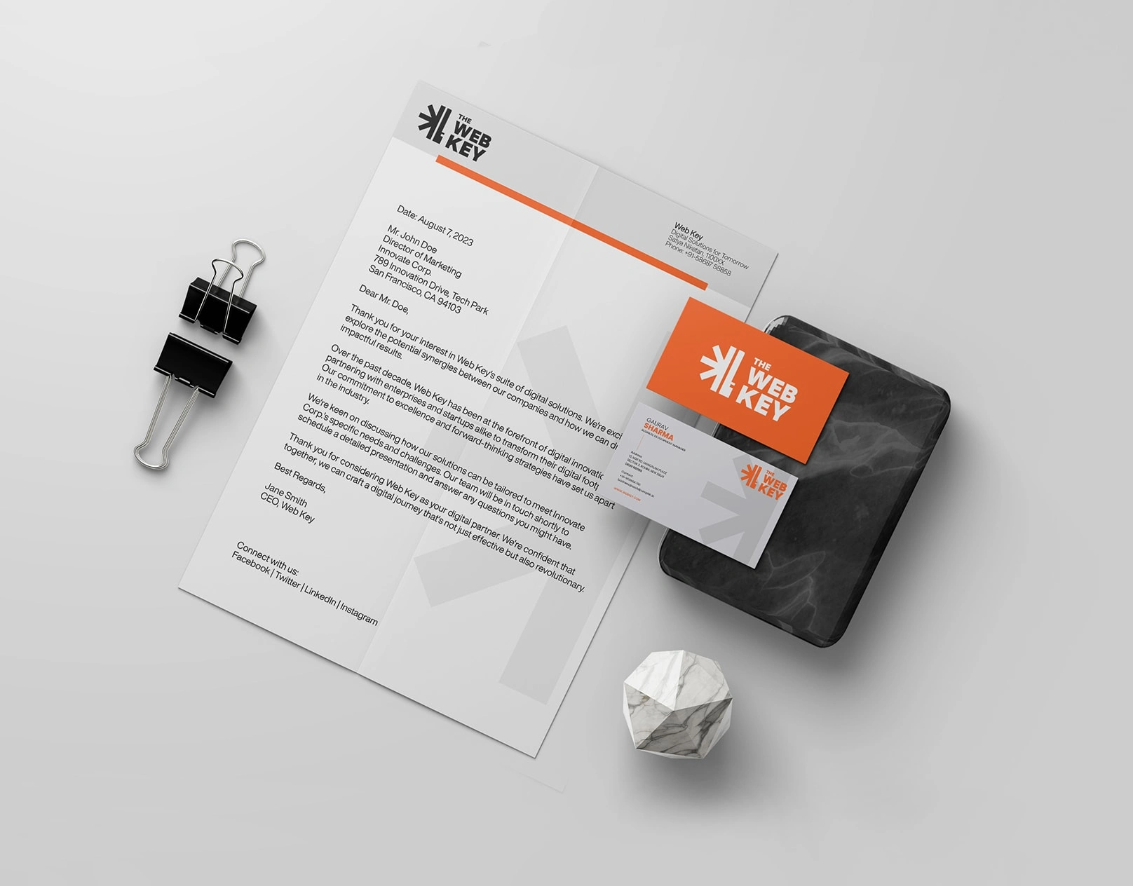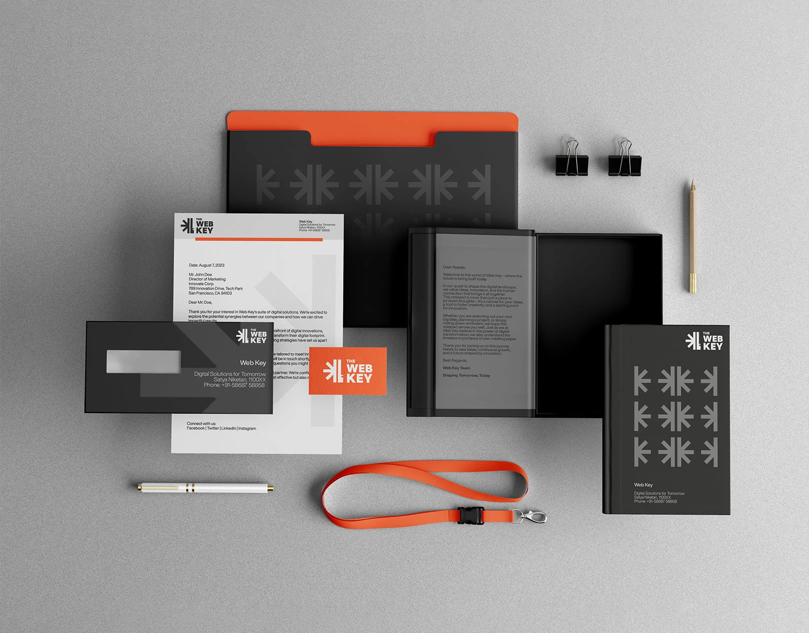Brand Identity :A comprehensive branding suite was developed, ensuring that every touchpoint, from business cards to online presence, echoed WebKey’s central message: "Your challenges, our solutions."
