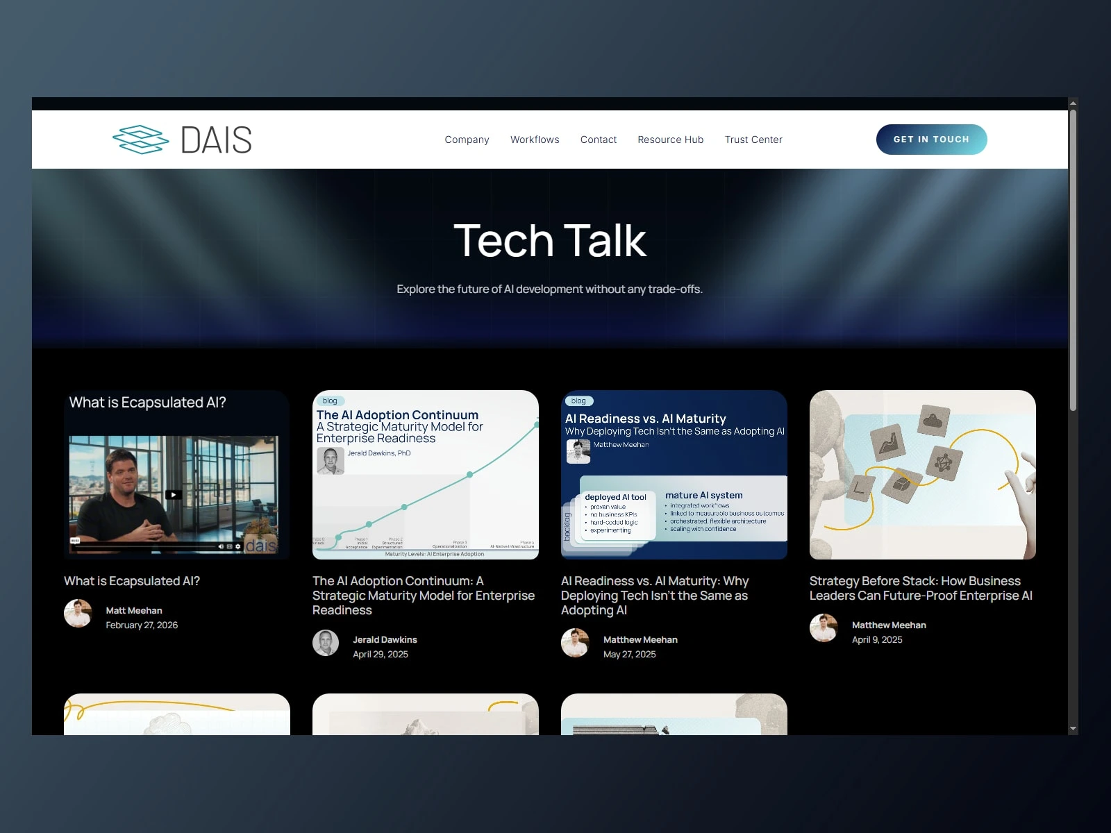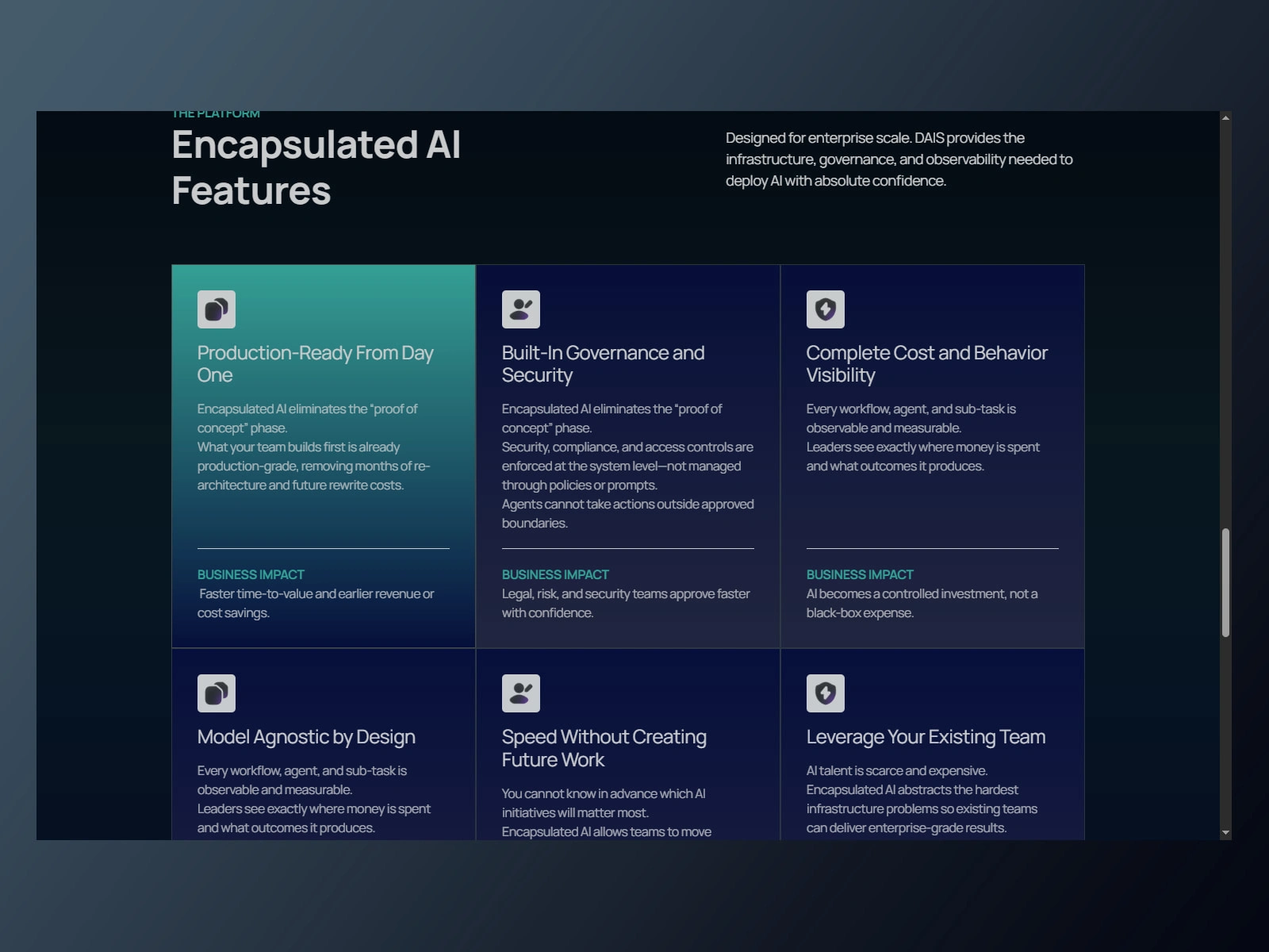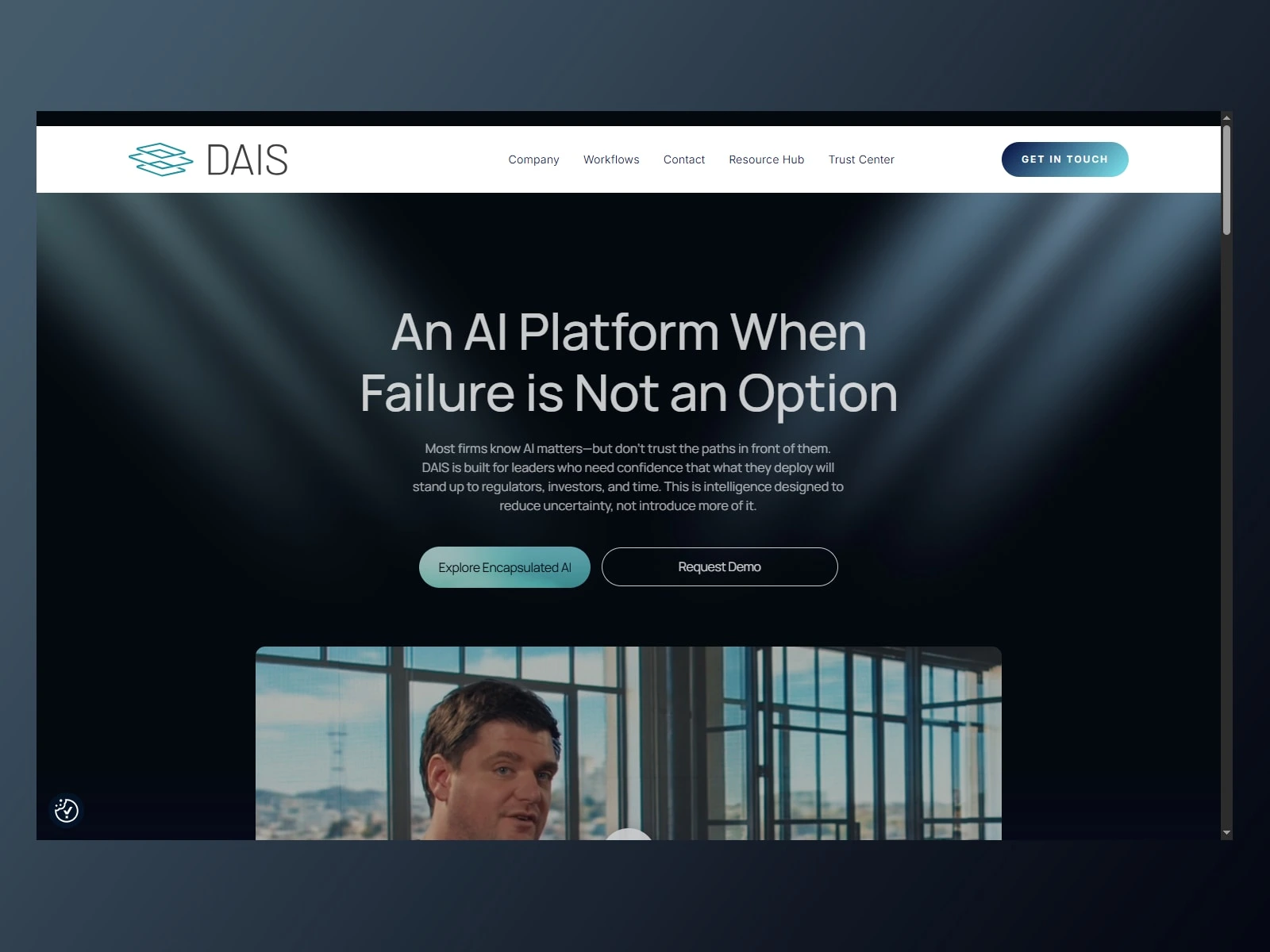The website focused on presenting DAIS as a trusted AI execution platform for enterprise environments, highlighting governance, observability, and production-ready workflows across industries like hedge funds, accounting firms, and government operations.