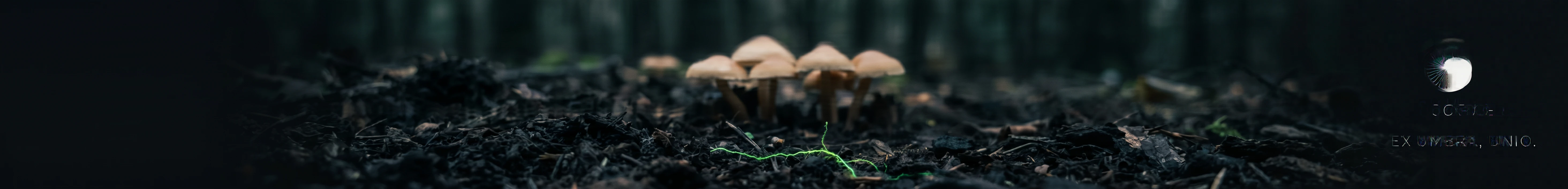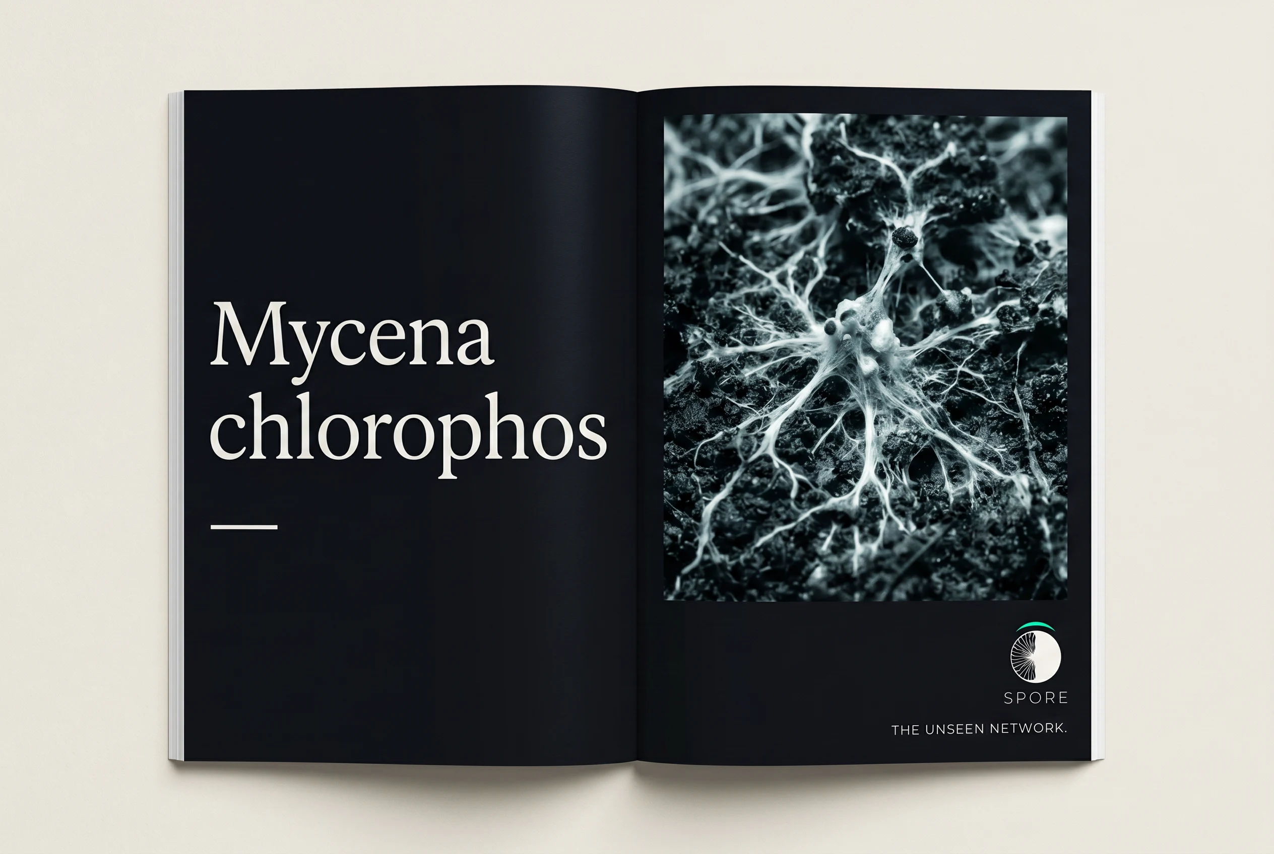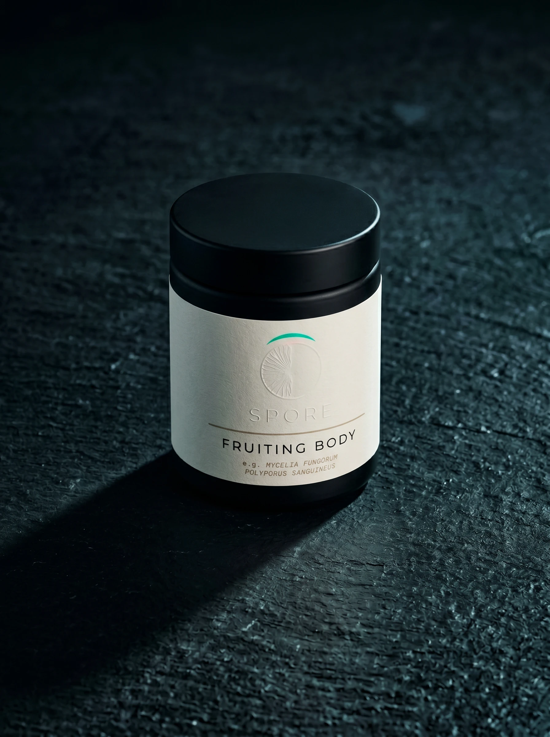 #0F0F12) is the primary ground — almost but not quite black, which makes it feel biological rather than graphic. Spore white (#F0EDE8) is warm, slightly organic — never pure white. Electric moss (#5AE87A) appears once per composition, always as a single detail: a gill edge glowing in a photograph, the arc on the logo, a thread of mycelium in a campaign image. Deep violet (#3D1F5C) runs secondary packaging, interior surfaces, wax seals. Warm bone (#D4C9B0) grounds light-mode applications — uncoated card, tissue stock, ceramic surfaces.