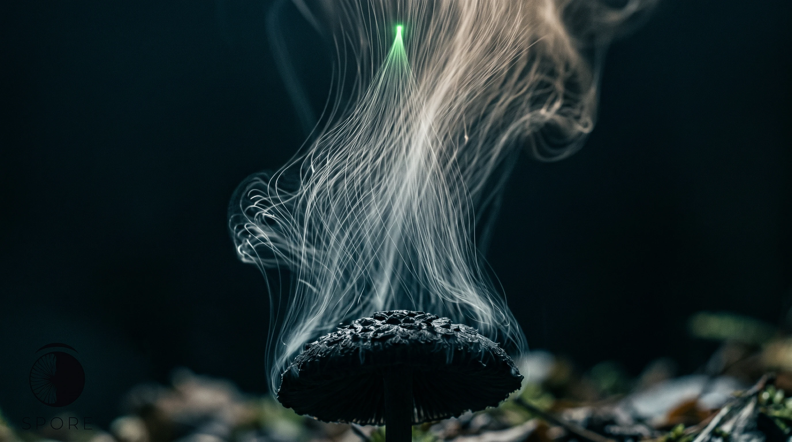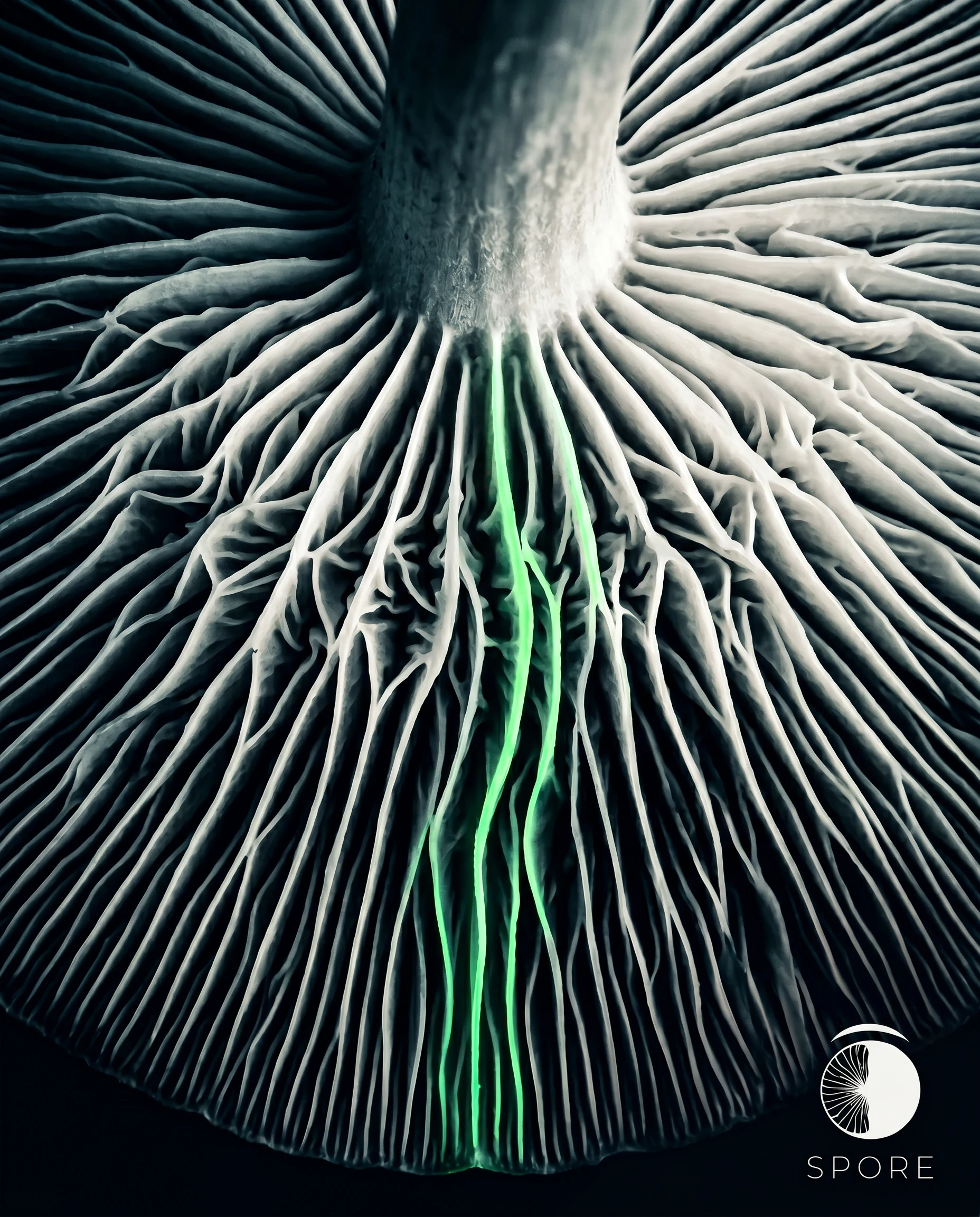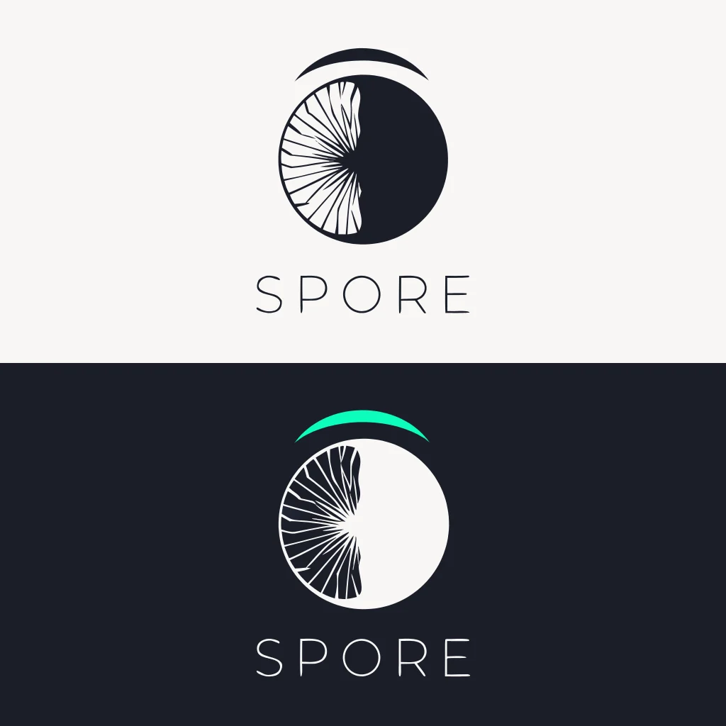 #5AE87A) — the only color moment in the mark. In the dark version on near-black, the arc suppresses to spore white. The wordmark is set in a refined geometric sans, tracked wide in small caps, below the symbol — neutral enough that the symbol carries everything.