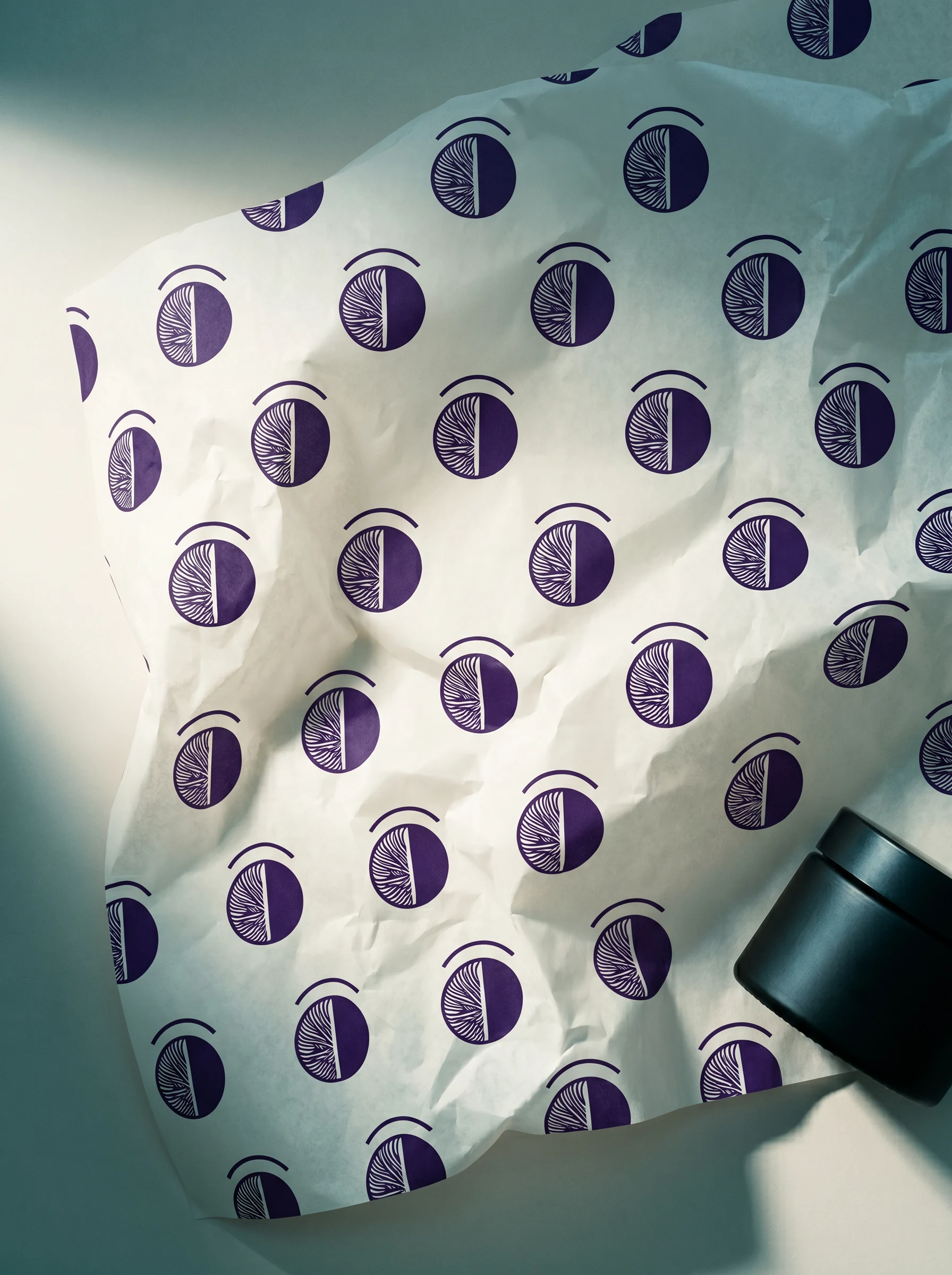 #3D1F5C) interior lining visible when opened. The ceramic dropper bottle carries only the wordmark on a bone band label — no symbol — and a stamped Latin name at the base like a pottery mark. The apothecary bottle runs a deep violet label with the full logo at small scale, the product name in lowercase monospace. Interior tissue is printed with a repeating symbol pattern in deep violet on bone stock.