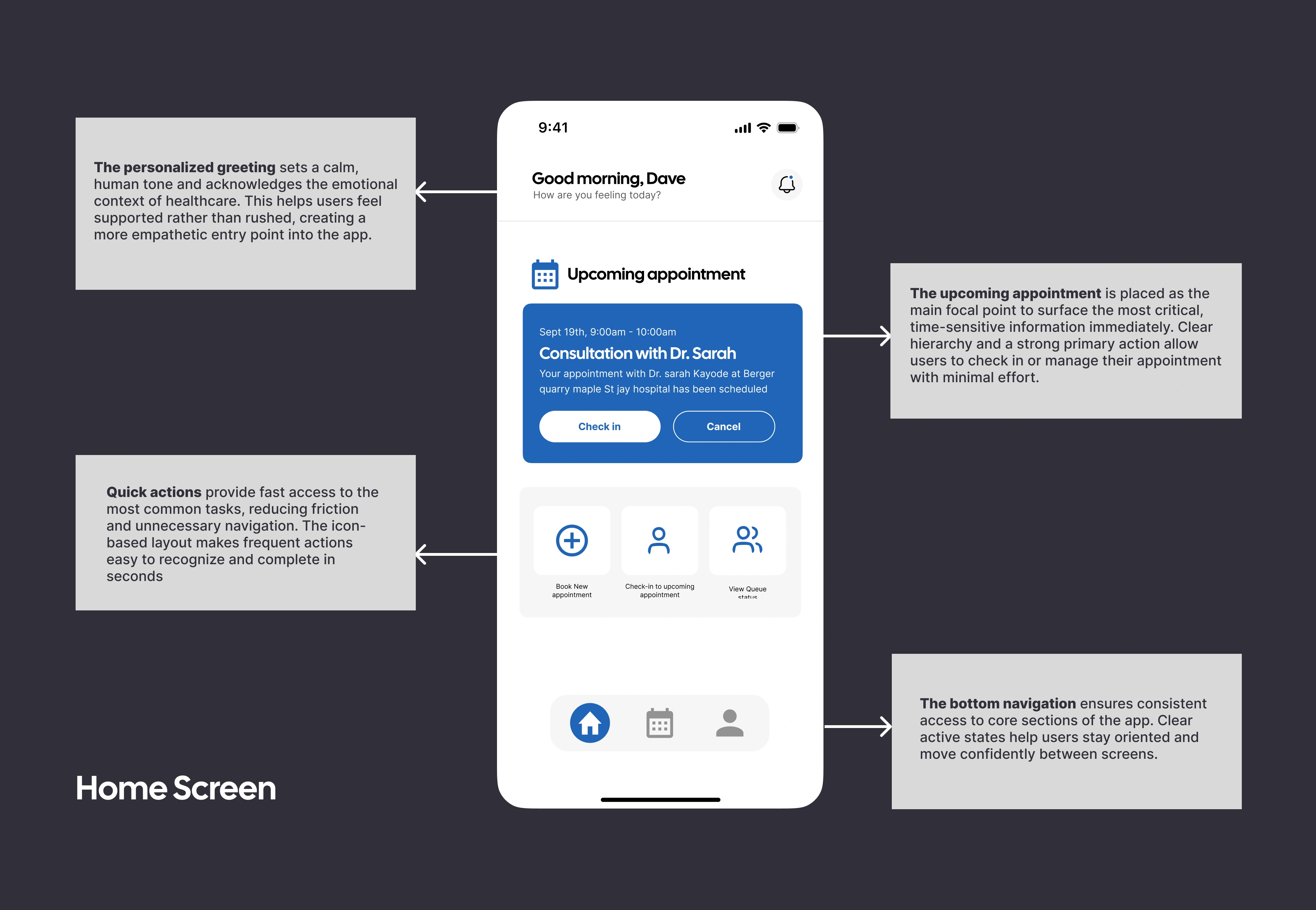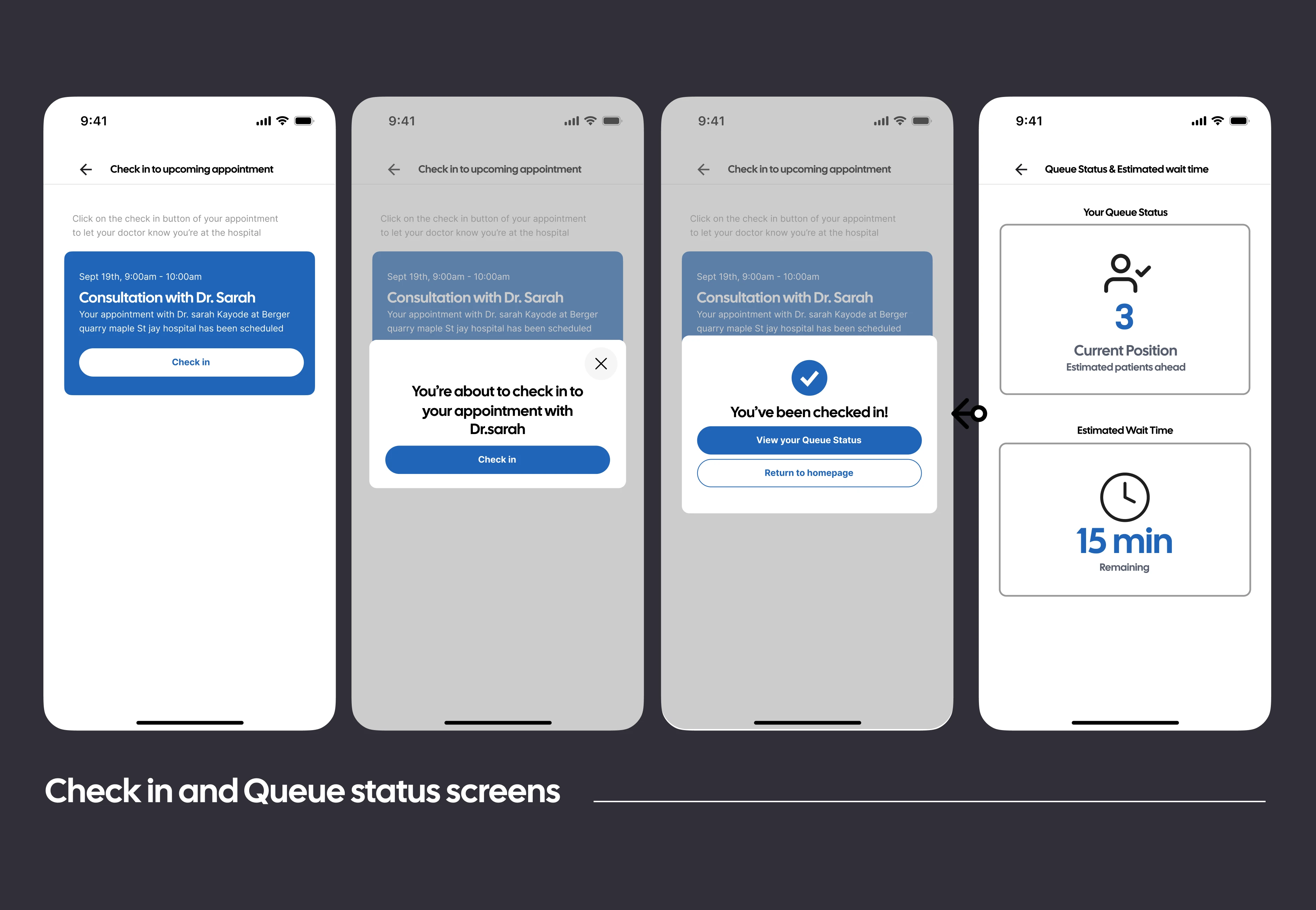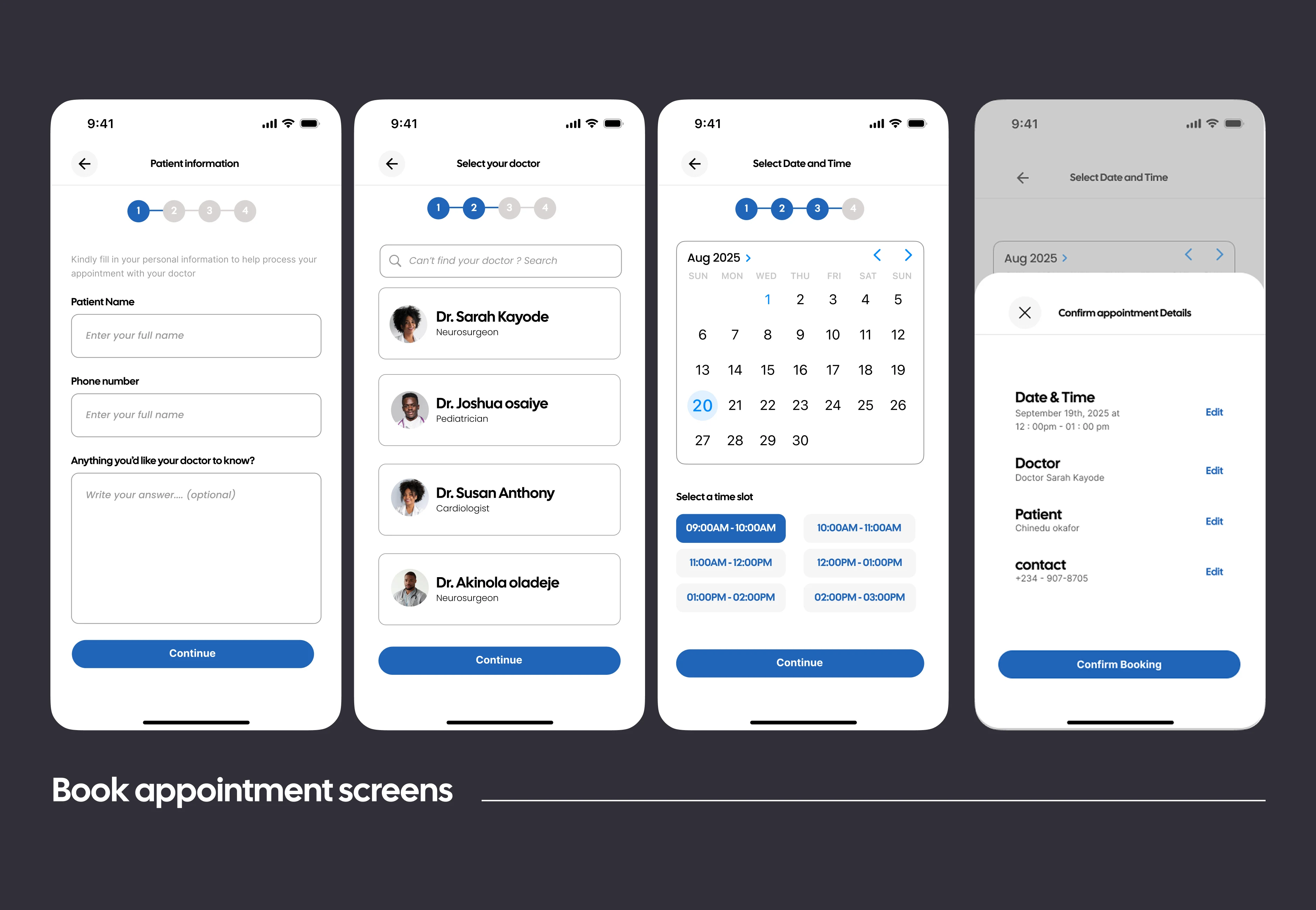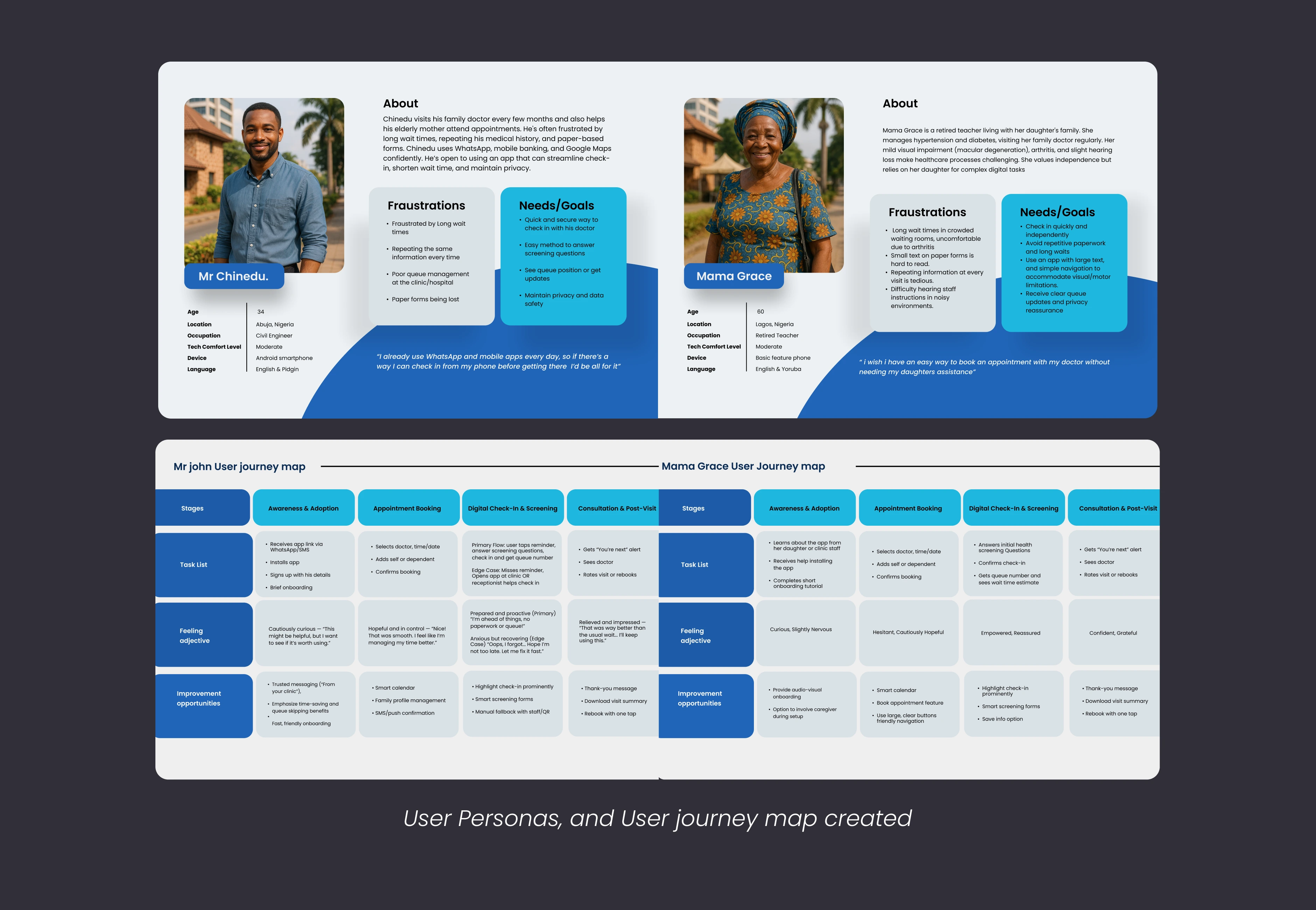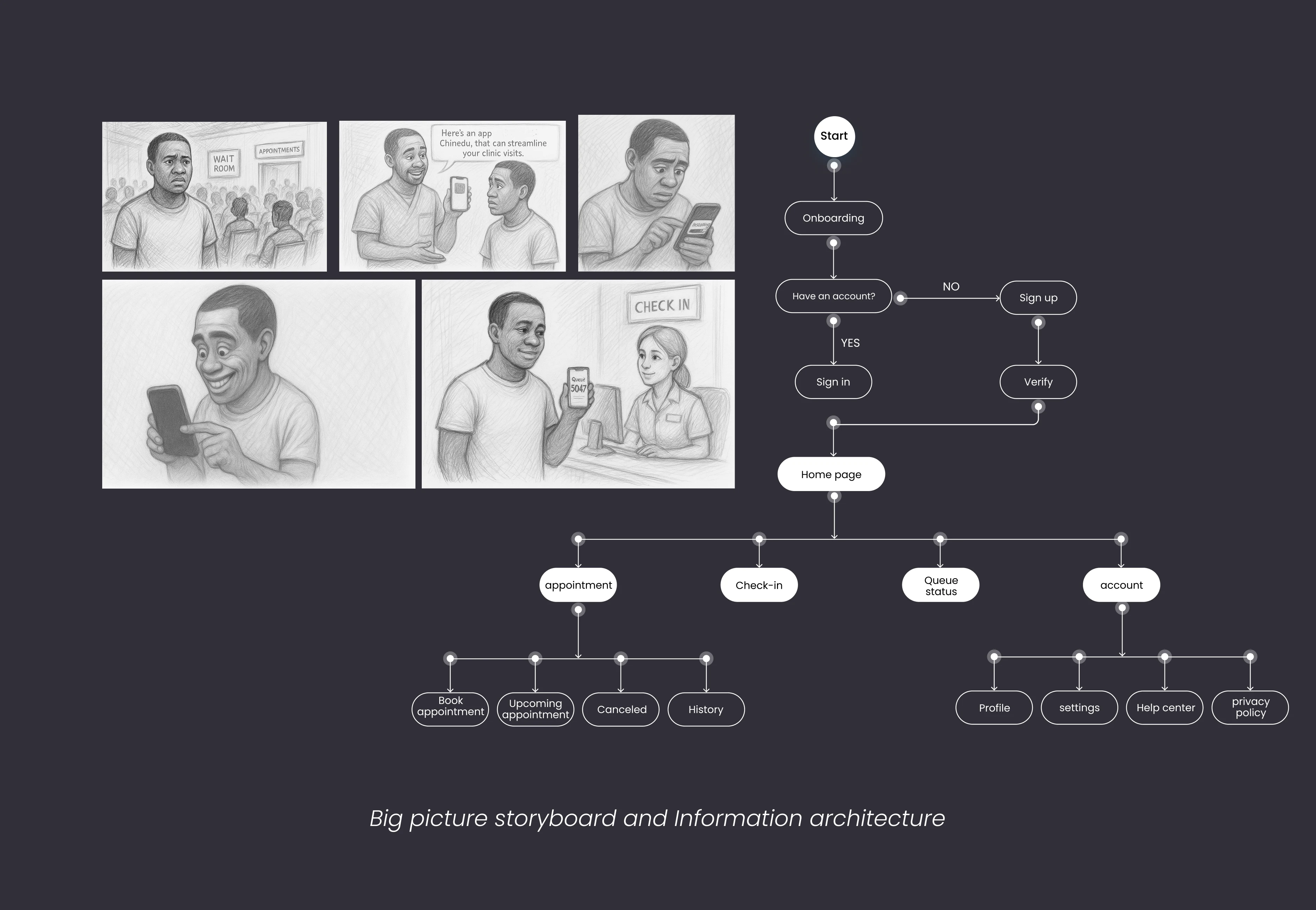 The SeeMyDoc UX process began with research to understand the challenges patients face in Nigerian hospitals—long wait times, repeated paperwork, and lack of visibility into queue status. From this, I created personas and storyboards to capture real user needs and frustrations, which guided the user journey map and highlighted opportunities for improvement. Using these insights, I developed information architecture and low-fidelity wireframes to explore navigation, layout, and core flows like booking appointments, digital check-in, and health questionnaire completion. This iterative approach ensured that every step of the design addressed real user pain points while remaining simple, accessible, and intuitive.