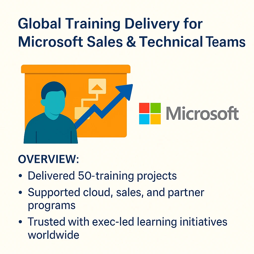 Led global project teams to develop web-based and instructor-led training for Microsoft’s Sales and Technical teams, including employees and partner ecosystem.