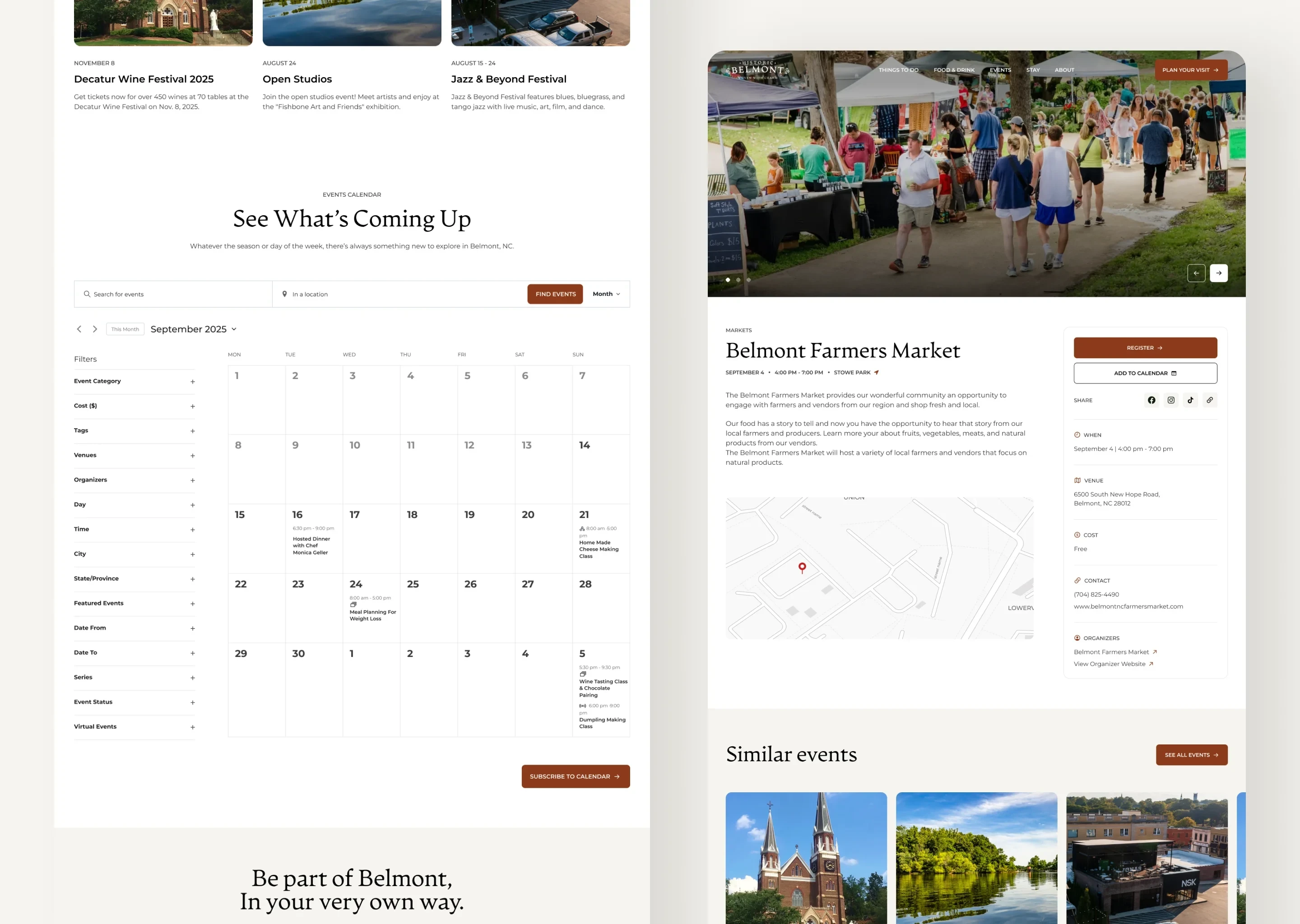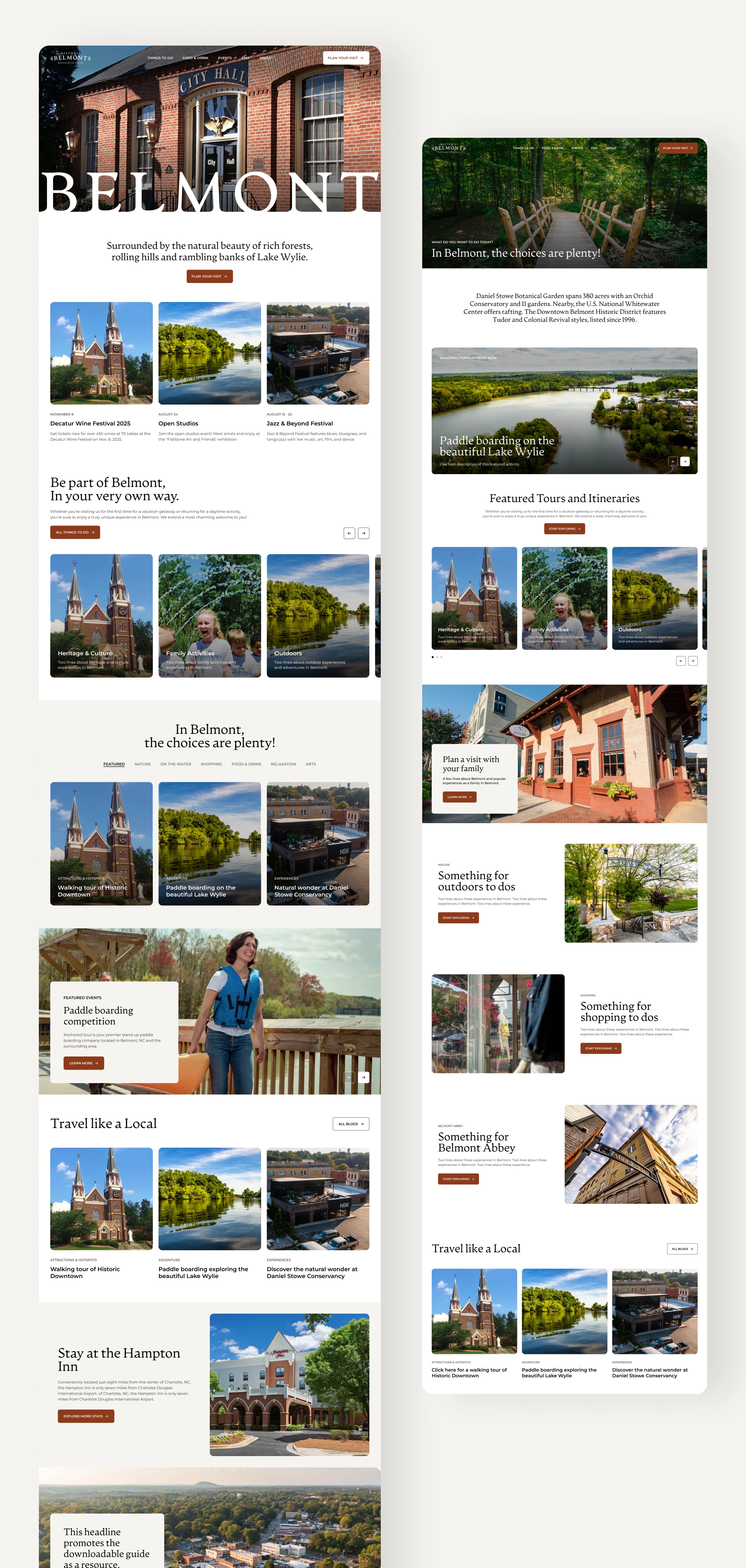 It also includes deeper storytelling pages (like Belmont’s history) and practical trip-planning content, all aimed at turning browsing into real-world actions like planning a visit, exploring events, and discovering local places.
