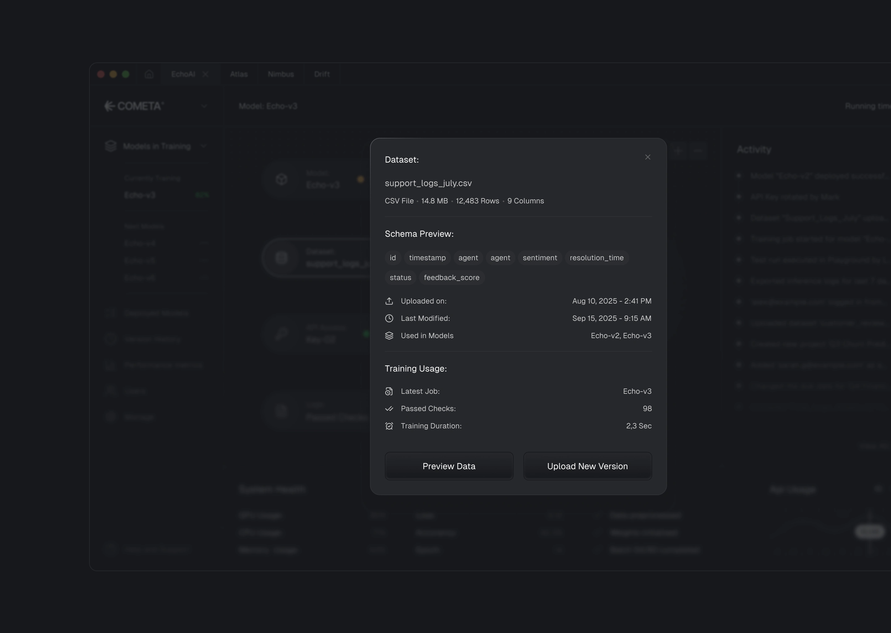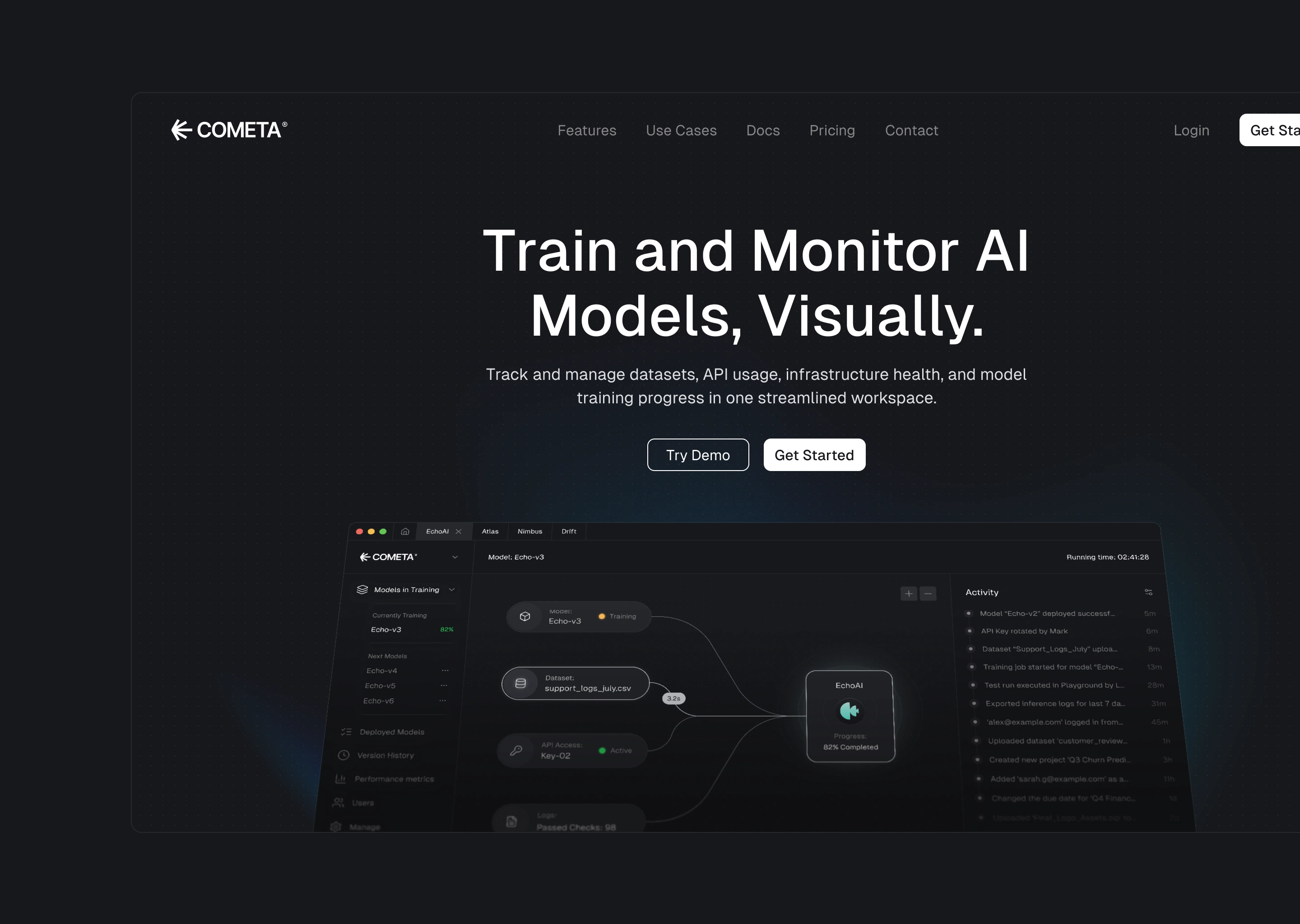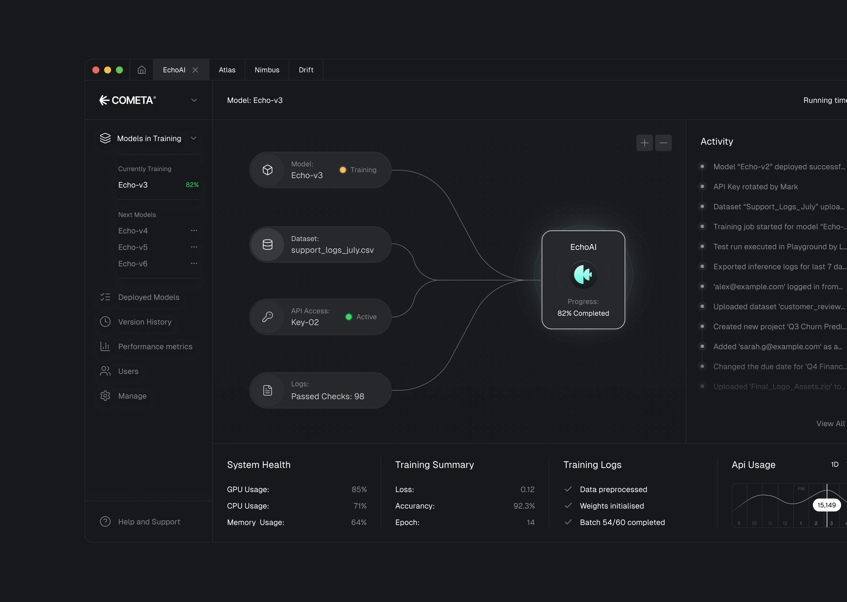 Designed Cometa’s logo and AI dev dashboard with clear layouts, unified datasets, models, API usage, and logs for an intuitive dev experience.