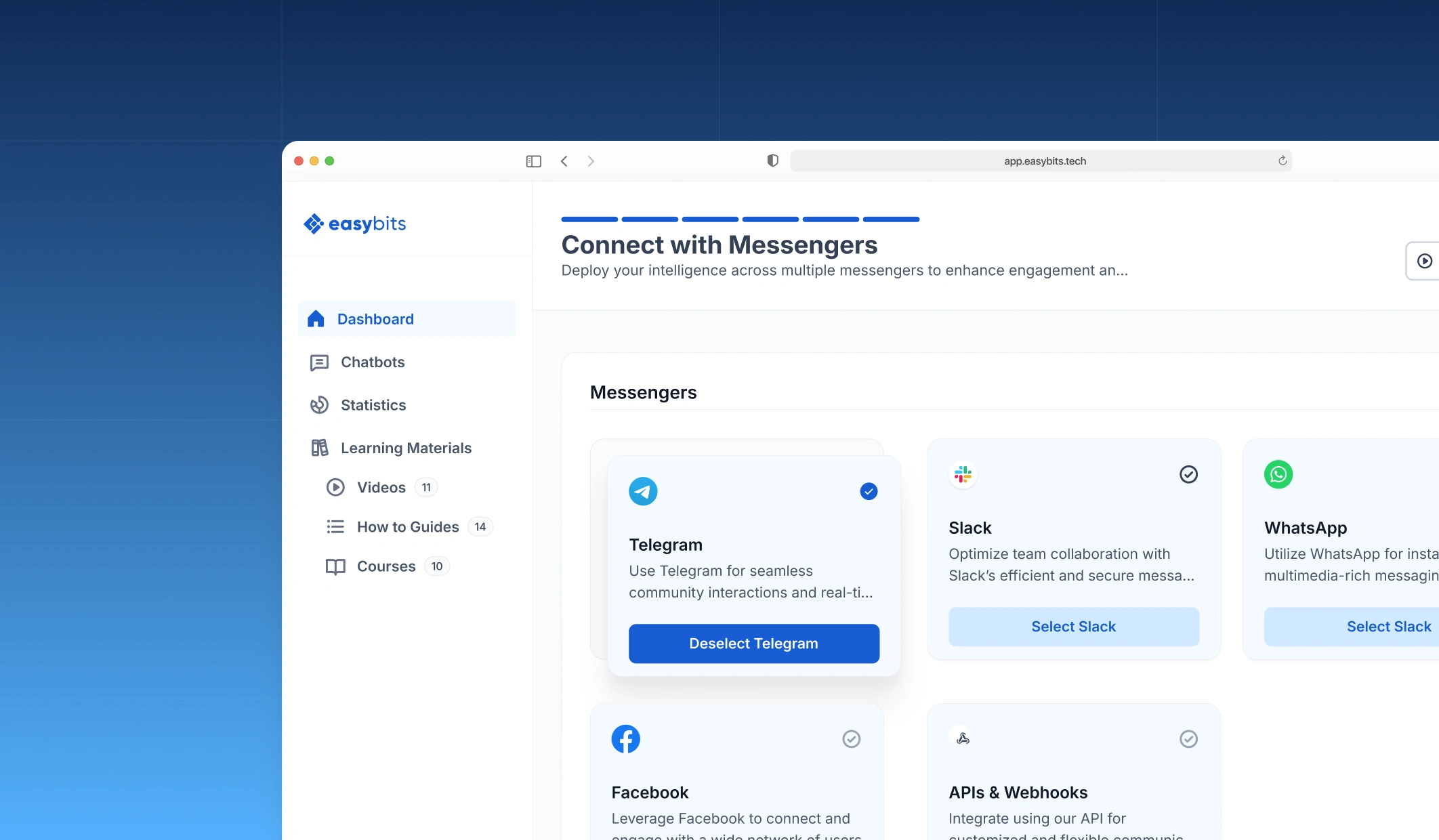 easybits powerful and custom-built AI infrastructure. The chatbots would be trained by the users with own data, have granular brand voice and tone control and seamlessly integrate it with 3rd-party apps like Telegram, Whatsapp, Facebook or embed anywhwere. Our main goal was to make AI accessible, help easybits showcase its infrastructure capabilities and eventually raise funds.