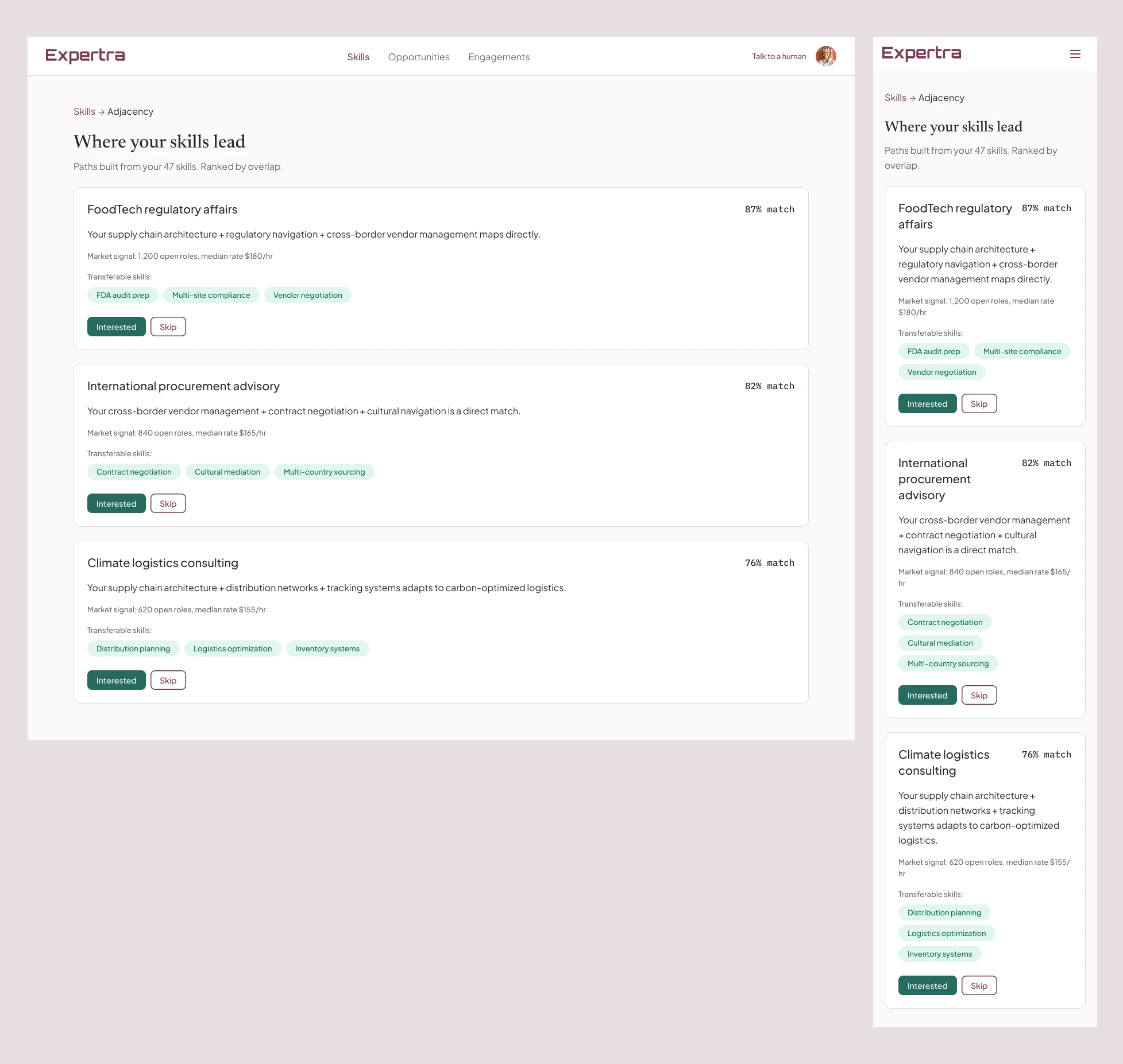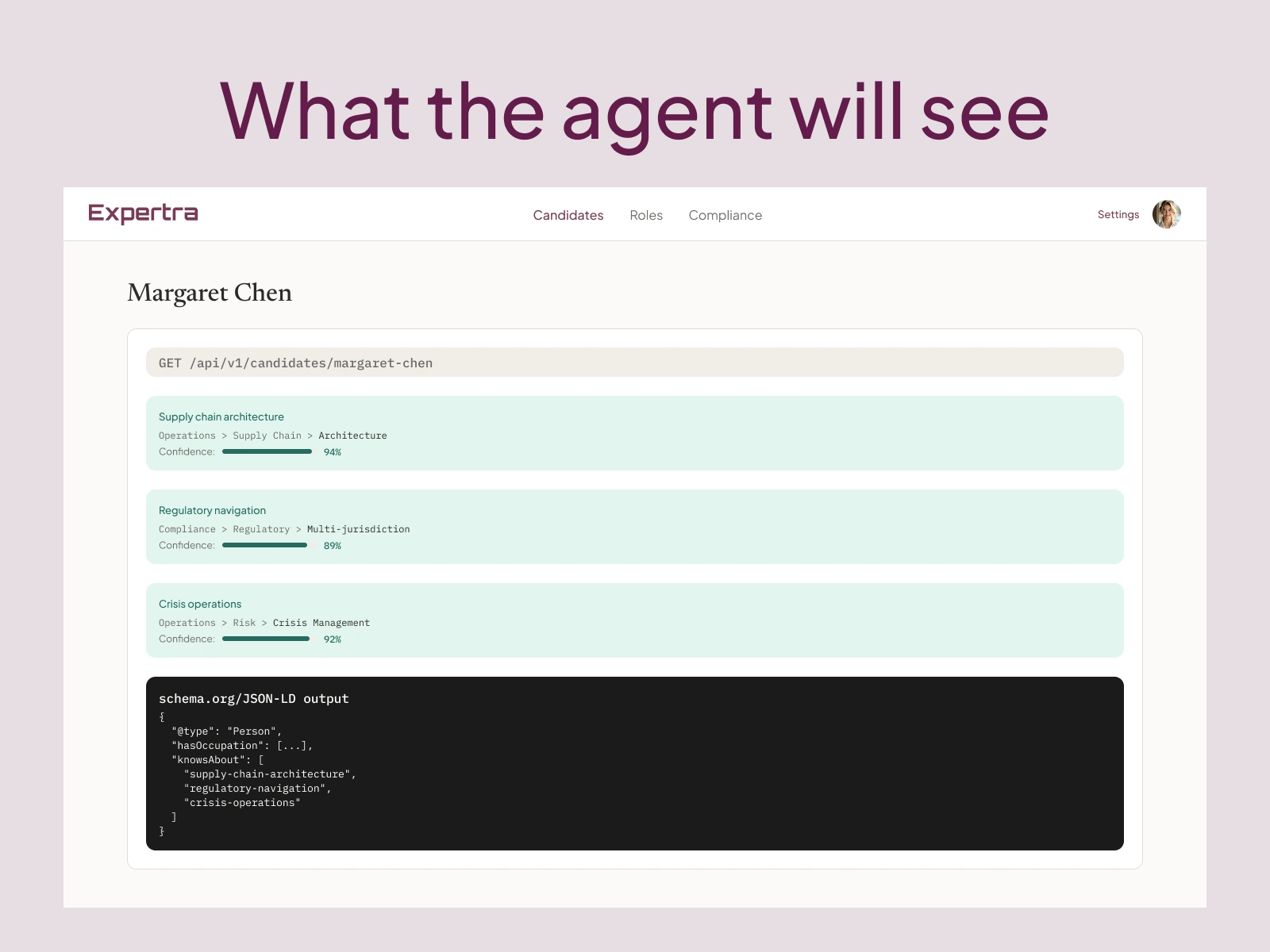 I chose dual-audience architecture: one profile, two representations. Human recruiters see narrative and context. Their agents see structured skill graphs with taxonomy paths, confidence scores, and schema.org markup. Same data, different surfaces. Structured data forces clarity, which improves human readability too.