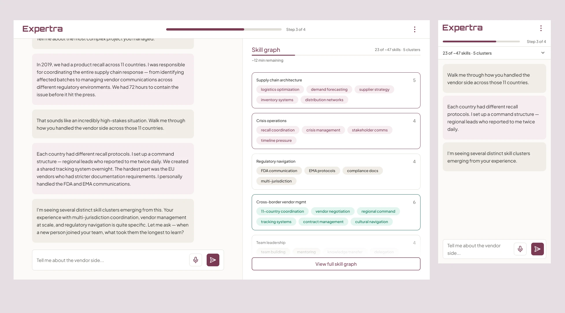 Margaret Chen, 56. Laid off after 23 years as VP Supply Chain in pharma. Applied to 80+ jobs, got 3 callbacks. She managed product recalls across 11 countries but doesn't call that "crisis management." She calls it Tuesday. She has skills in crisis ops, FDA compliance, vendor networking, team leadership, and more, but she doesn't recognize them as distinct skills.