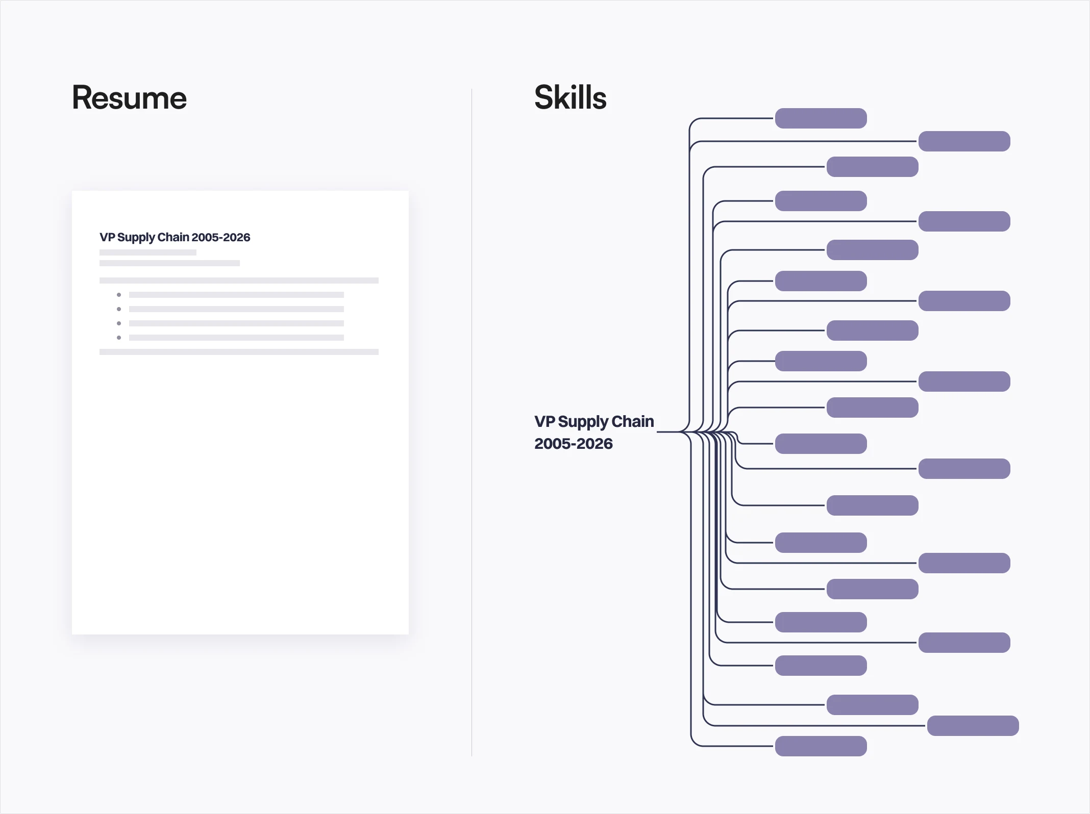 "VP Supply Chain, 2005-2024." That's the whole picture a resume gives. Everything else disappears: the 11-country vendor network, the FDA recall managed without a citation, the team built from scratch. Eraut's research found that workers can't articulate skills they've never been asked about. O*NET maps 19,000+ task statements. A 25-year career contains hundreds of micro-skills. None fit in a job title.