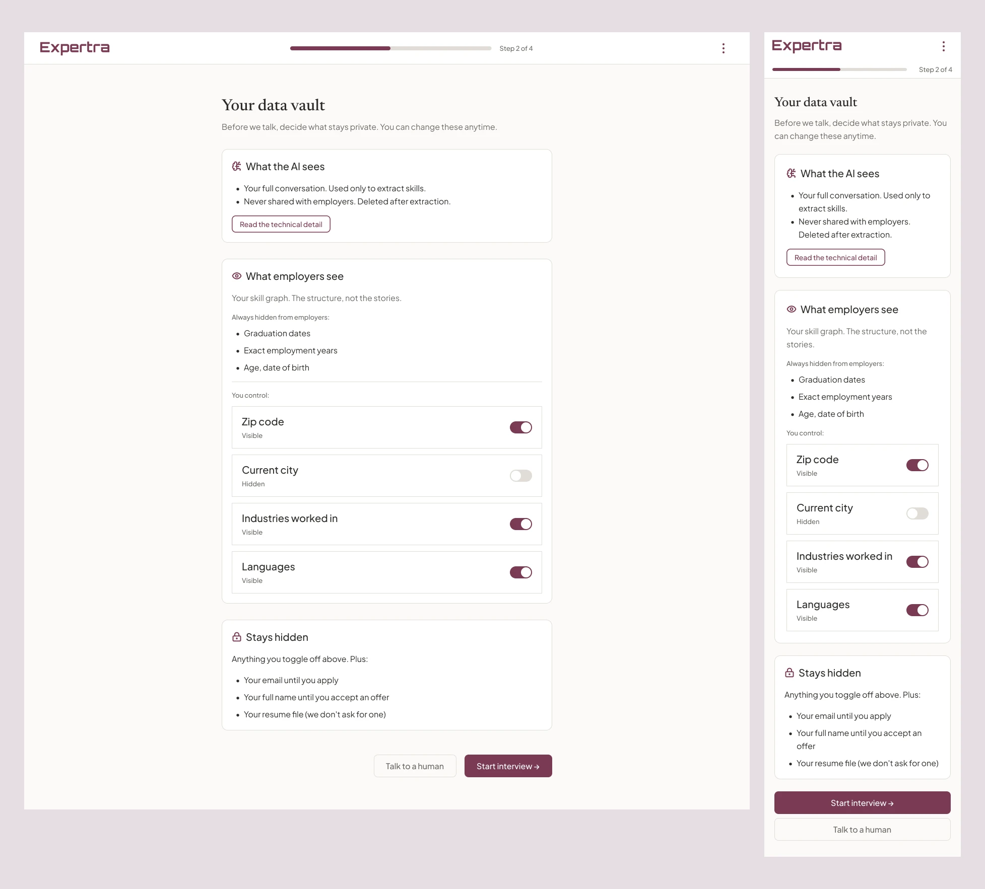 I chose a data vault with three visibility layers, shown before the interview starts. What AI sees: full narrative, used for skill extraction only, never shared. What employers see: skill graph, no graduation dates, no exact years, proxy scrubbing active by default. What stays hidden: anything the user toggles off. "Talk to a human" button visible at every stage.