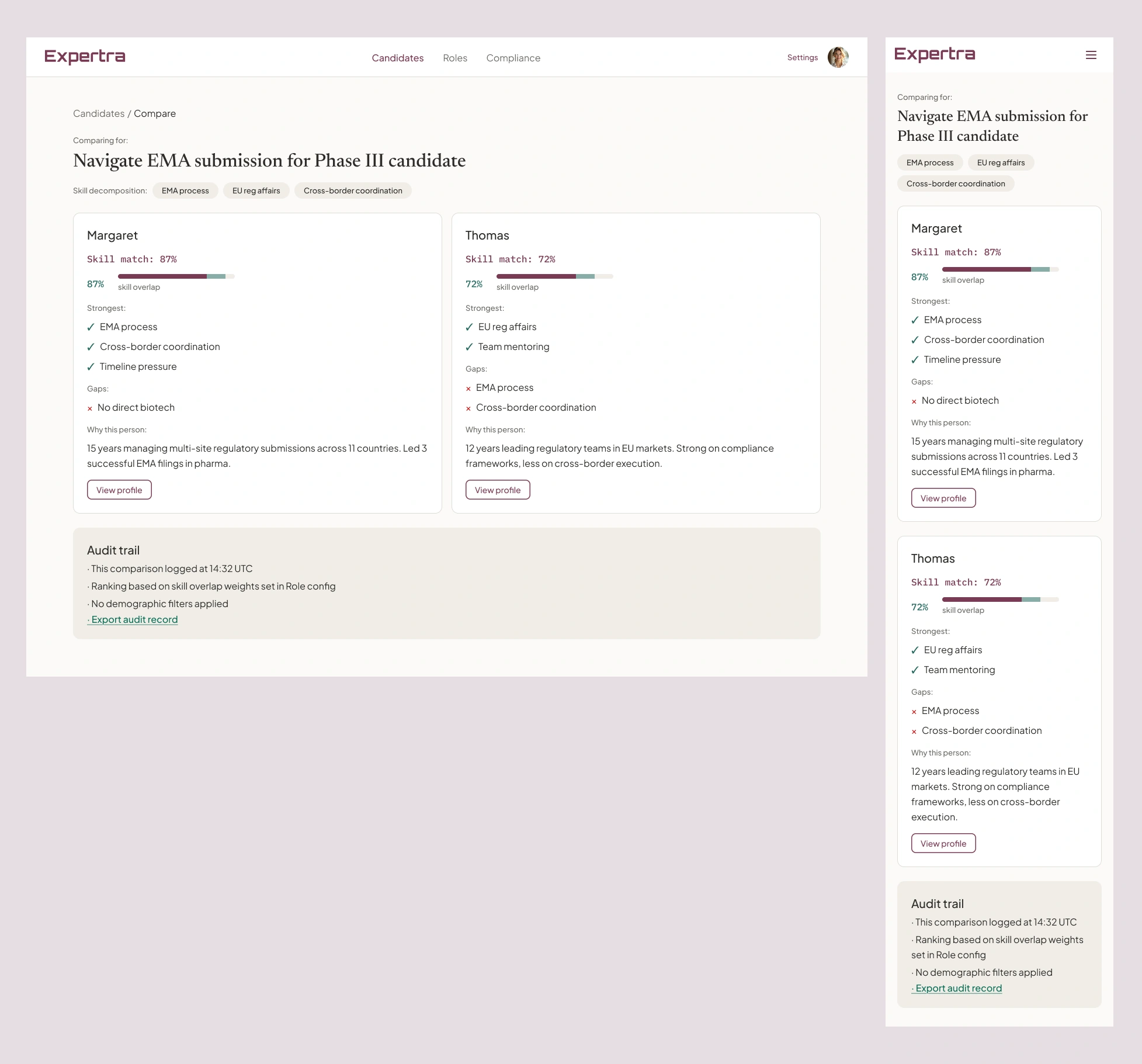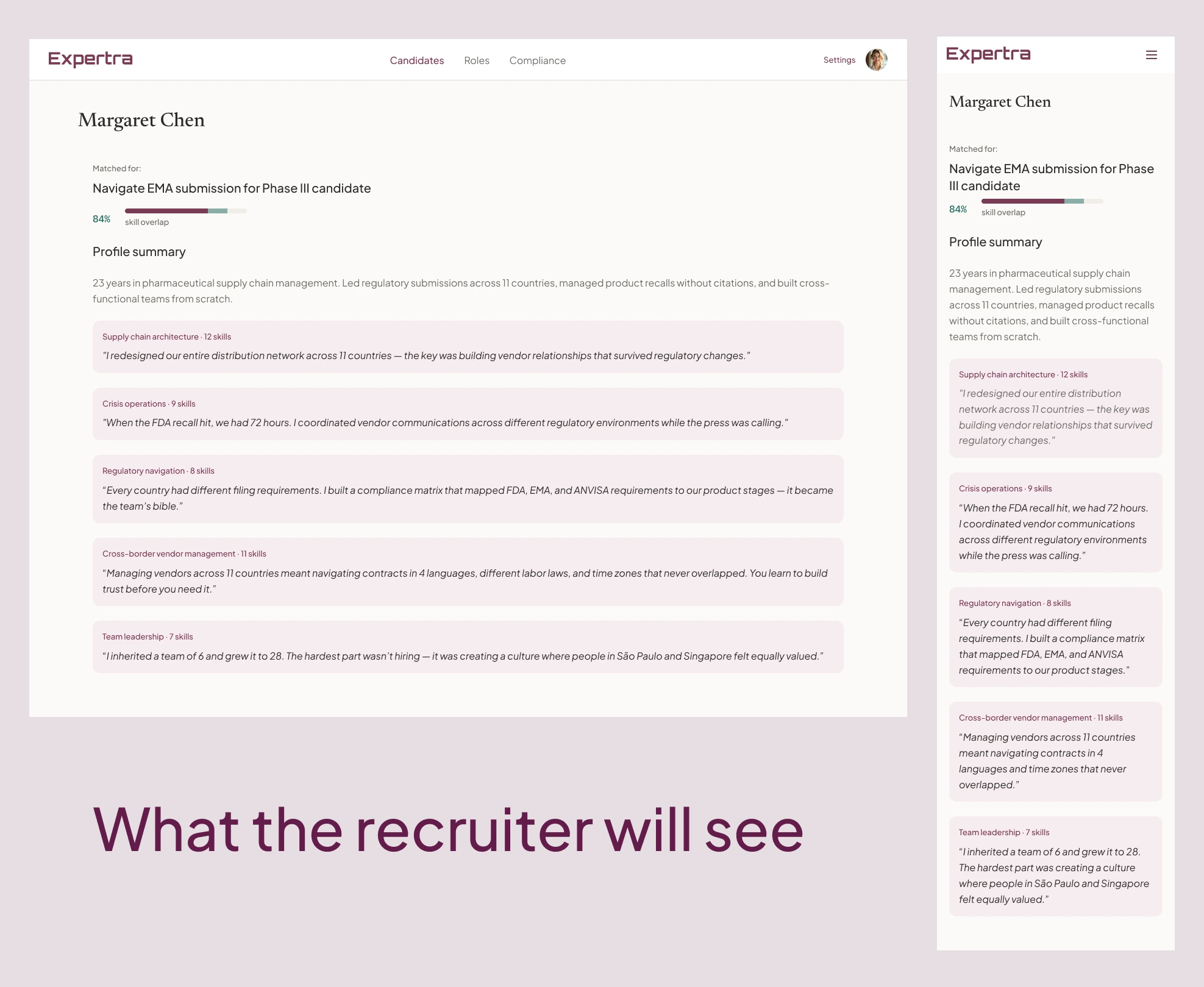 This decision extends the trust architecture from Decision 3 to a second user. Margaret's data vault governs both views. She also sees a log of every agent interaction, who accessed her profile, what they parsed, and what their recruiter saw.