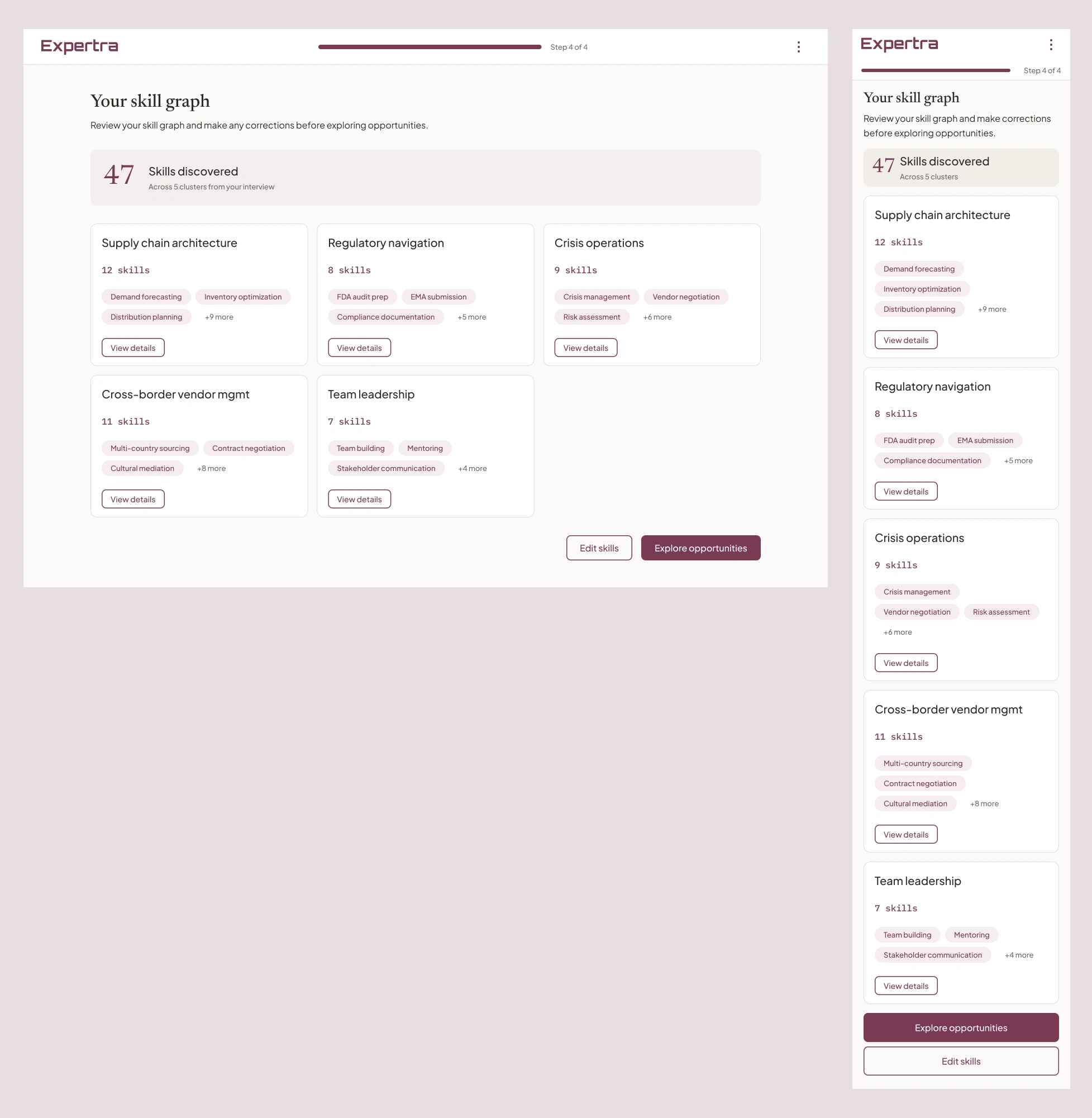 I chose three levels. Snapshot: 5 cluster cards, readable in 10 seconds. Cluster detail: tap any card, see individual skills with interview context, edit what feels wrong. Full graph: interactive visualization with timeline. NNG's 87 design guidelines for older adults and a systematic review of 27 evidence-based recommendations both point to progressive disclosure as the way to manage complexity without hiding value.
