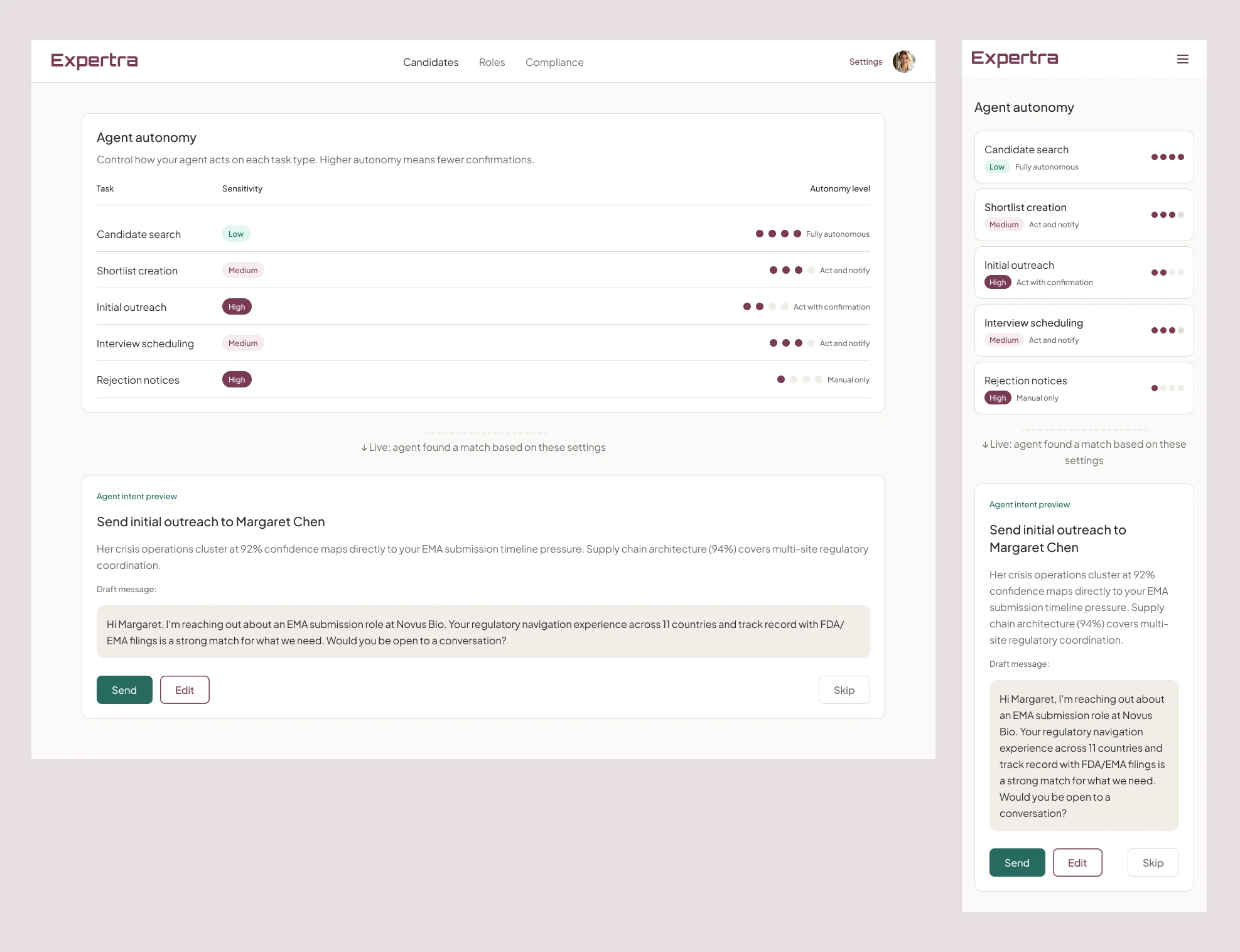 On the company side, the recruiter sets agent autonomy per task type: search freely, confirm before contacting. When the agent finds a match, an intent preview shows the action, the rationale (tied to confidence scores), and a draft message. Send, edit, or skip.