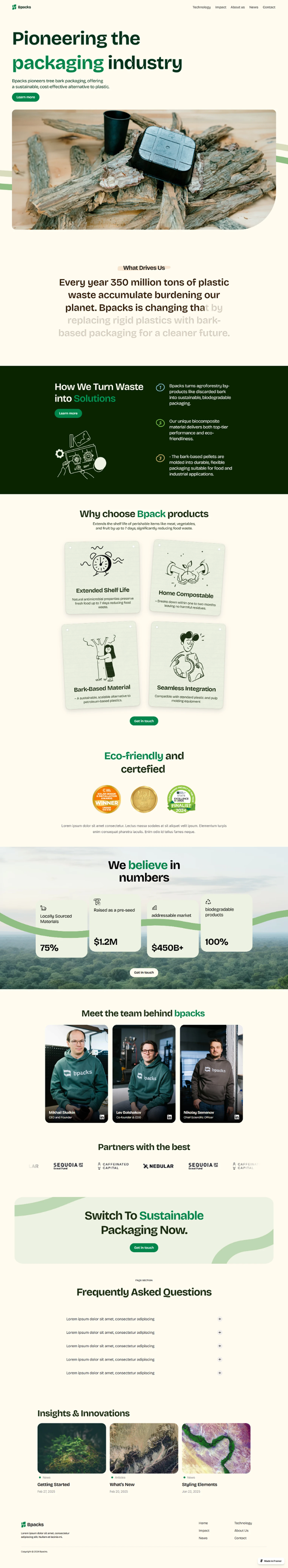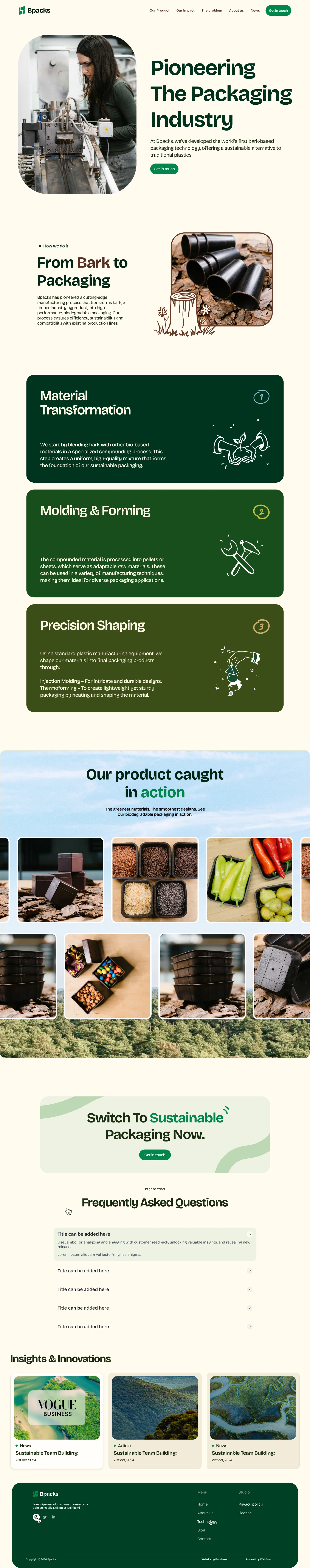 I partnered with Bpacks to design and build a modern, high-impact website that communicates their commitment to sustainability, material innovation, and environmental responsibility. The aim was to position Bpacks as a leading innovator in green packaging — appealing to manufacturers, retailers, investors, and eco-conscious consumers. Together we refined the site narrative, user experience, and visual identity to clearly showcase Bpacks’ unique bark-based technology and mission to reshape how packaging is made.