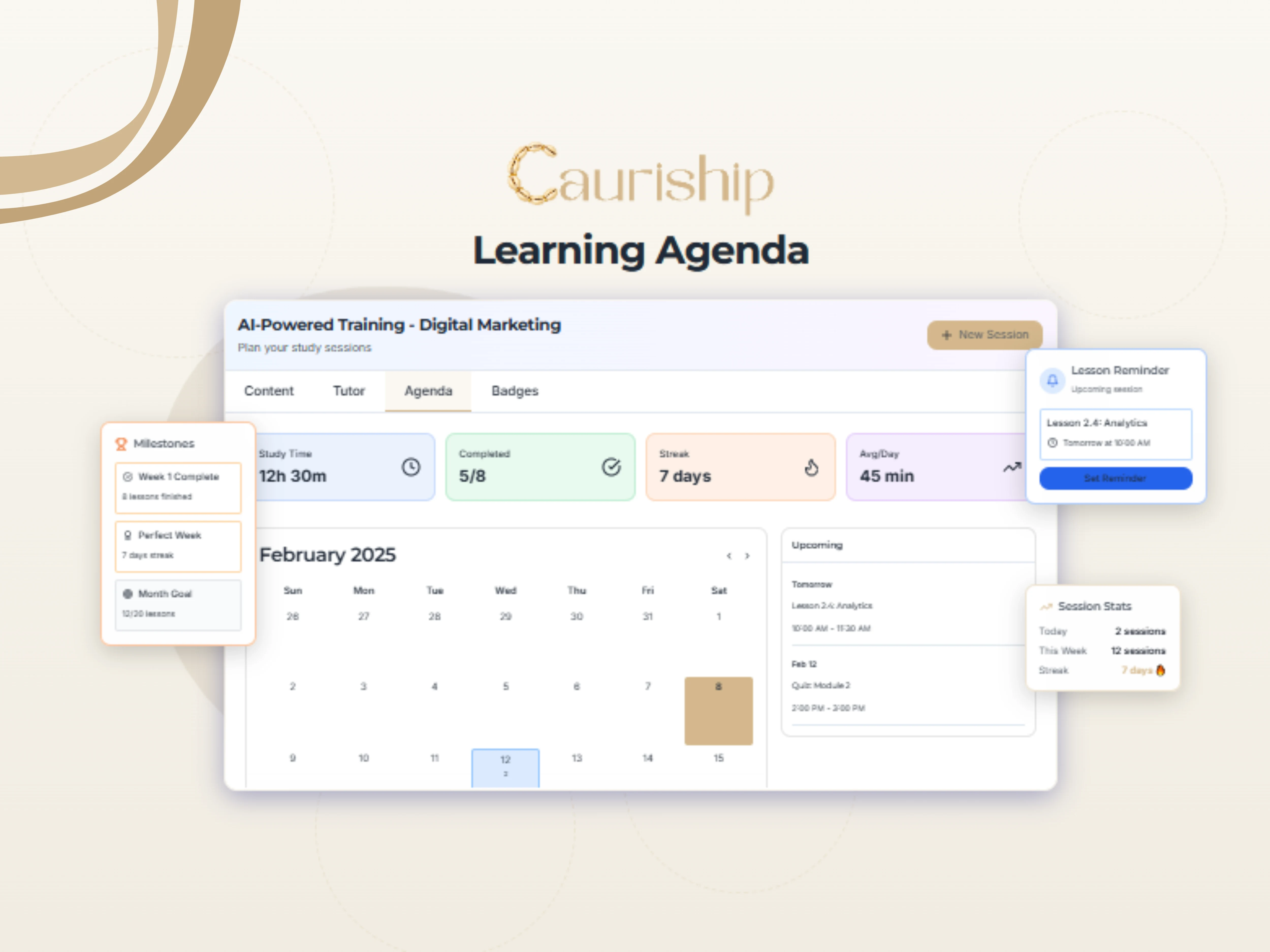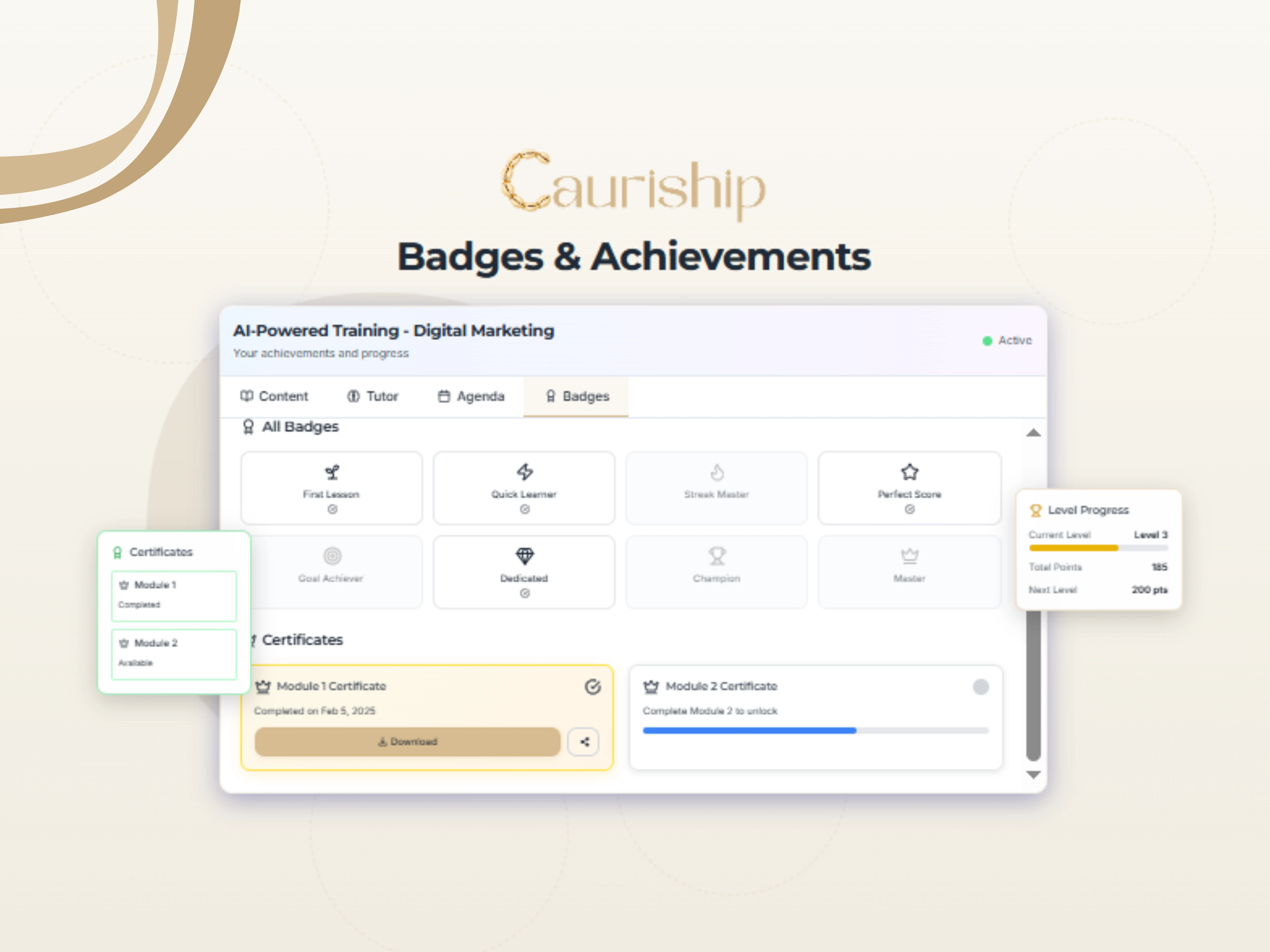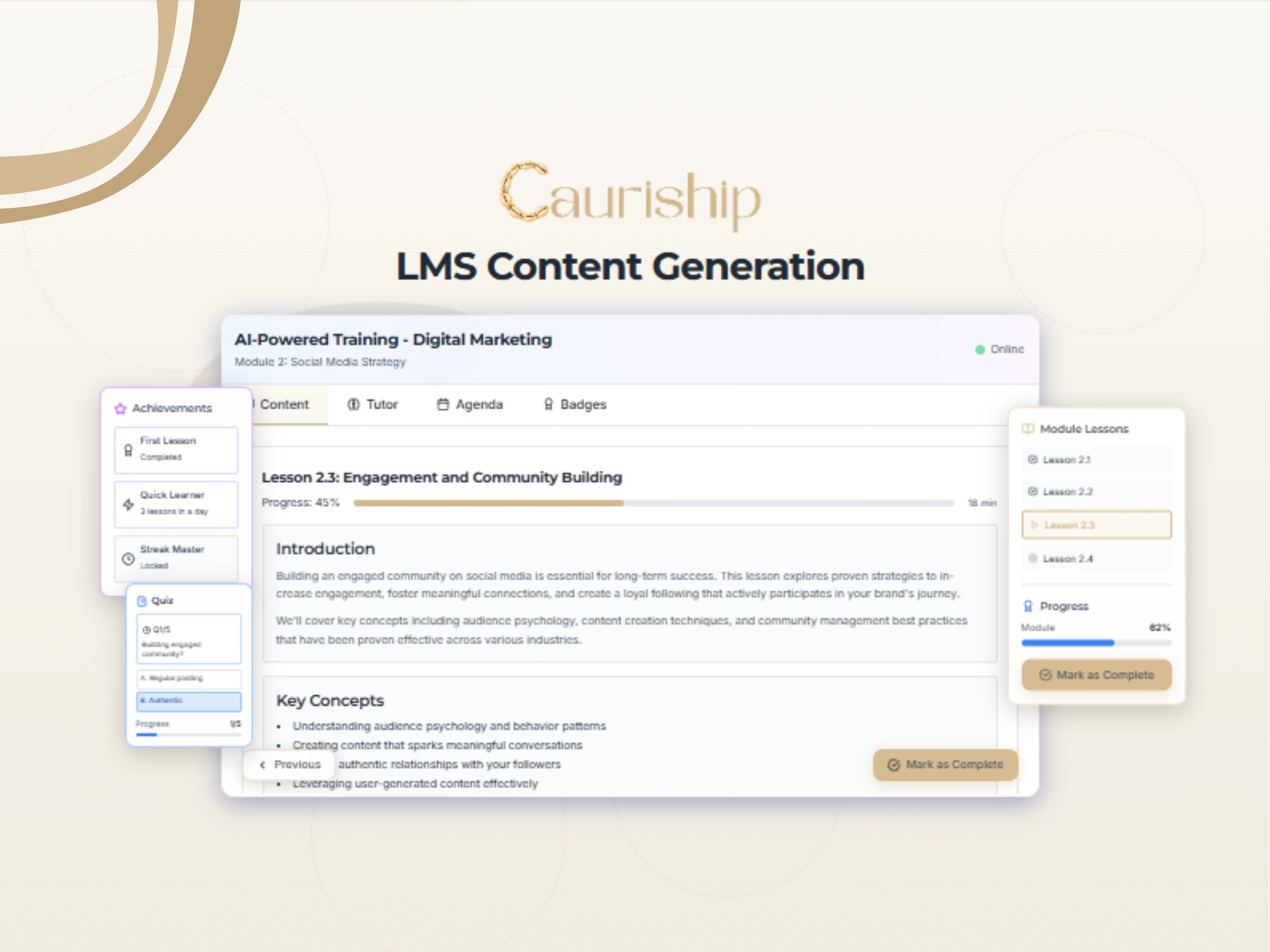 Based on your diagnostic, Cauriship generates a custom learning path inside our native LMS:
