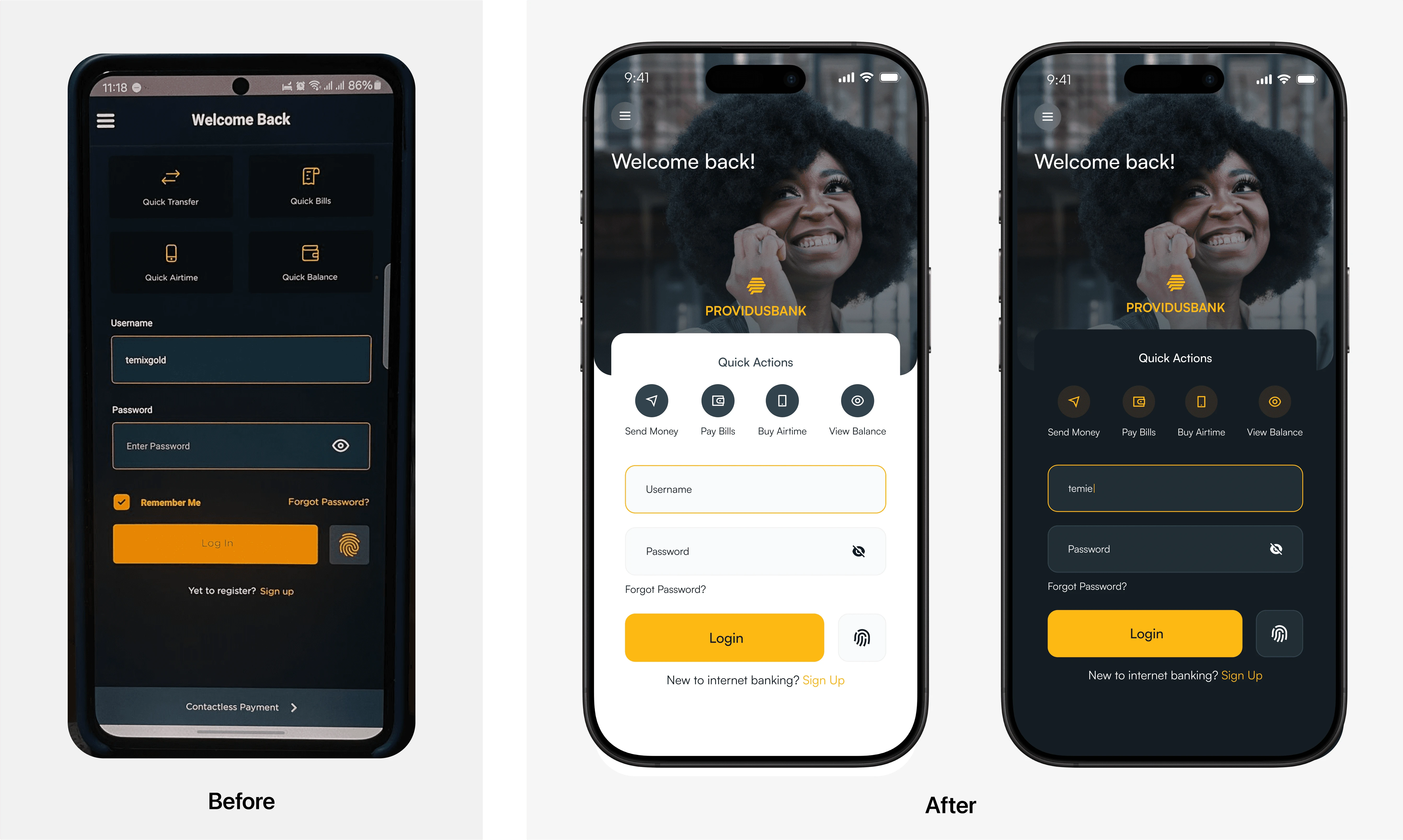 Providus Bank’s onboarding and mobile experience presented major usability challenges. Users were forced to start registration on the web to obtain a Customer ID before accessing mobile banking.