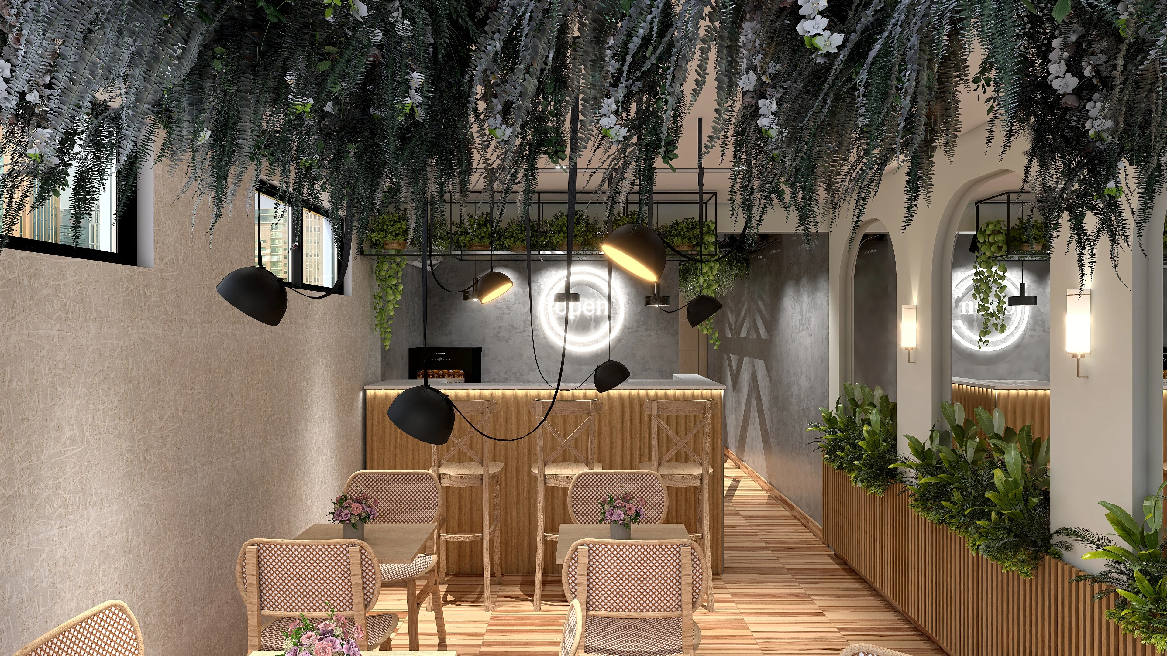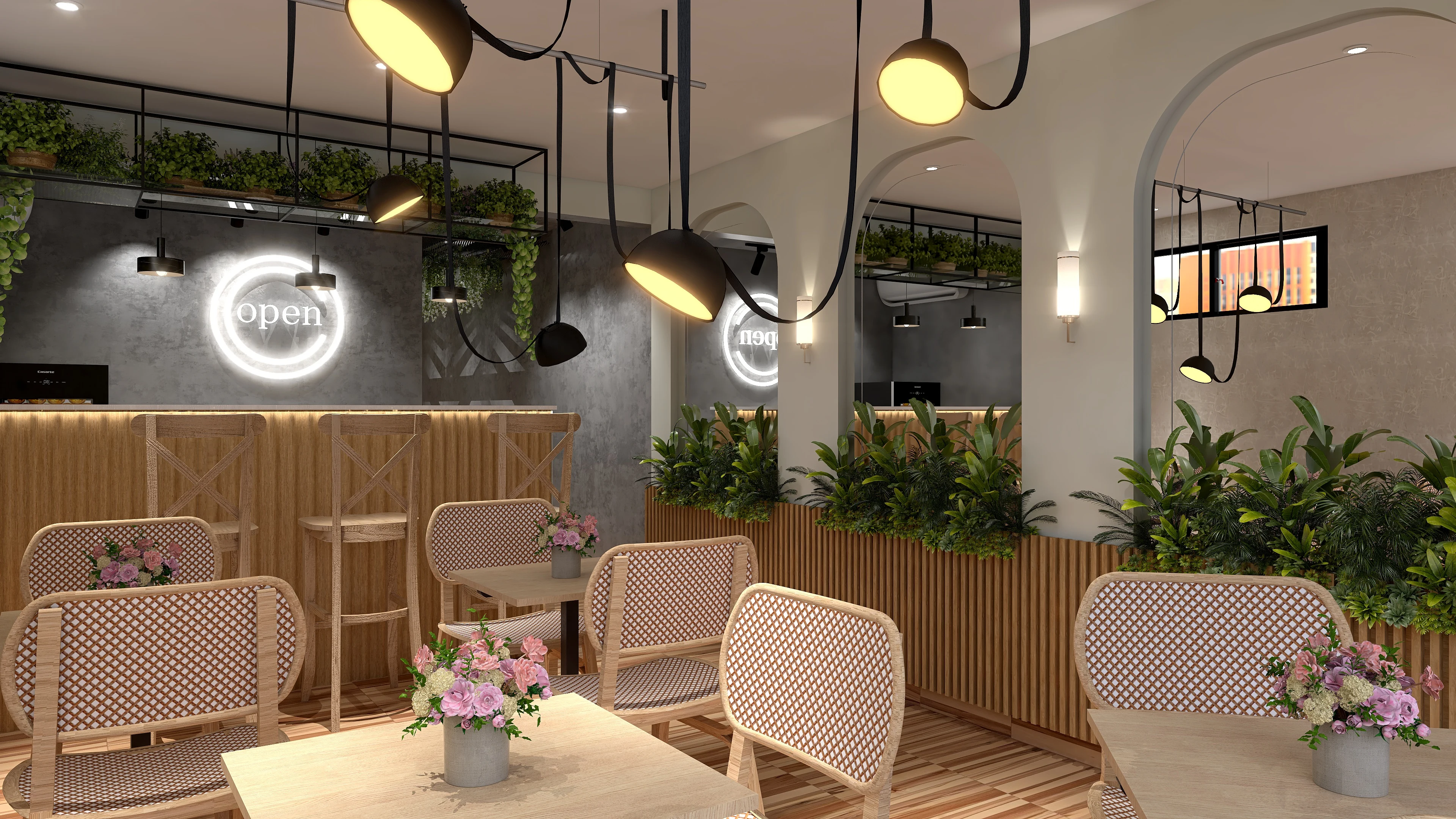 Un restaurante pequeño pero con caracteristicas que lo hacen único porque venden nutrición y salud. Los colores calidos y el juego de materiales naturales hacen del espacio un ambiente fresco junto con los toques de plantas y verdes. Los espejos llaman a ser amplio espacio y visibilidad ilimitaba, las luces determinan el camino para la comidad y vista.