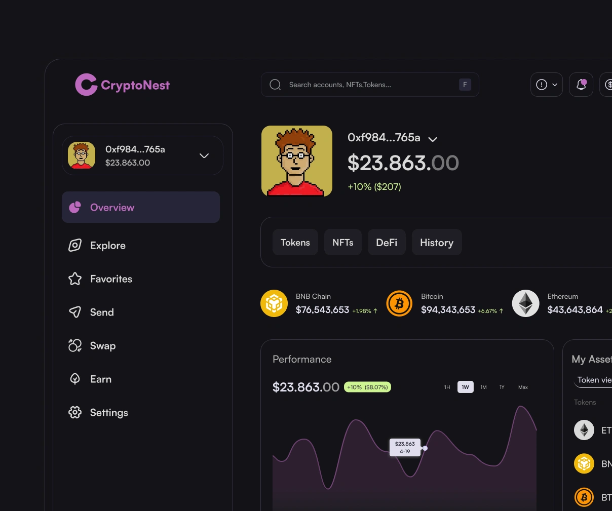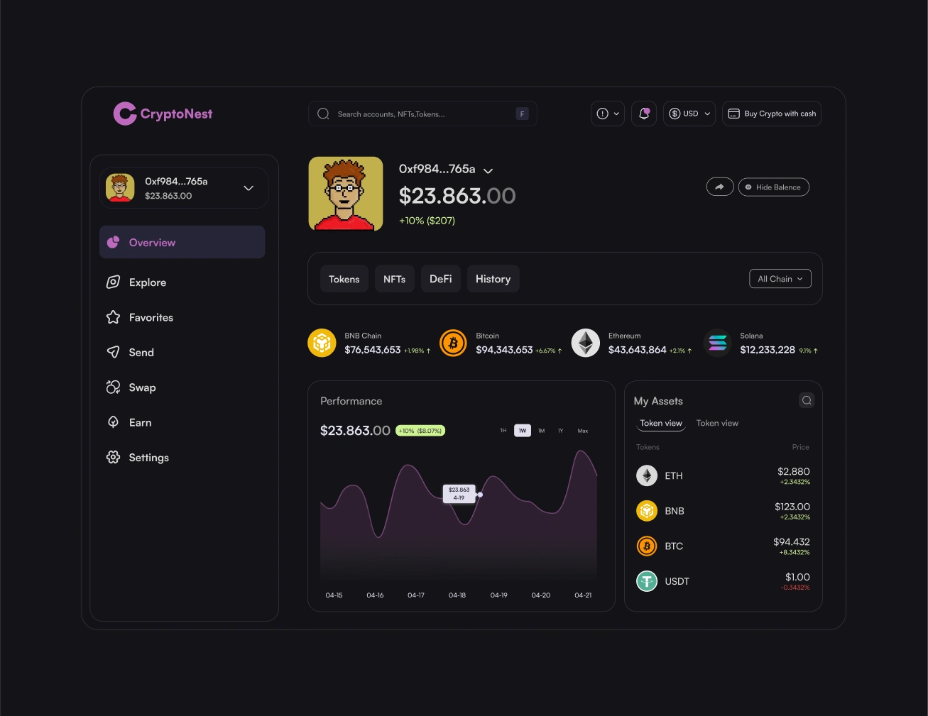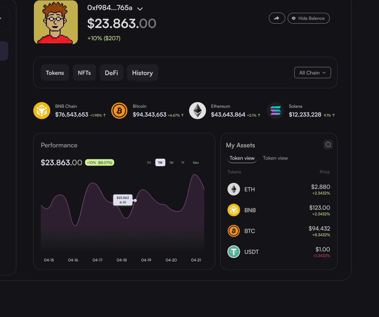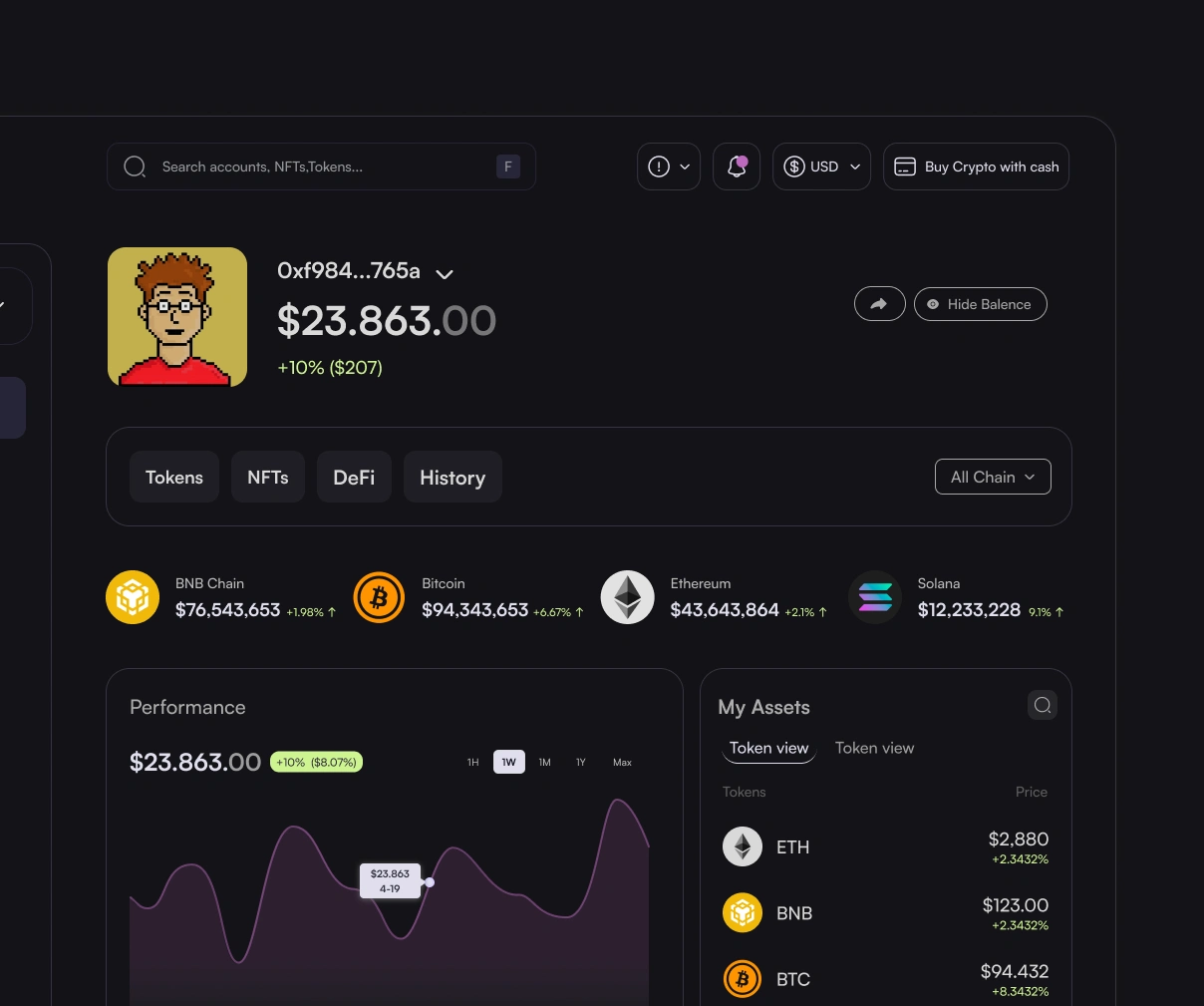 A crypto dashboard that makes managing tokens, NFTs, and DeFi effortless clear, elegant, and built to grow with users across blockchains.