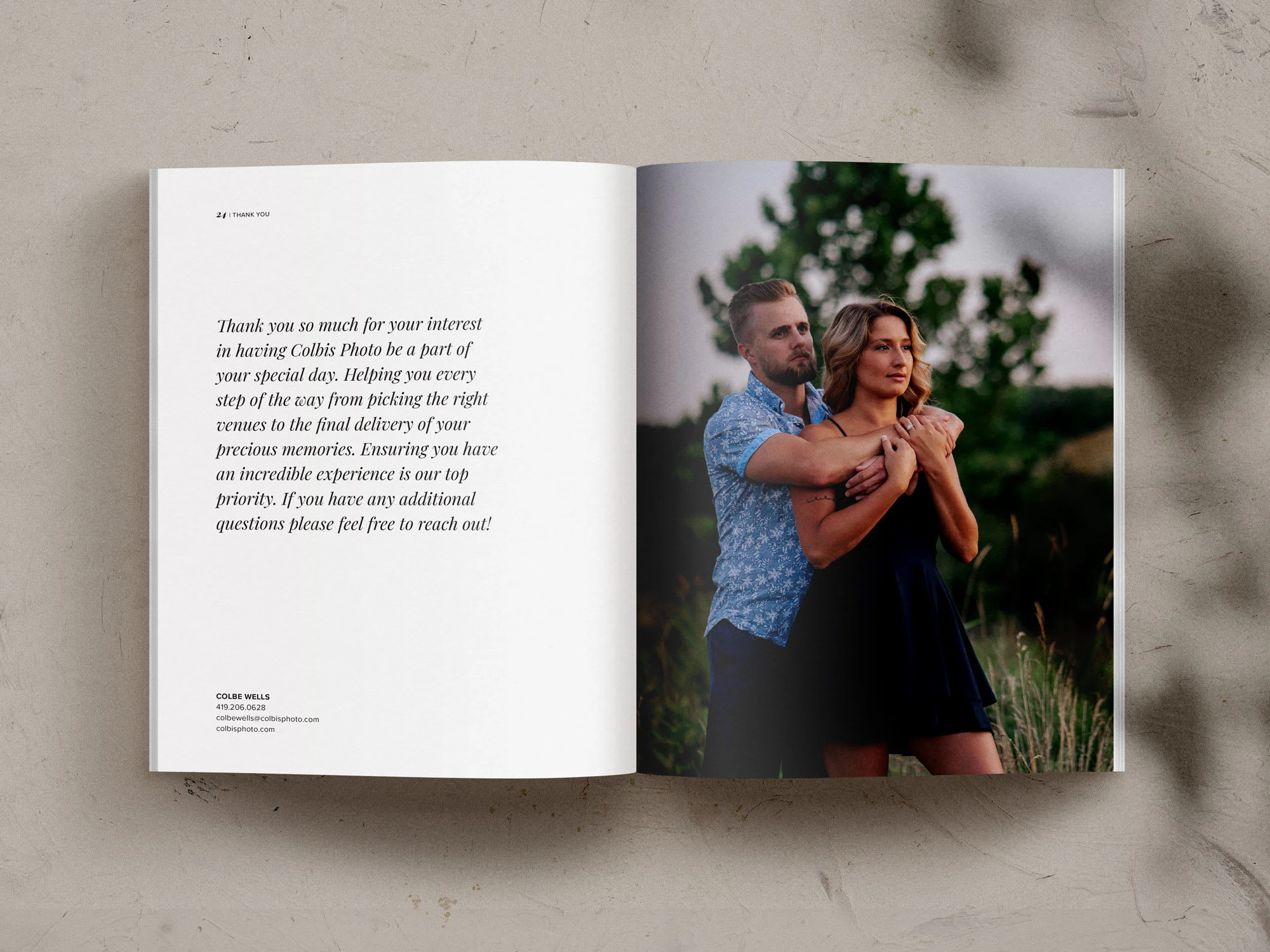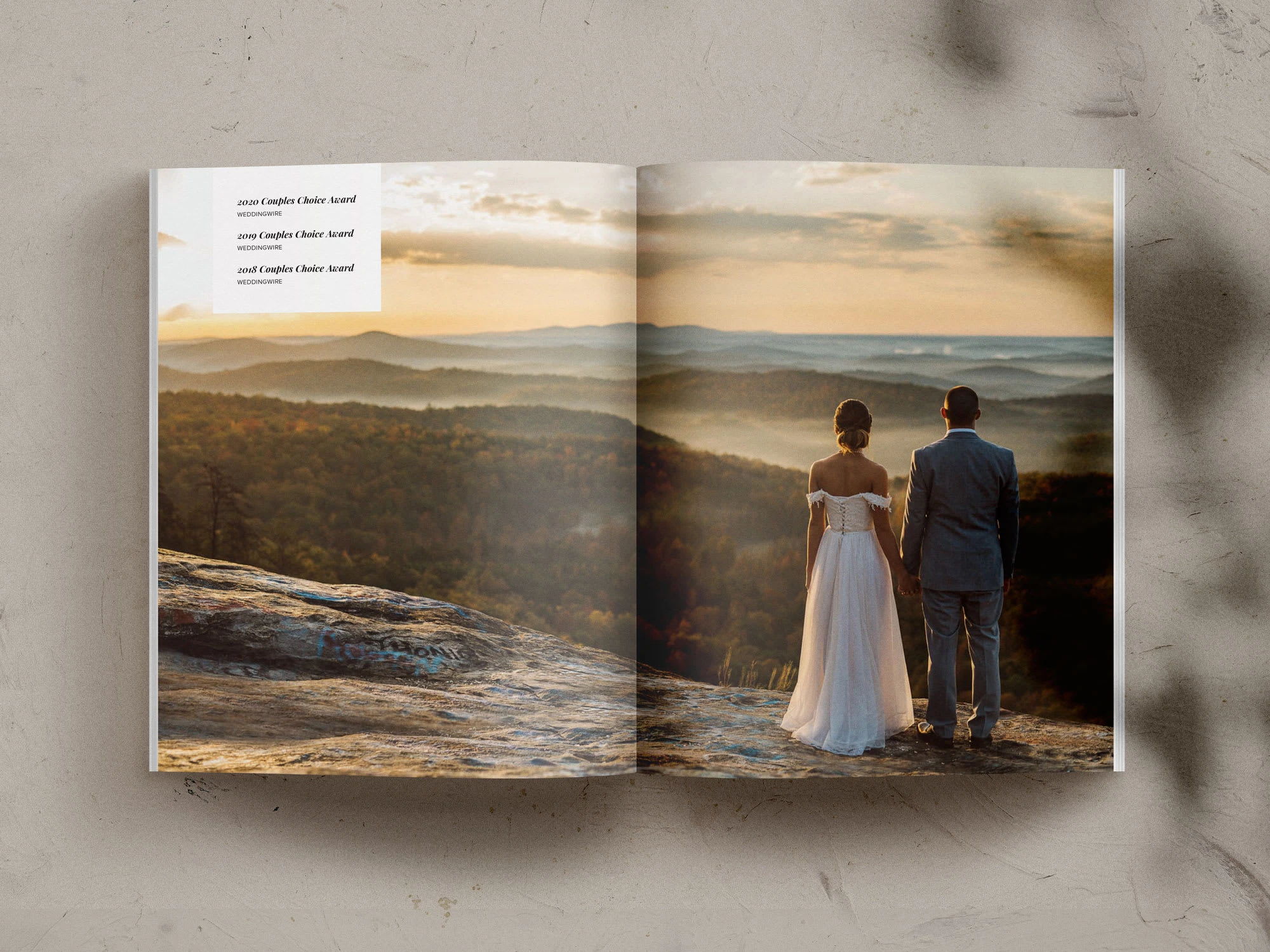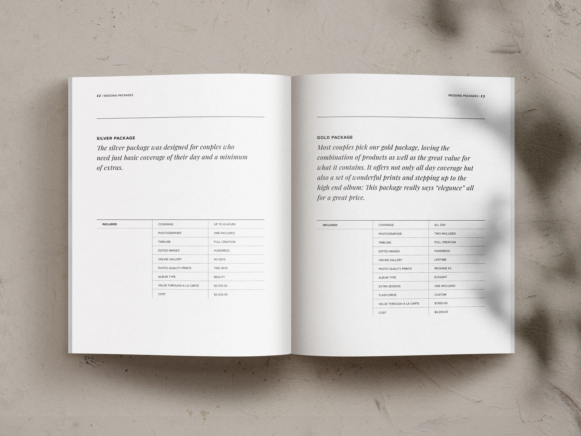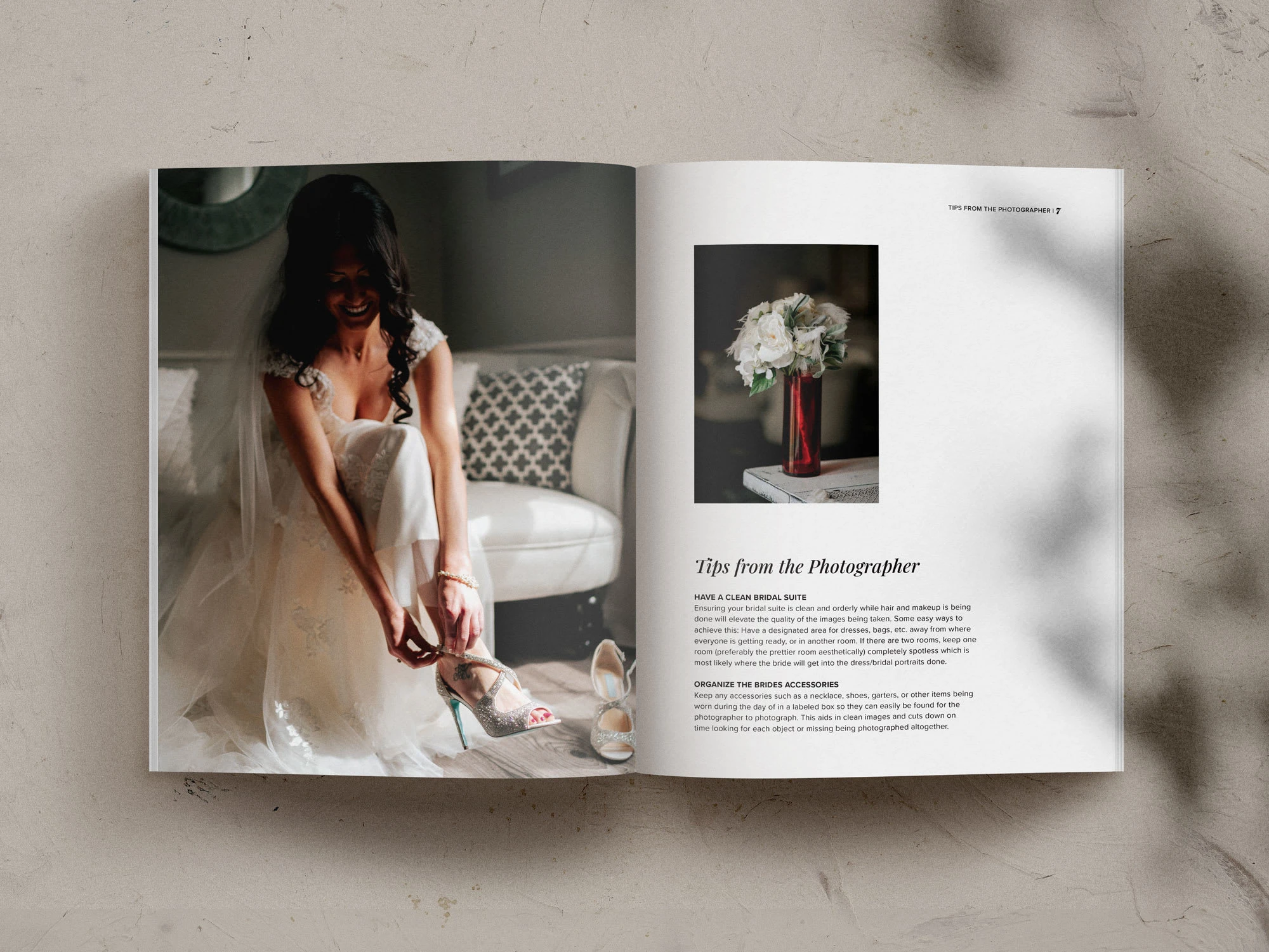 Brochure design for a wedding photographer highlighting services, pricing, and tips. Services included layout design, photo retouching, and print coordination.