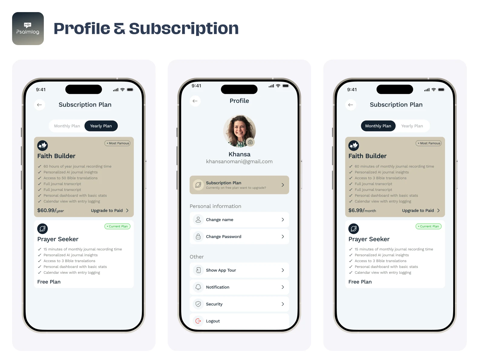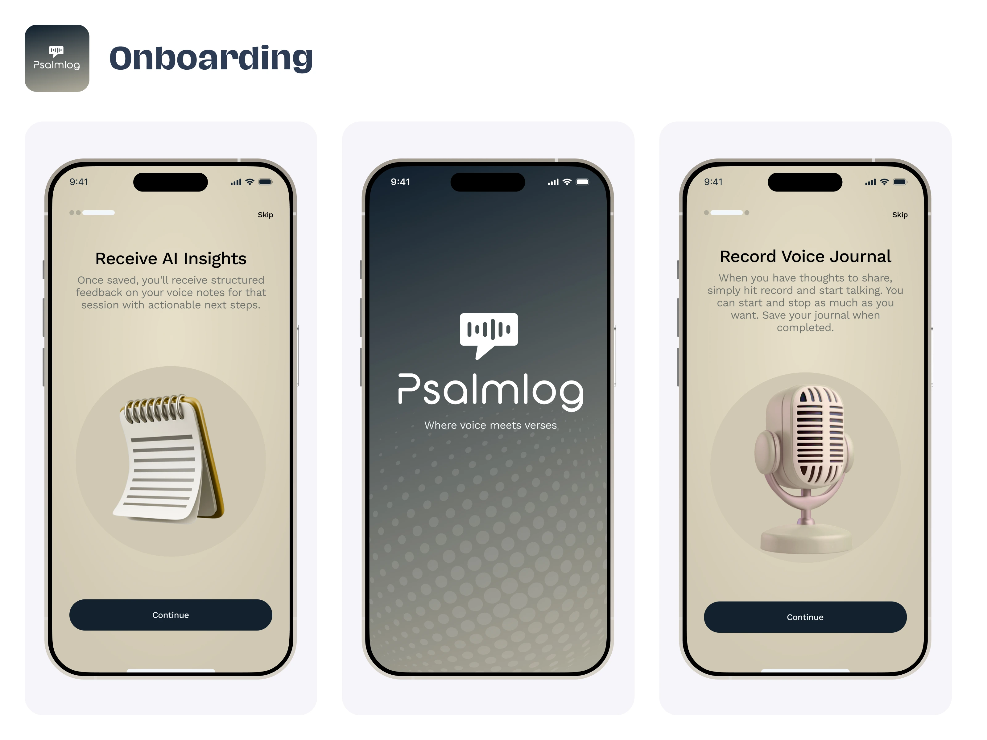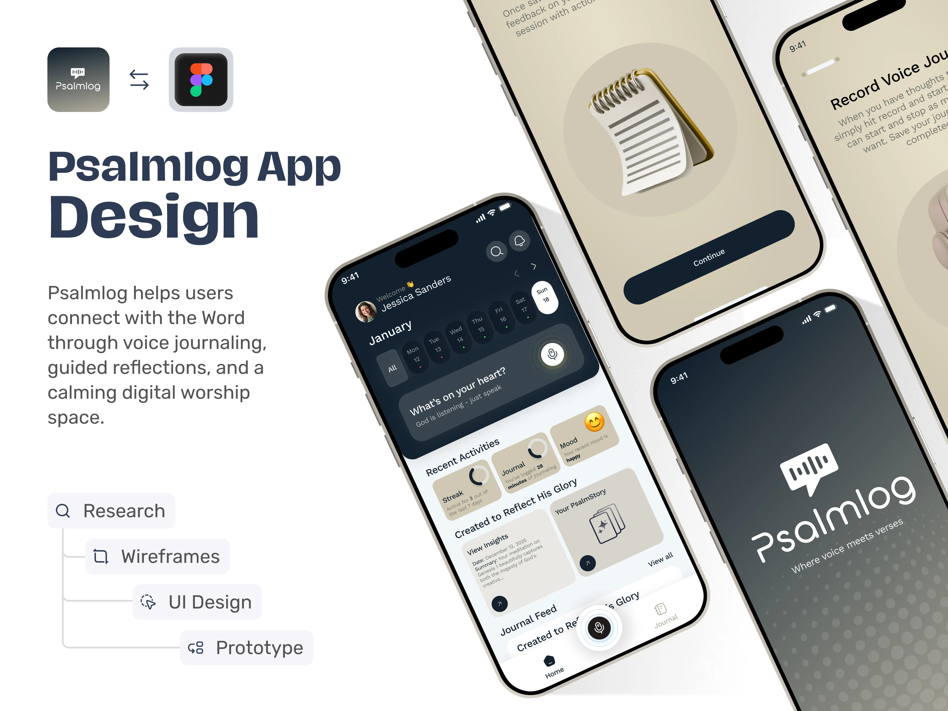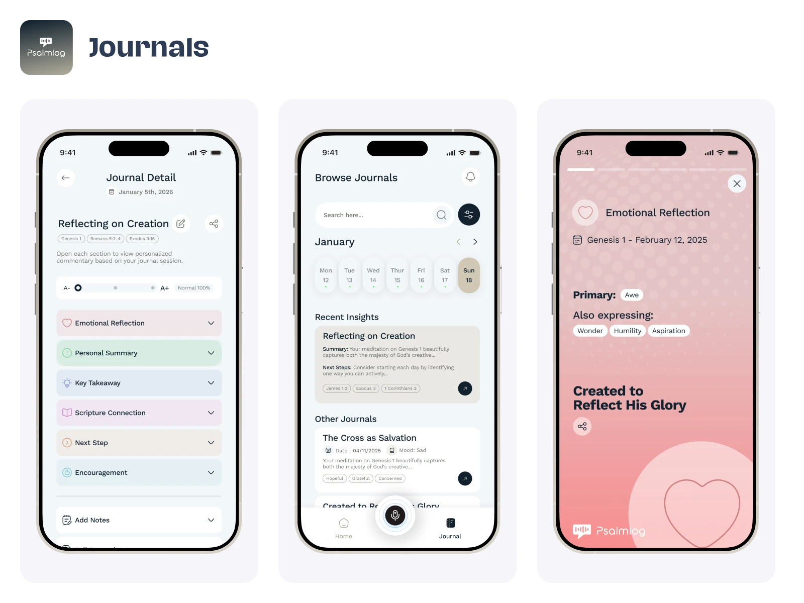 Journal Detail, Browse Journals, and Emotional Reflection screens highlight a sophisticated UI/UX Design for deep personal reflection and AI-powered insights. The Browse screen provides an intuitive, calendar-based navigation system to organize past entries, while the Journal Detail view uses a clean, expandable accordion layout to categorize personal summaries, key takeaways, and next steps.