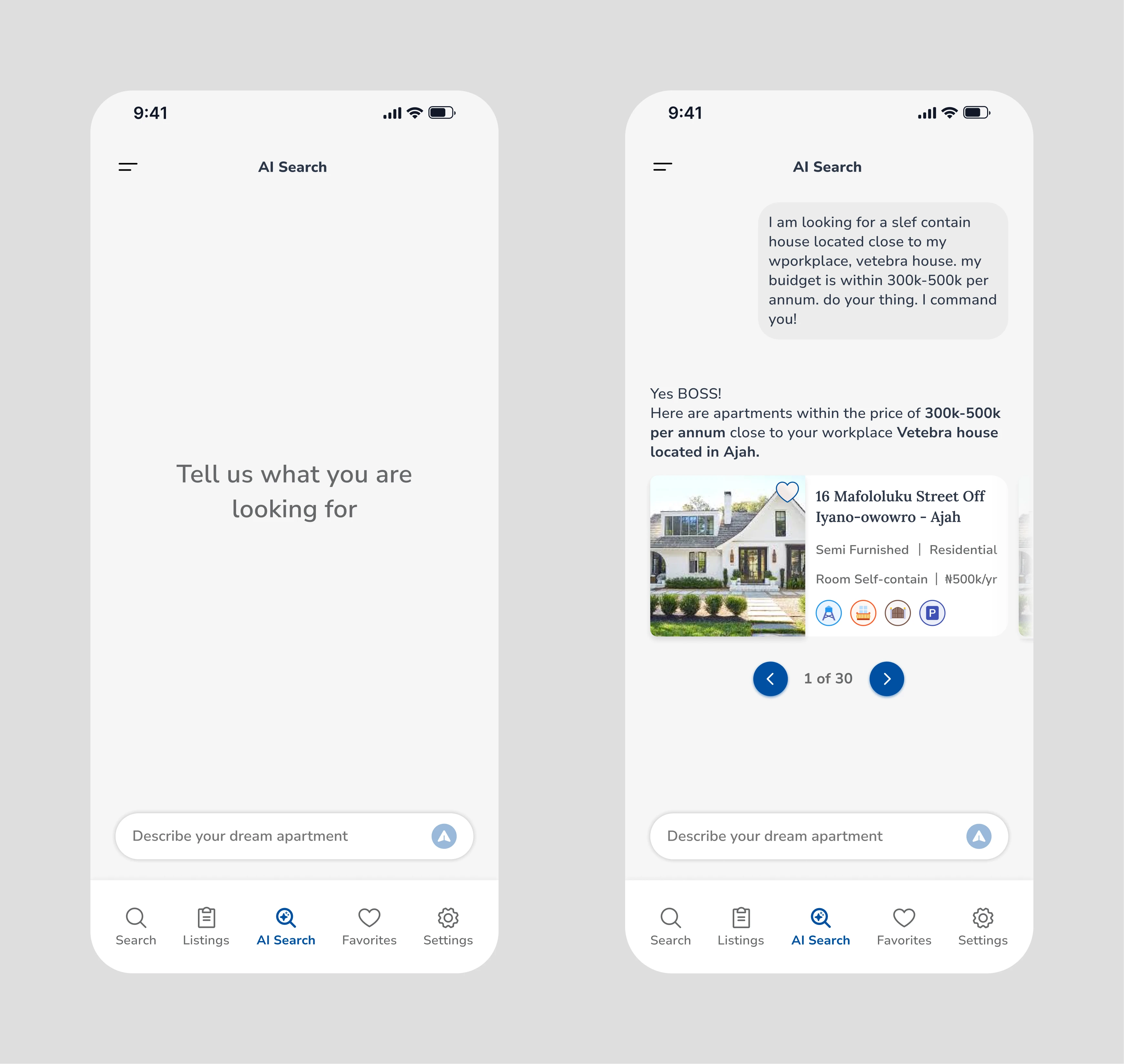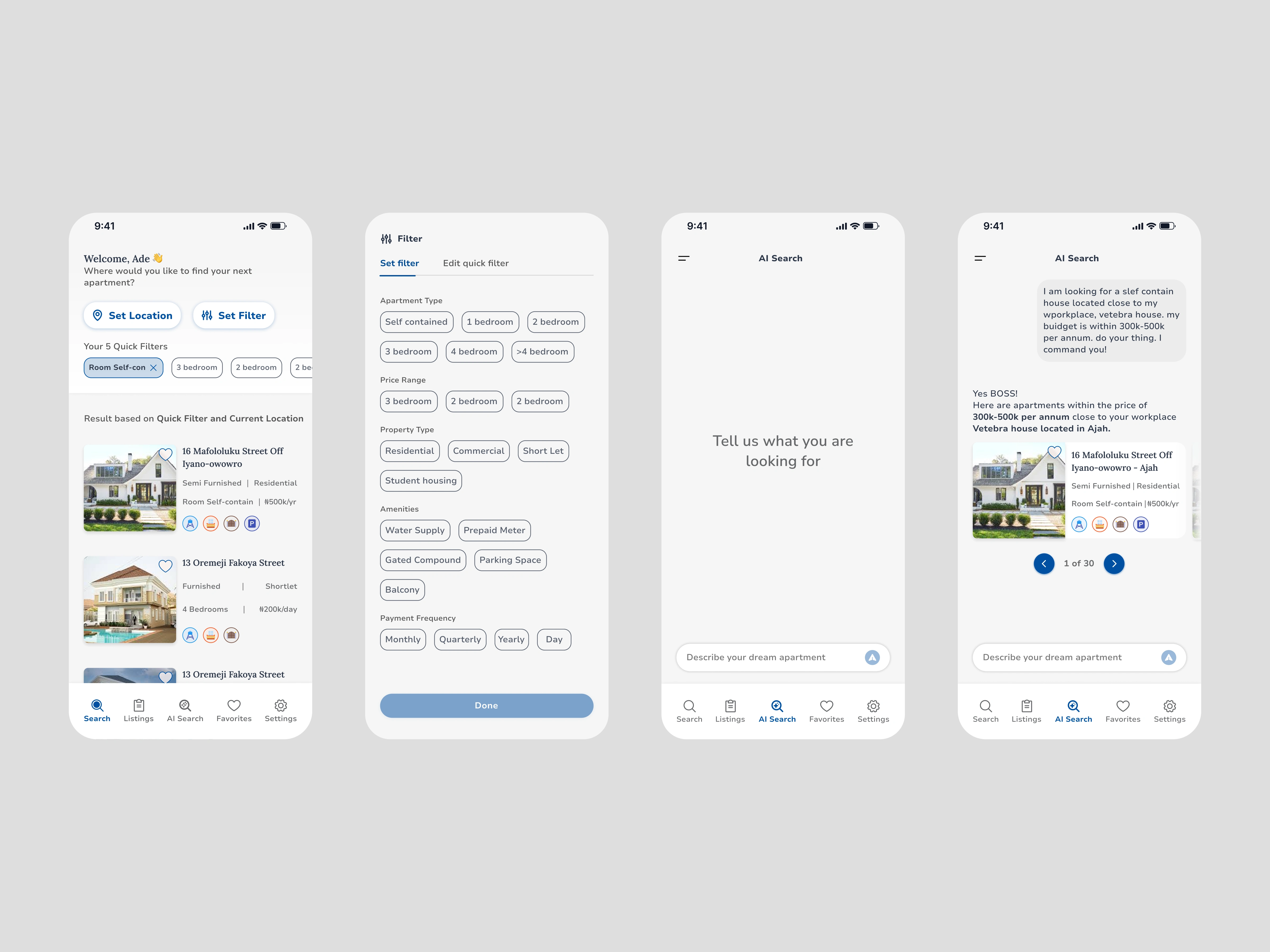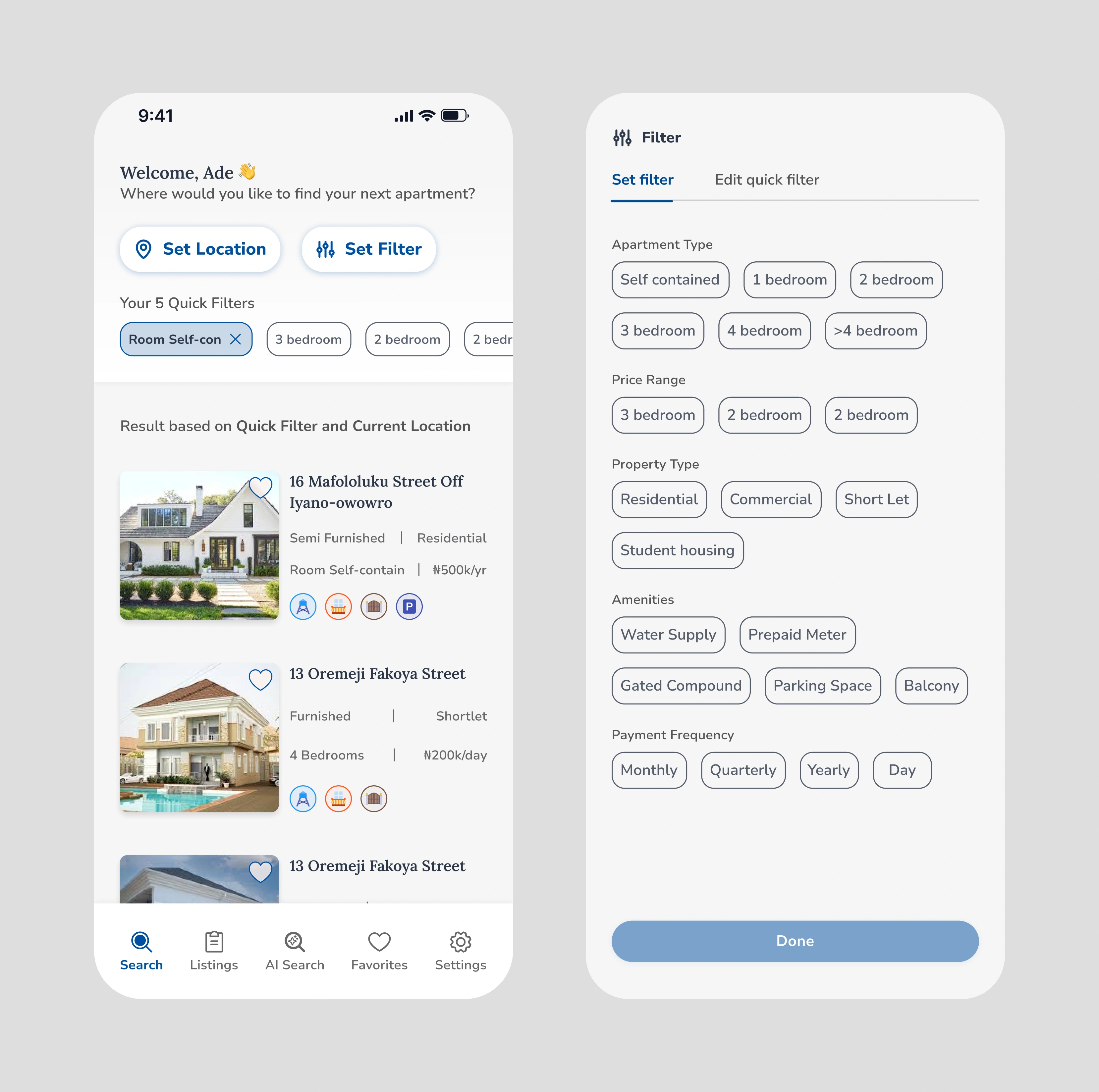 Together, these screens create a seamless home-finding experience. The Home Screen allows users to quickly set their location or apply personalized filters, automatically displaying nearby listings when no location is set. The Filter Screen complements this by offering a simple, intuitive way to refine searches by apartment type, price range, amenities, and payment frequency — ensuring users find exactly what they’re looking for with ease.