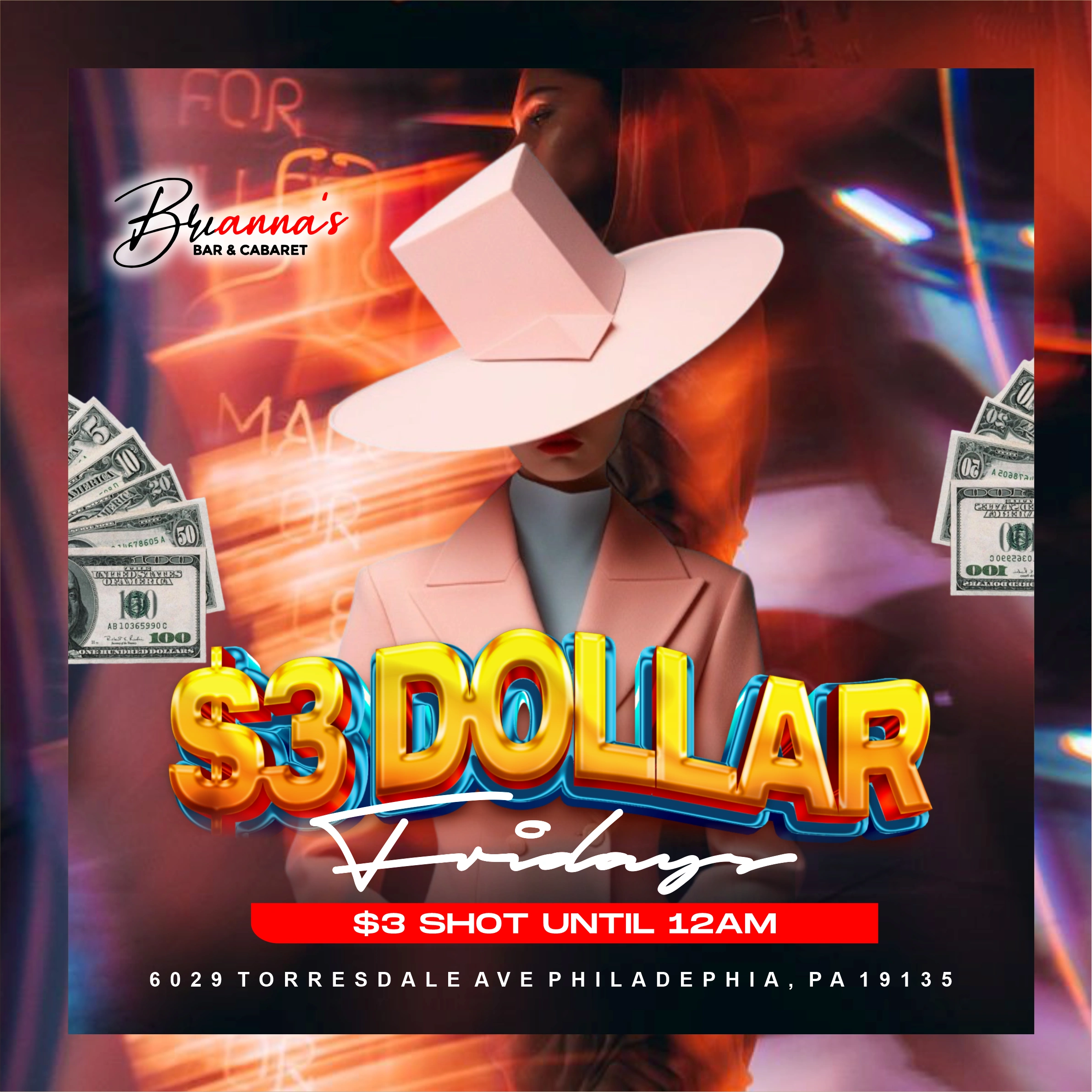 A promotional flyer for an event called "$3 Dollar Fridays" at "Brianna's Bar & Cabaret," featuring a stylized image of a woman and text overlay. The overall color scheme is warm, dominated by reds, oranges, and pinks, suggesting a lively, night-time atmosphere.