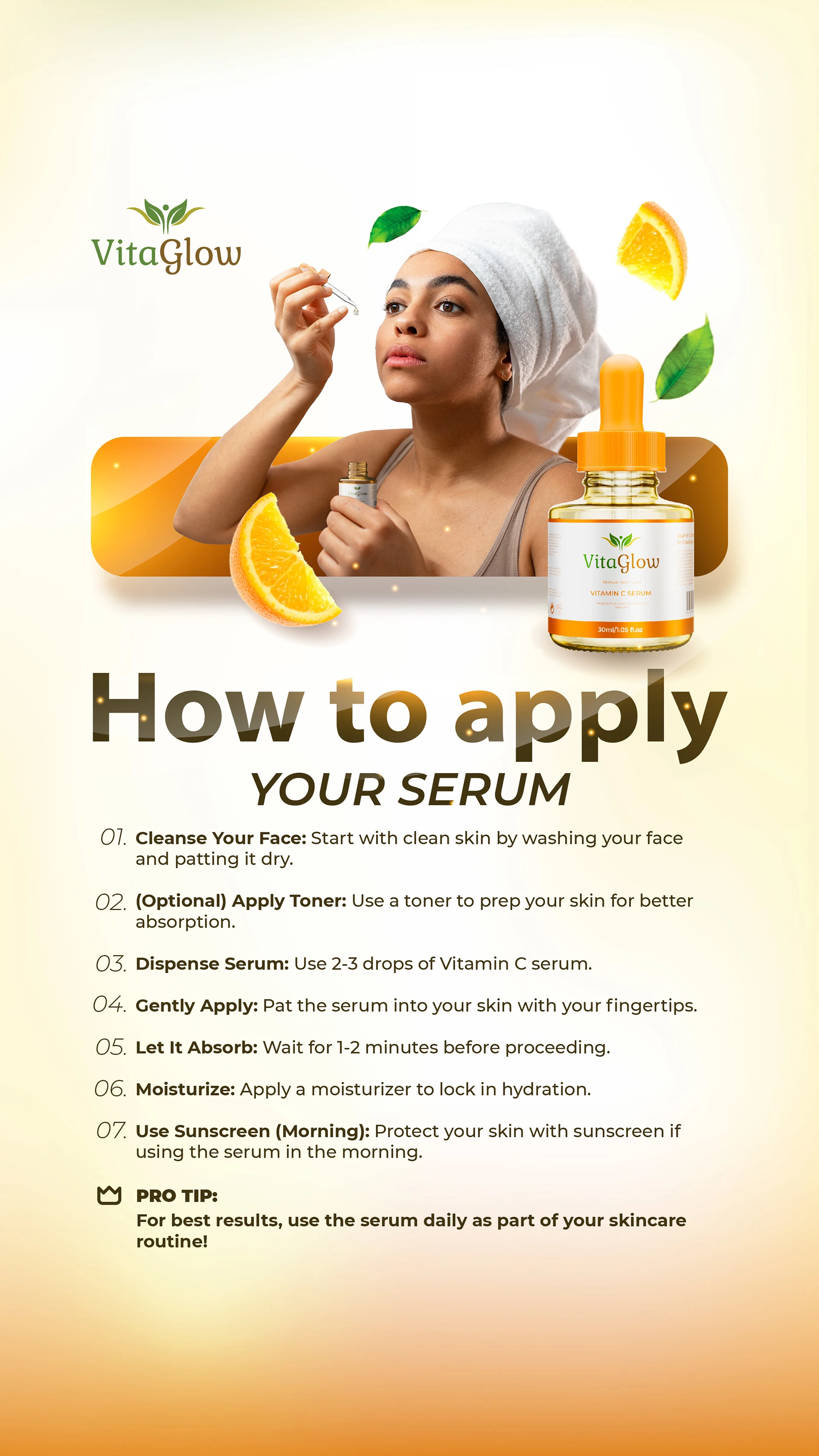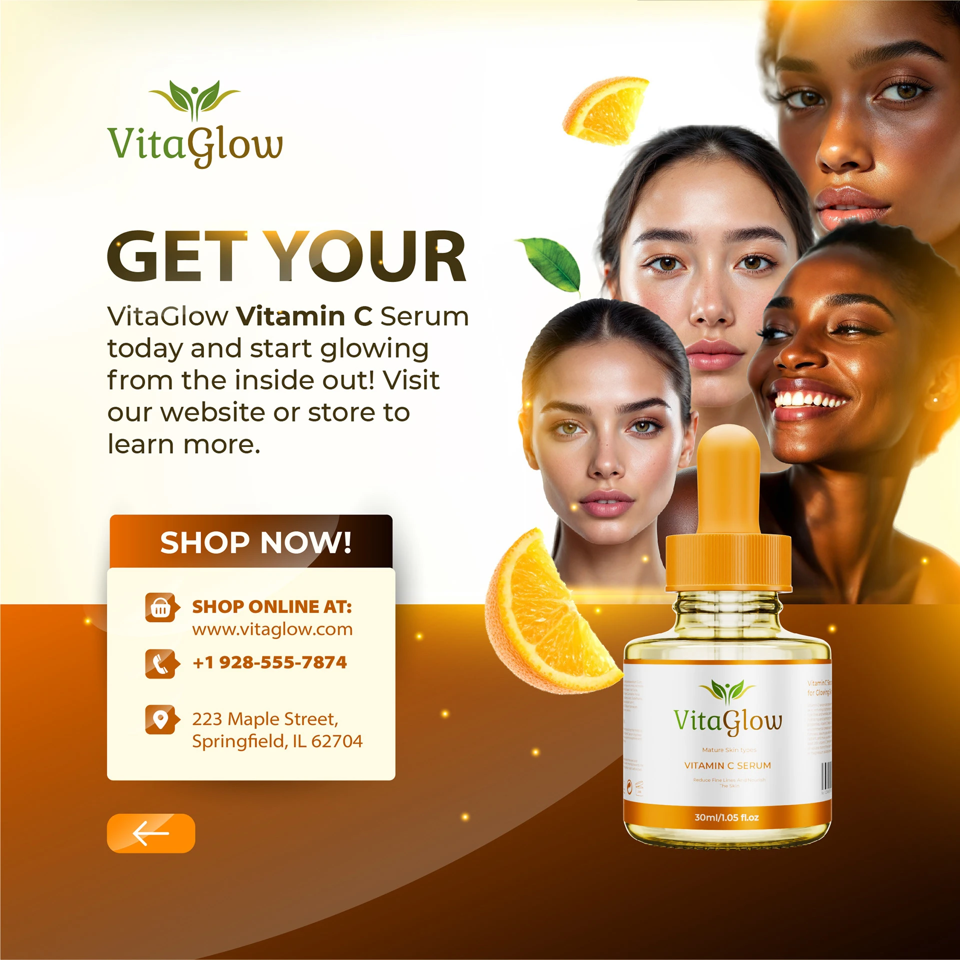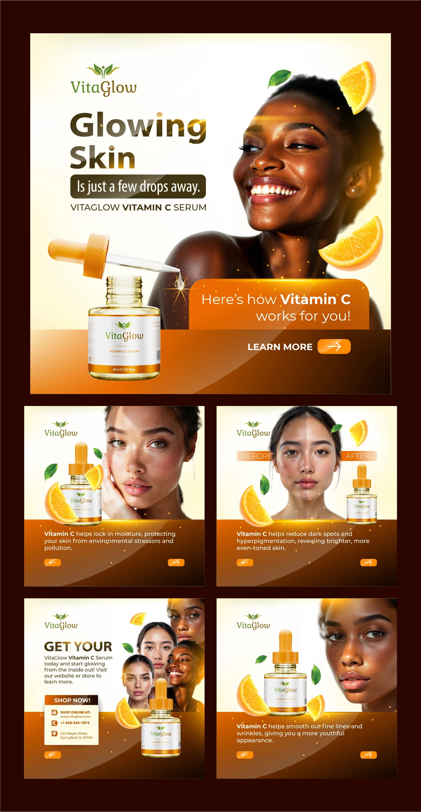 I created a series of eye-catching and effective posters for VitaGlow, a skincare brand, to support their marketing goals around the launch and promotion of their Vitamin C Serum. The visuals were crafted to reflect the brand’s clean, rejuvenating, and aspirational tone, targeting health-conscious women aged 20–45. New Product Launch: Designed a Facebook post showcasing the serum bottle against a soft-focus background with fresh citrus slices, highlighting the tagline, “Brighten your skin with the power of Vitamin C.” Benefits Carousel: Created an Instagram carousel that educates viewers about the serum’s benefits—brightening, smoothing, and rejuvenating skin—with clean visuals and concise copy on each slide. Testimonial Post: Developed a warm and authentic Instagram post featuring a glowing model with an overlay of a heartfelt customer review. Usage Tip Story: Designed a light and instructional Instagram Story with visuals and text showing how to apply the serum effectively.